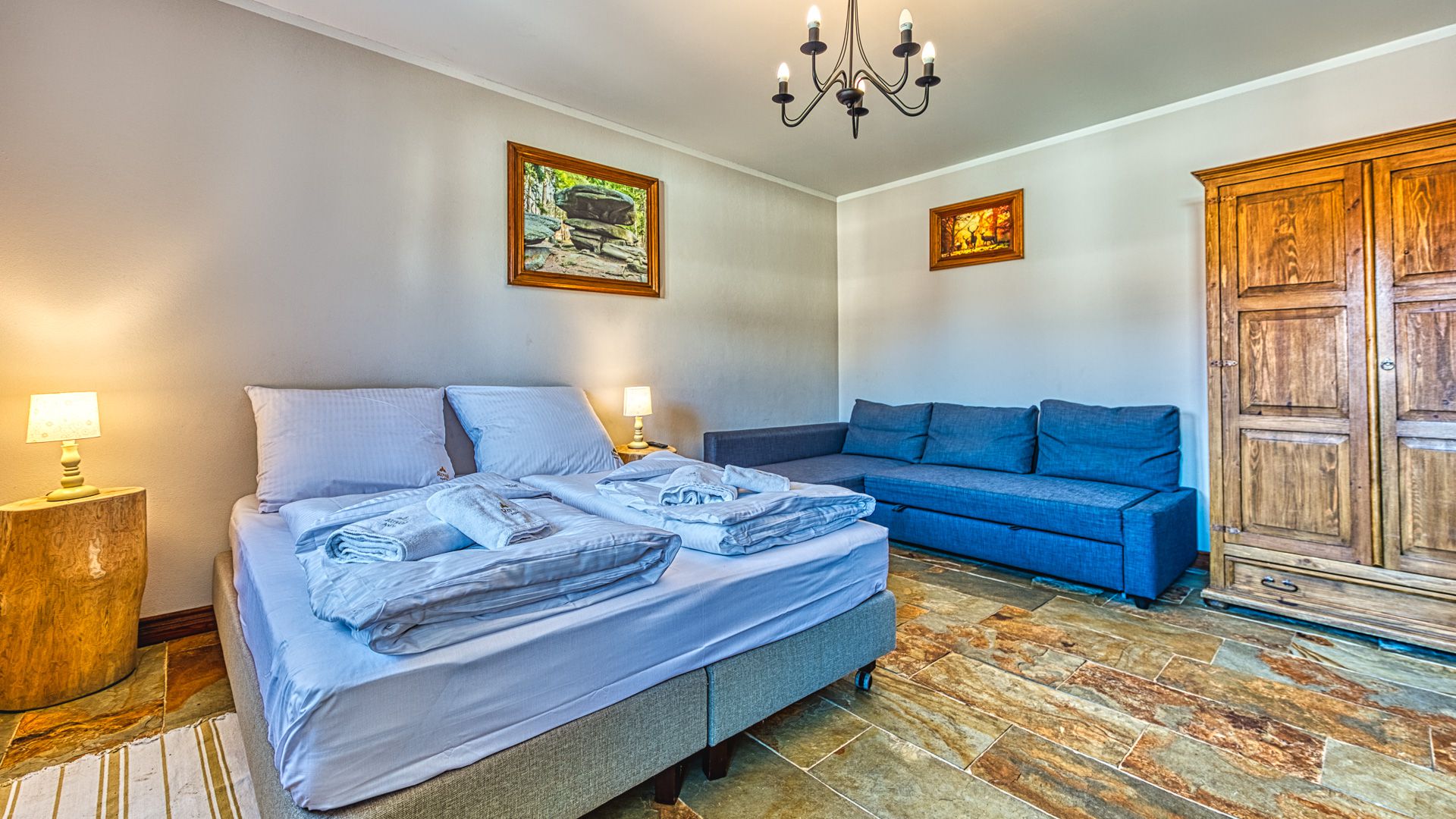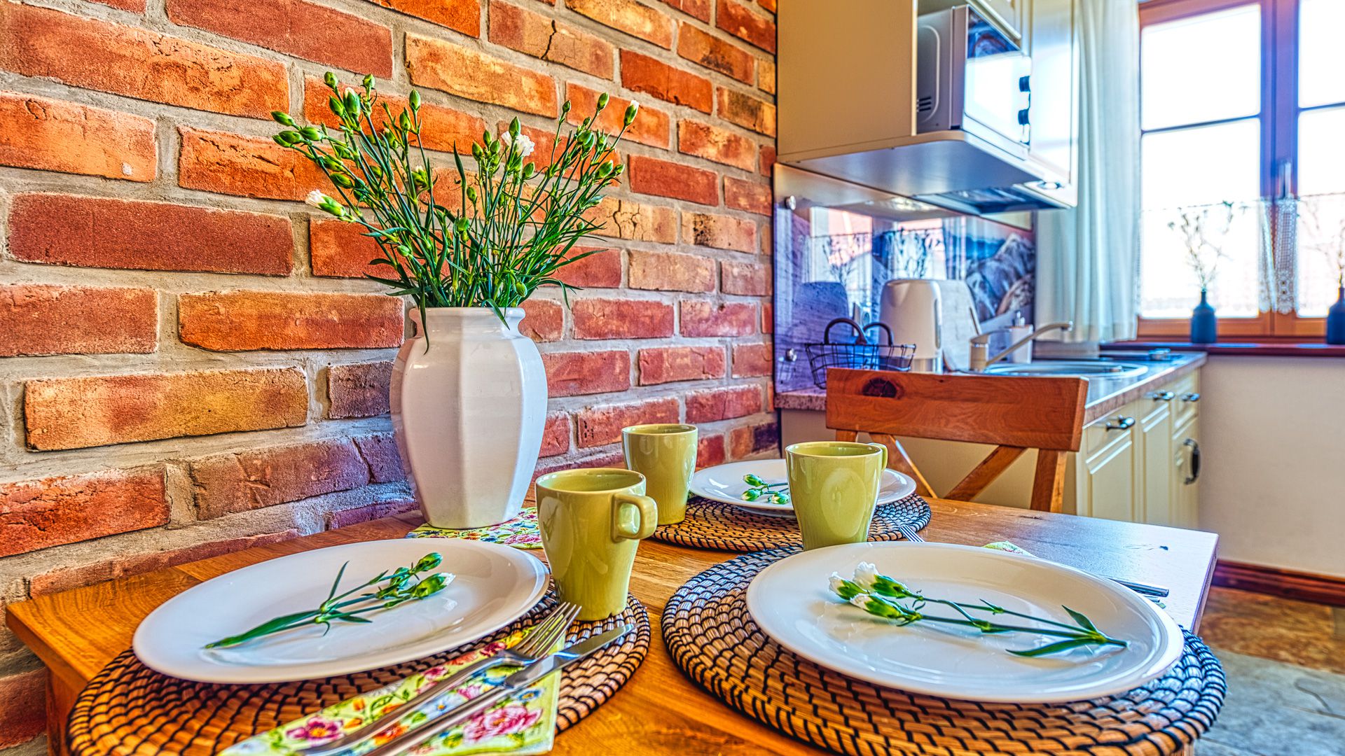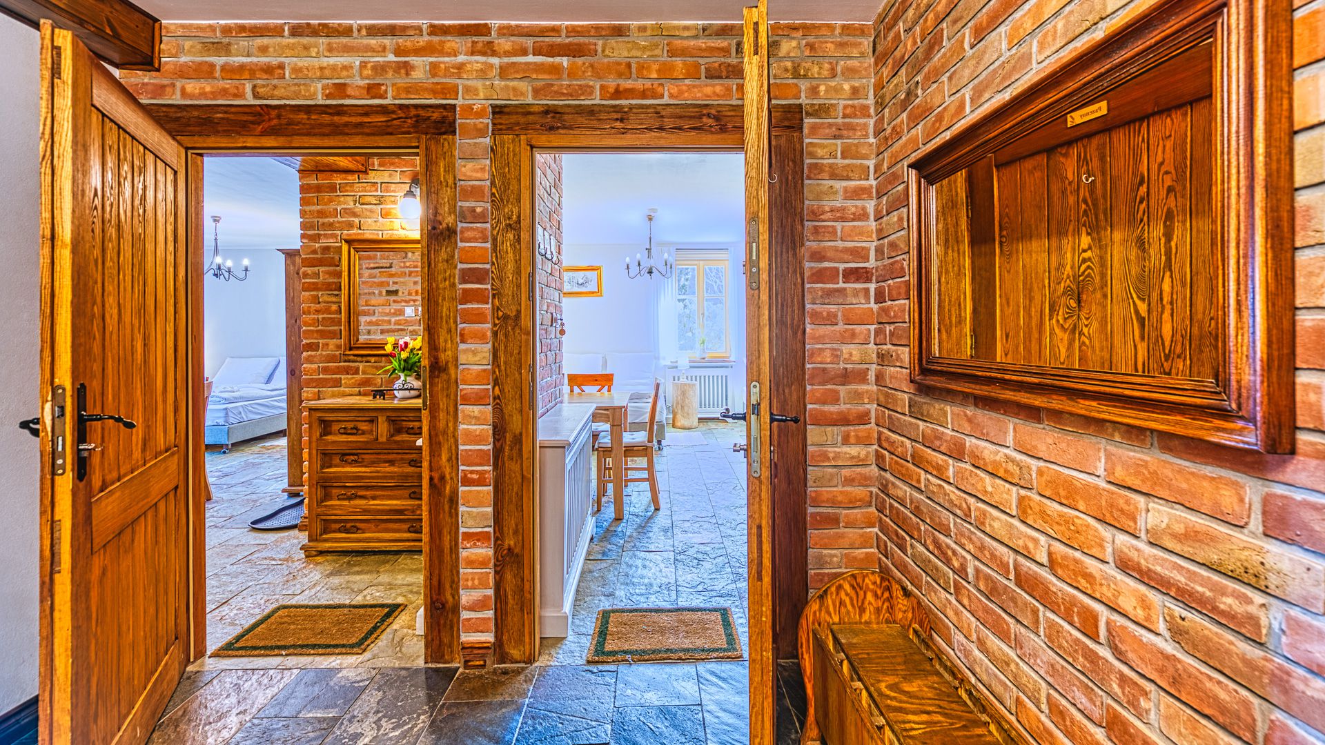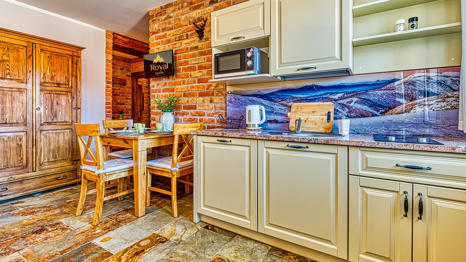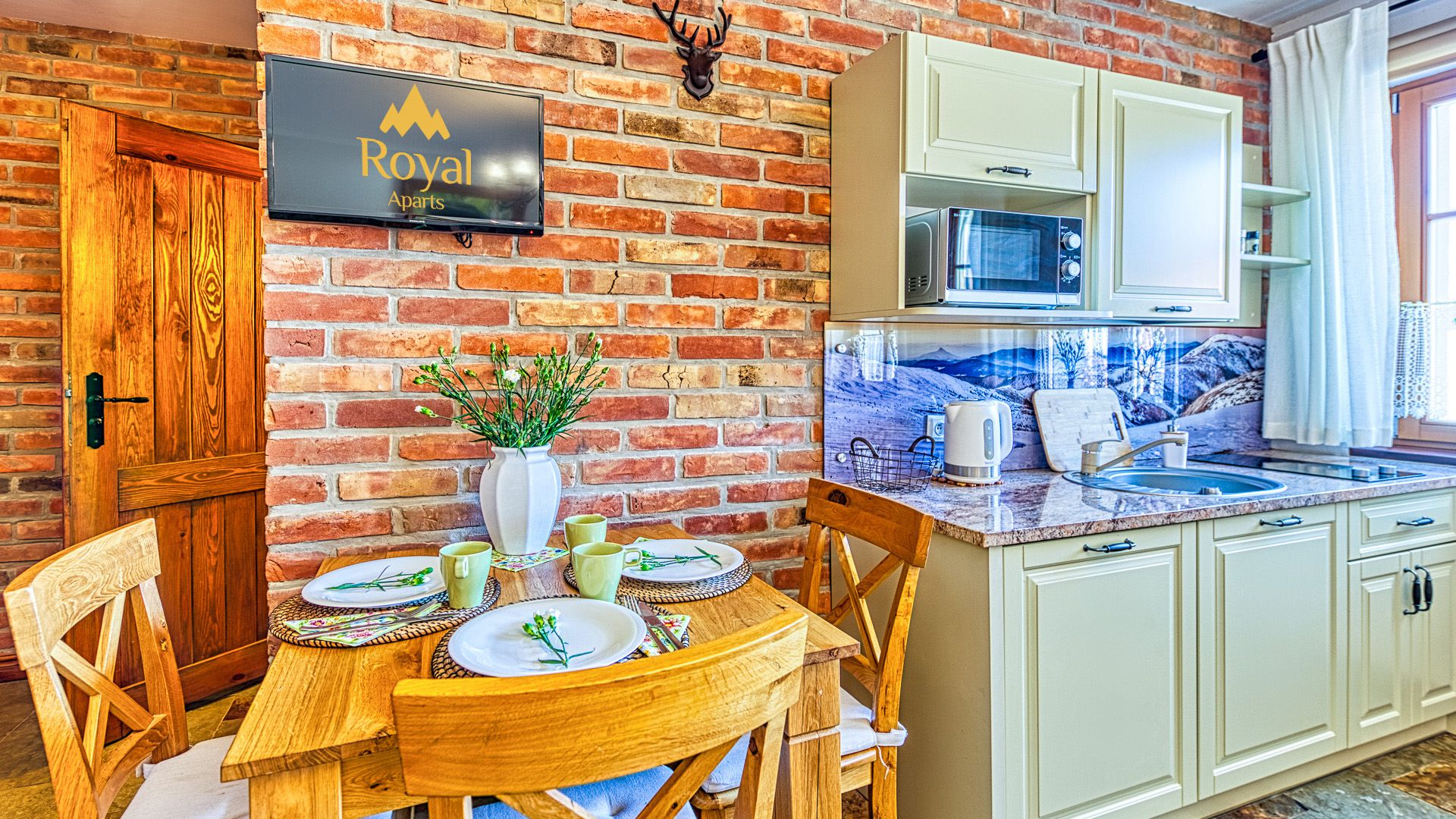 W prezentowanym apartamencie część dzienna połączona jest z sypialnią. W lokalu są dwa pojedyncze łóżka z możliwością ich złączenia (zależnie od wymagań gości) oraz rozkładana sofa. W części jadalnej stoi stół z krzesłami. Apartament posiada liczne udogodnienia. Są to m.in.: szafa/garderoba, telewizor z płaskim ekranem, zestaw do przygotowywania kawy i herbaty, ręczniki, pościel, a ponadto aneks kuchenny, kuchenka mikrofalowa, lodówka, czajnik elektryczny, przybory kuchenne. W klimatycznej, ładnie wykończonej łazience znajdziemy prysznic. Dodatkowo zapewniamy bezpłatny internet WiFi. Całość zlokalizowana jest na parterze.