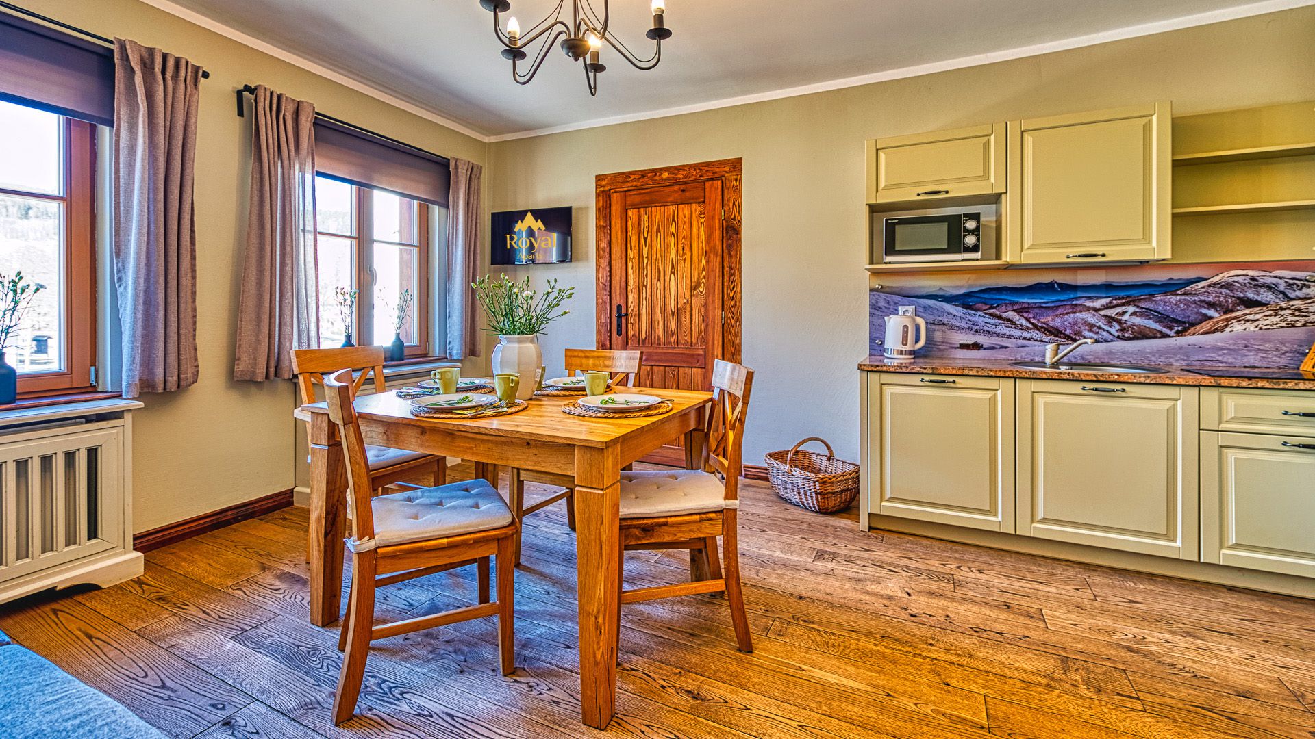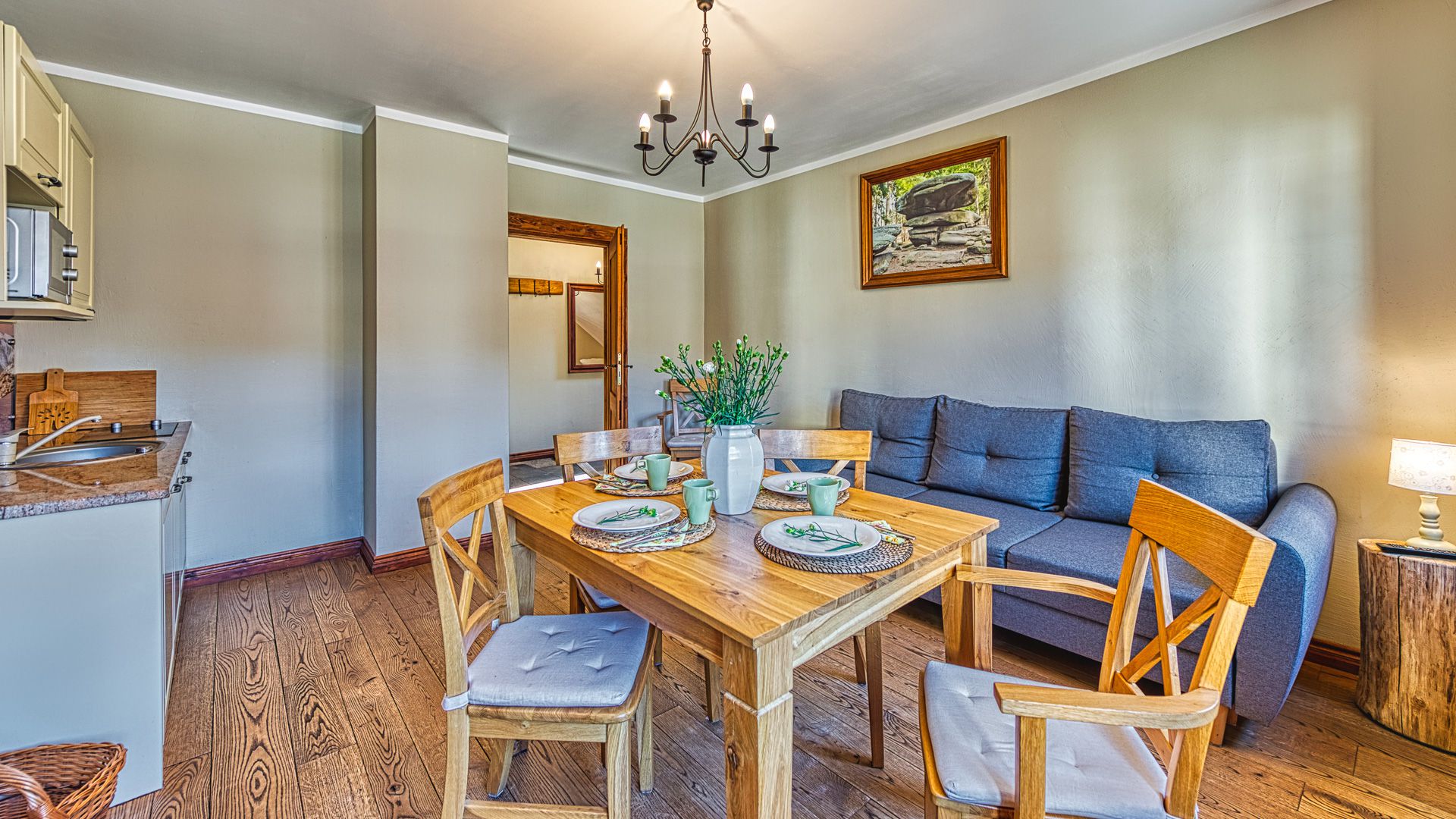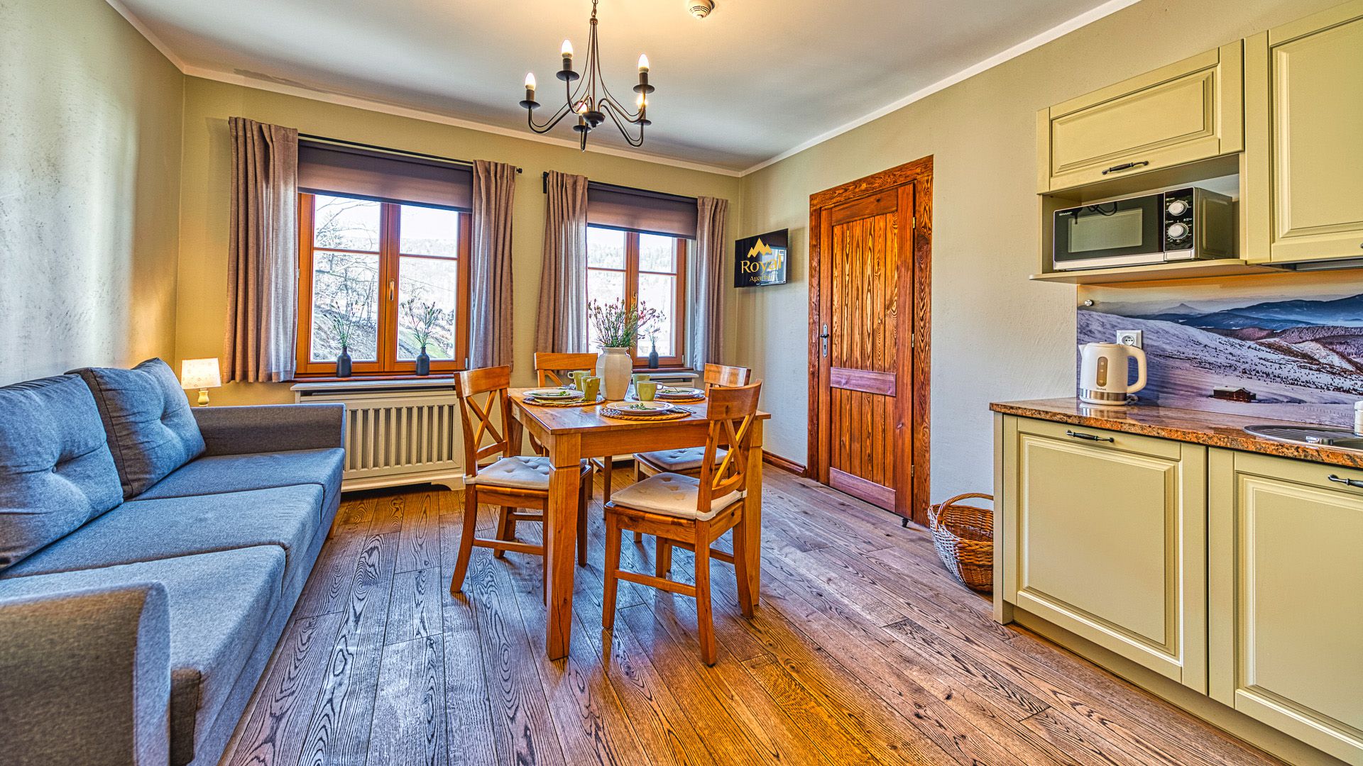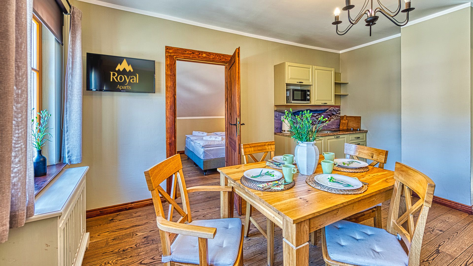Prezentowany apartament posiada dwie sypialnie. Obydwie sypialnie są wyposażone w dwa łóżka pojedyncze, z możliwością złączenia ich. W części dziennej znajduje się telewizor z płaskim ekranem, aneks kuchenny, stół z krzesłami oraz rozkładana sofa. Ponadto część kuchenna zaopatrzona jest w następujące udogodnienia: zestaw do przygotowywania kawy i herbaty, lodówka, kuchenka mikrofalowa, czajnik elektryczny, przybory kuchenne, płyta grzewcza.