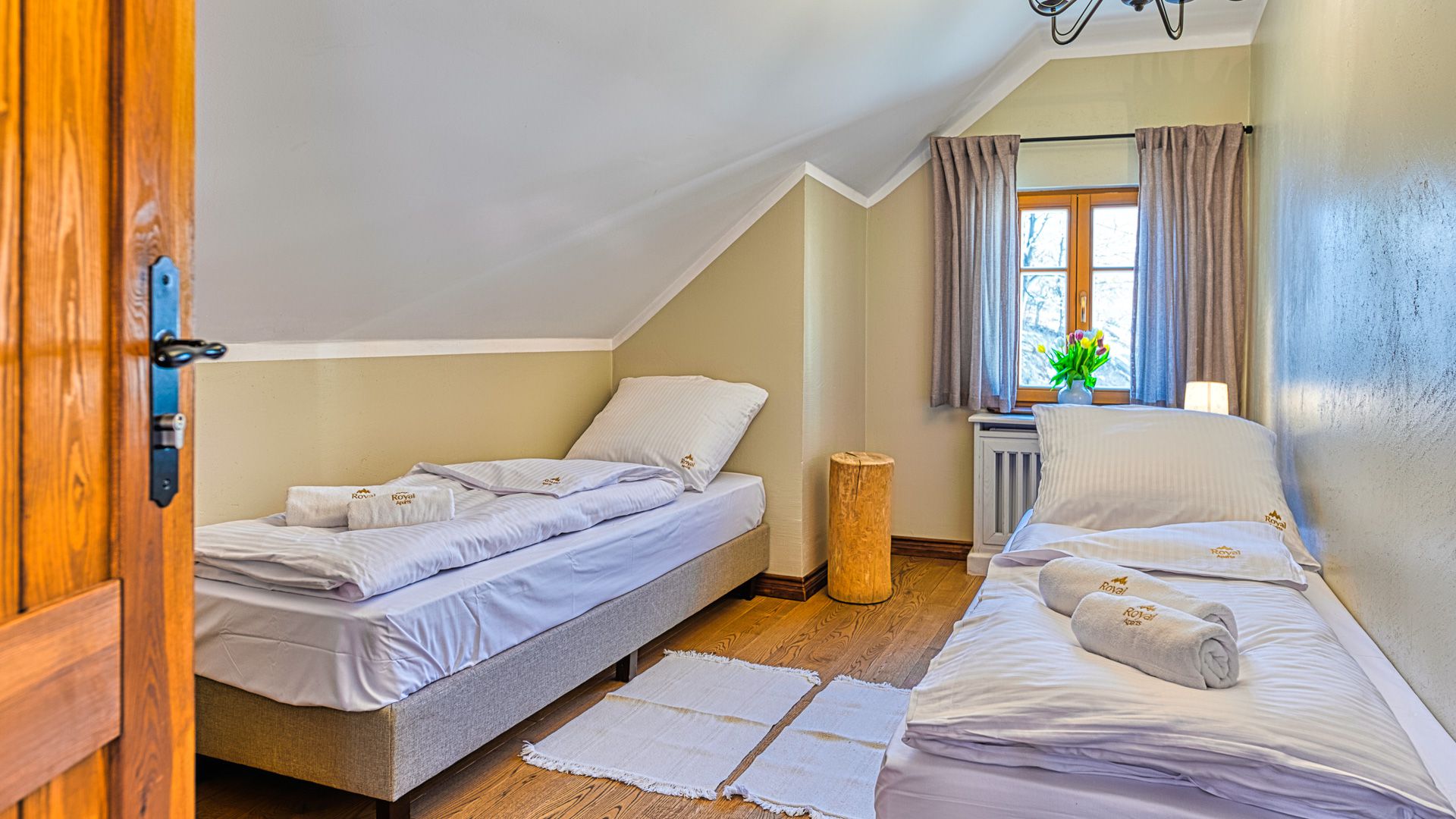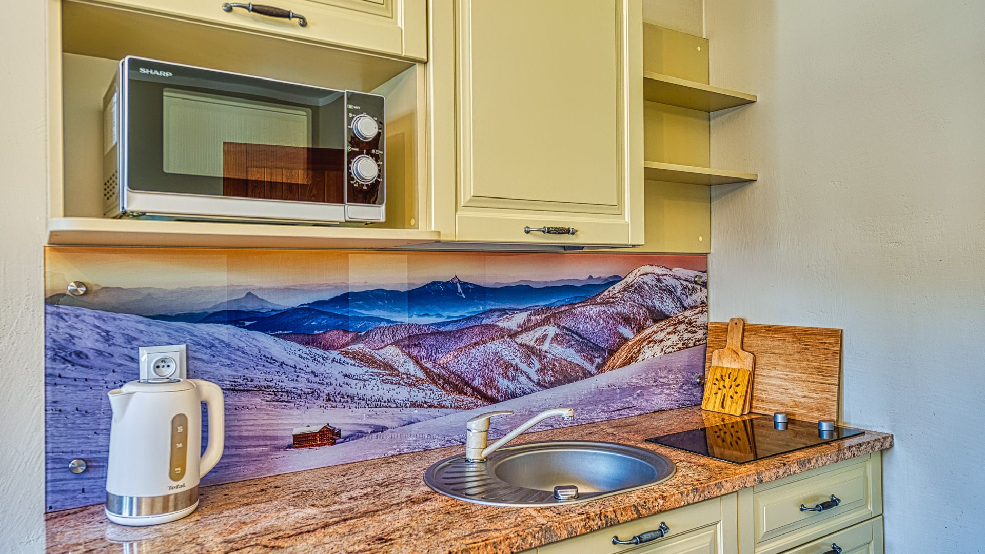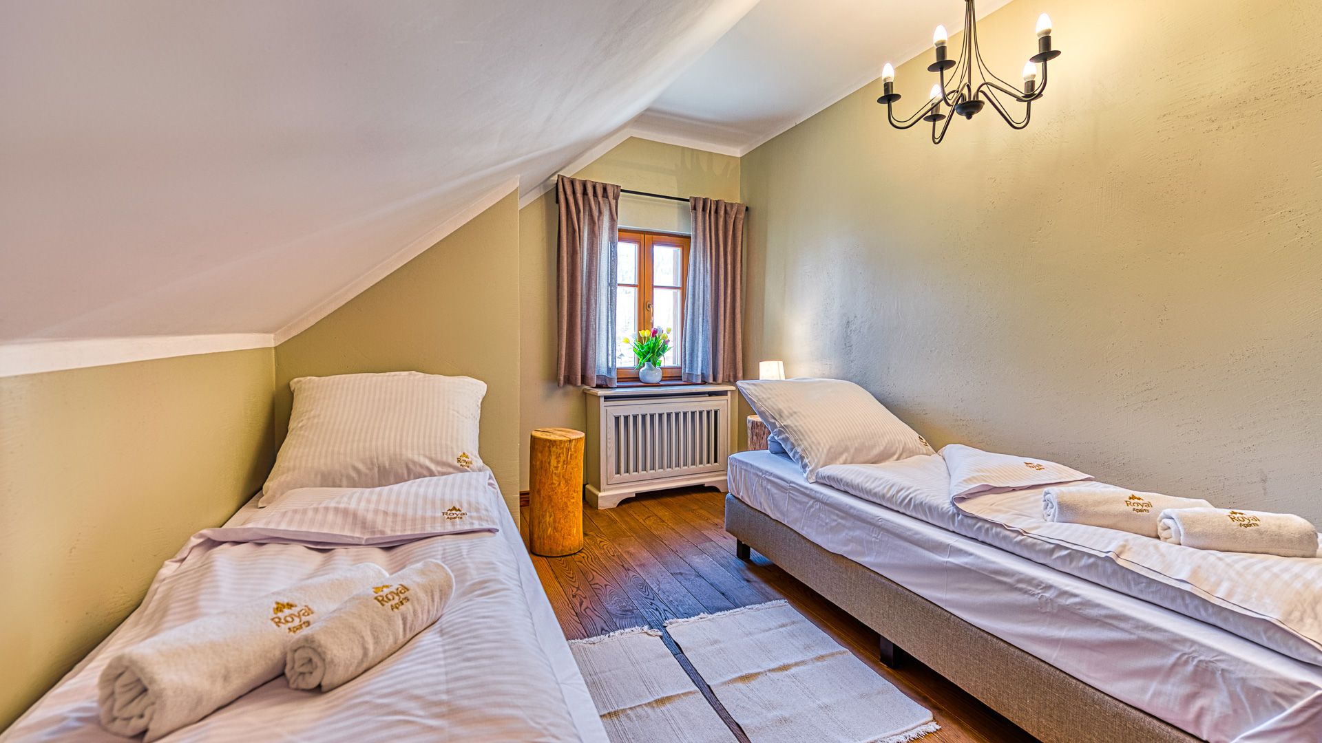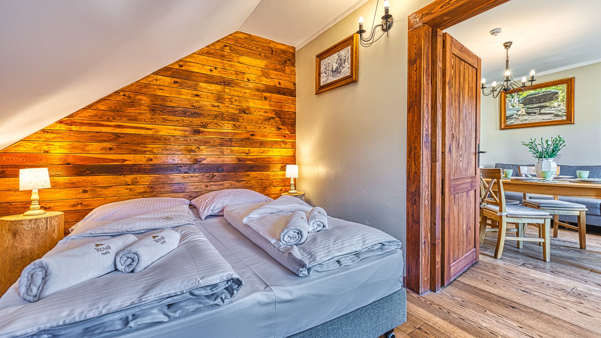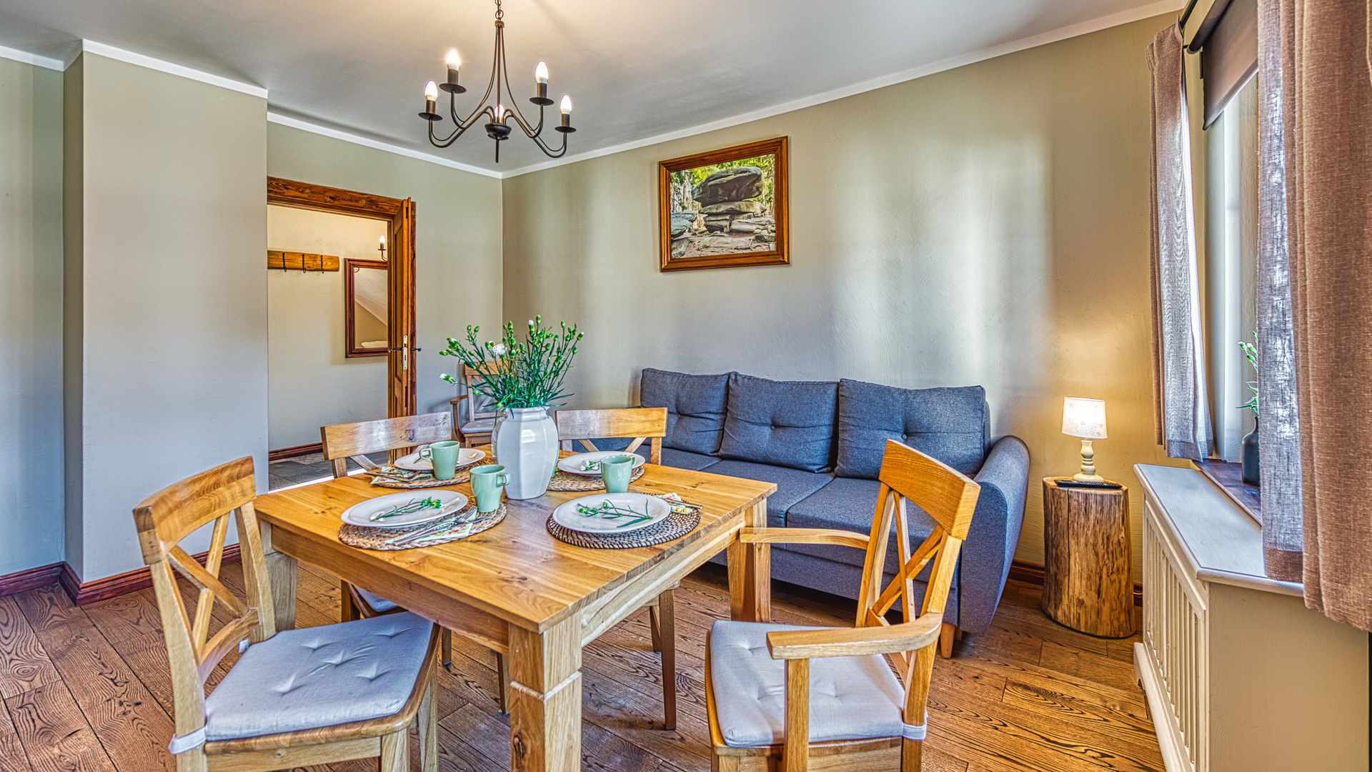 Prezentowany apartament posiada dwie sypialnie. Obydwie sypialnie są wyposażone w dwa łóżka pojedyncze, z możliwością złączenia ich. W części dziennej znajduje się telewizor z płaskim ekranem, aneks kuchenny, stół z krzesłami oraz rozkładana sofa. Ponadto część kuchenna zaopatrzona jest w następujące udogodnienia: zestaw do przygotowywania kawy i herbaty, lodówka, kuchenka mikrofalowa, czajnik elektryczny, przybory kuchenne, płyta grzewcza.