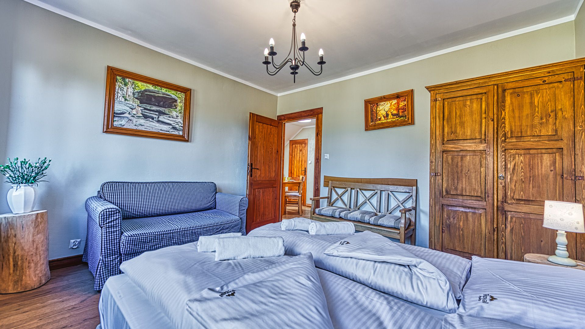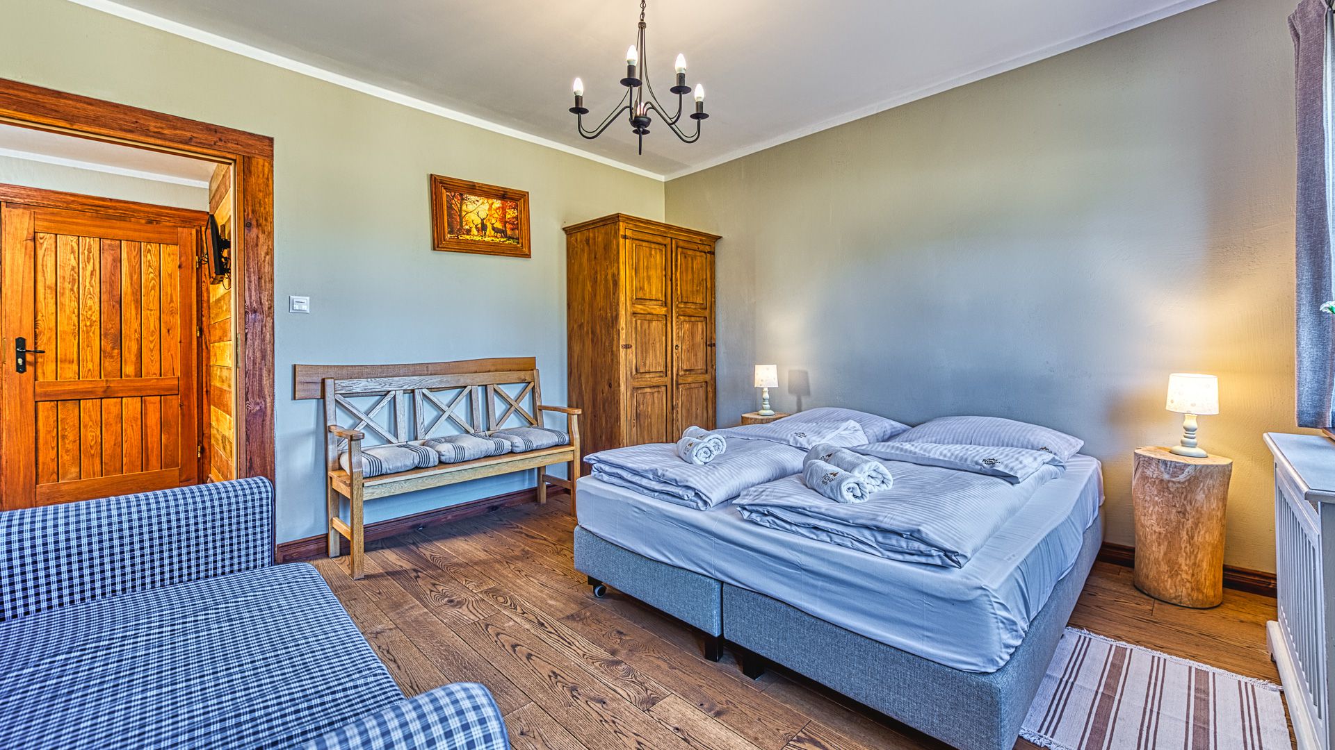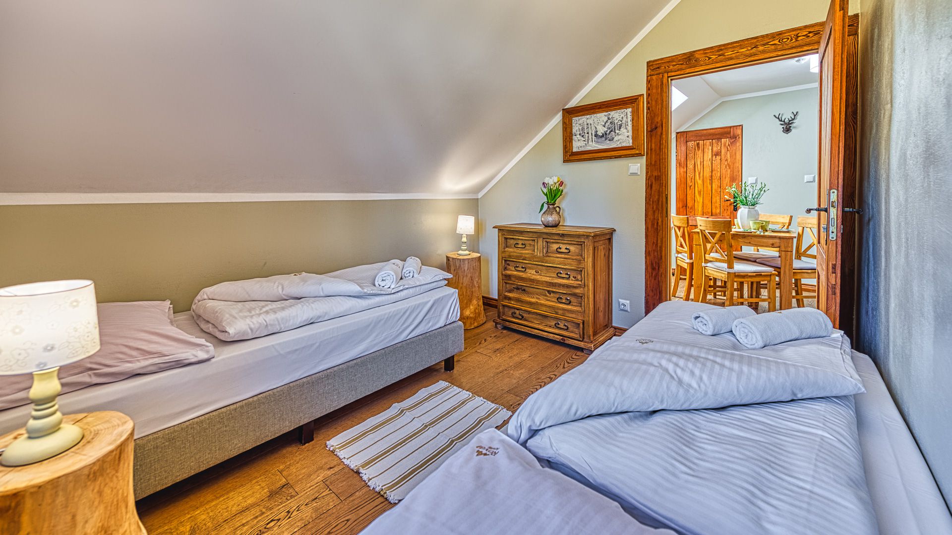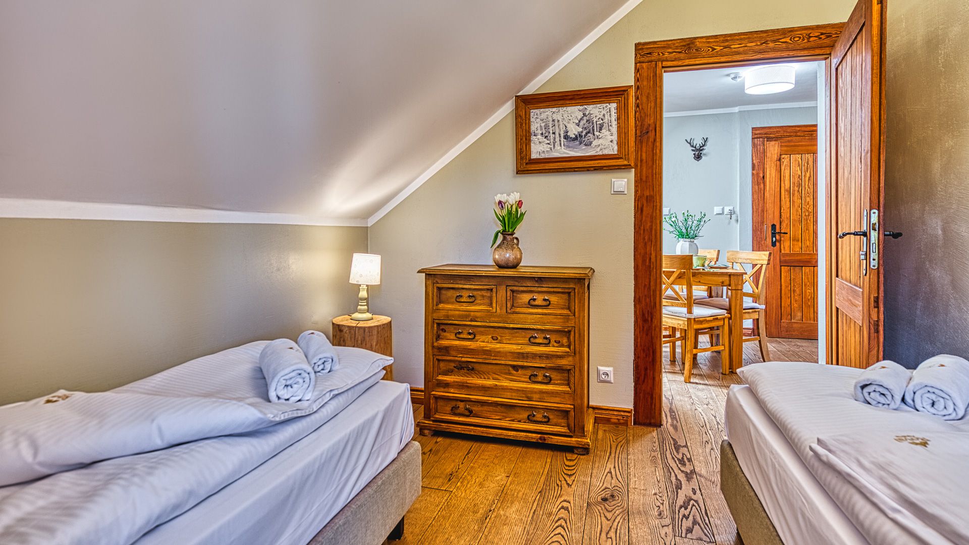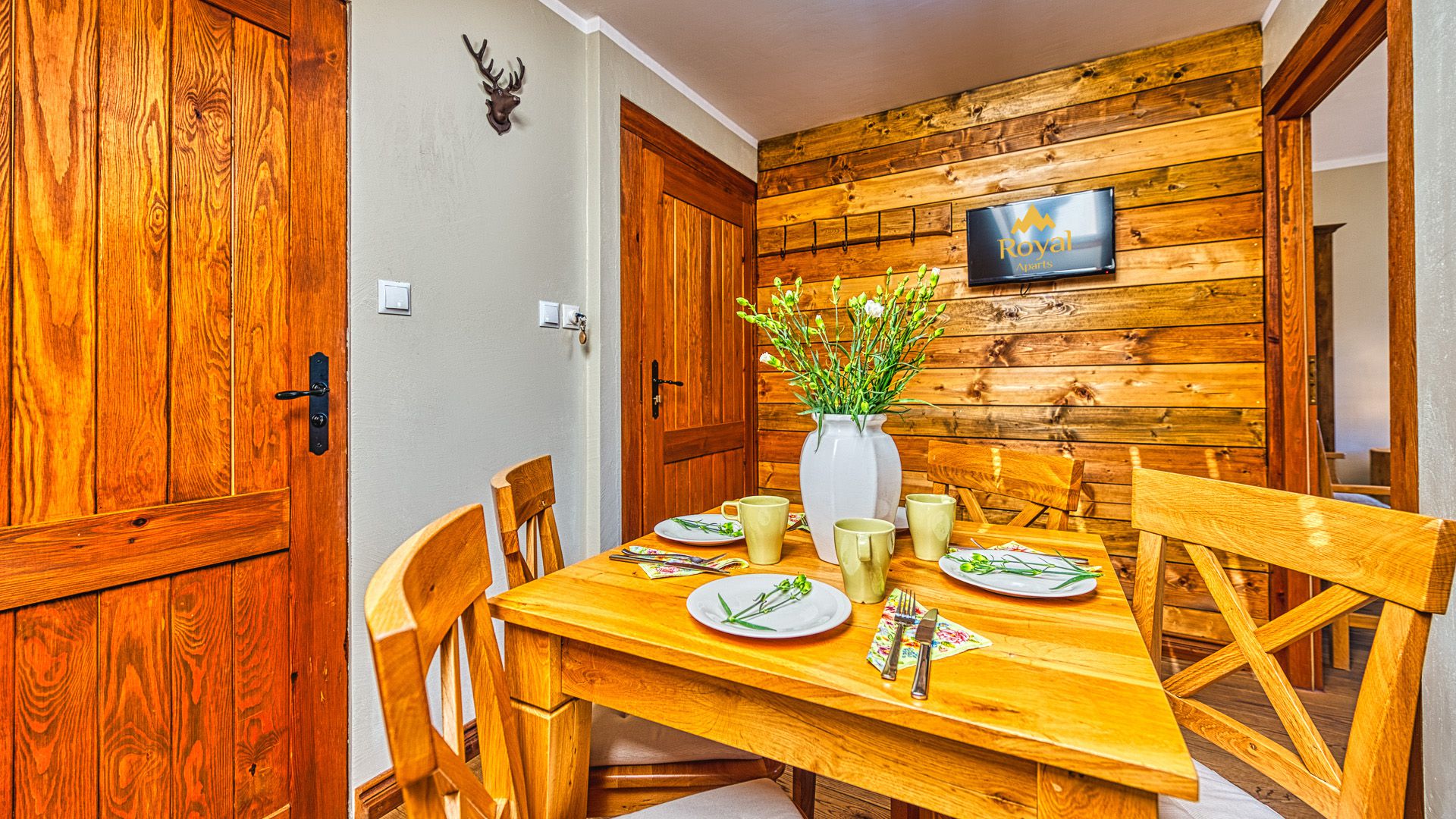 Prezentowany apartament posiada dwie sypialnie. W jednej są dwa łóżka pojedyncze, z możliwością złączenia, a w drugiej trzy łóżka pojedyncze, również z taką opcją. W części dziennej znajduje się telewizor z płaskim ekranem, aneks kuchenny, stół z krzesłami. Ponadto część kuchenna zaopatrzona jest w następujące udogodnienia: zestaw do przygotowywania kawy i herbaty, lodówka, kuchenka mikrofalowa, czajnik elektryczny, przybory kuchenne, płyta grzewcza.