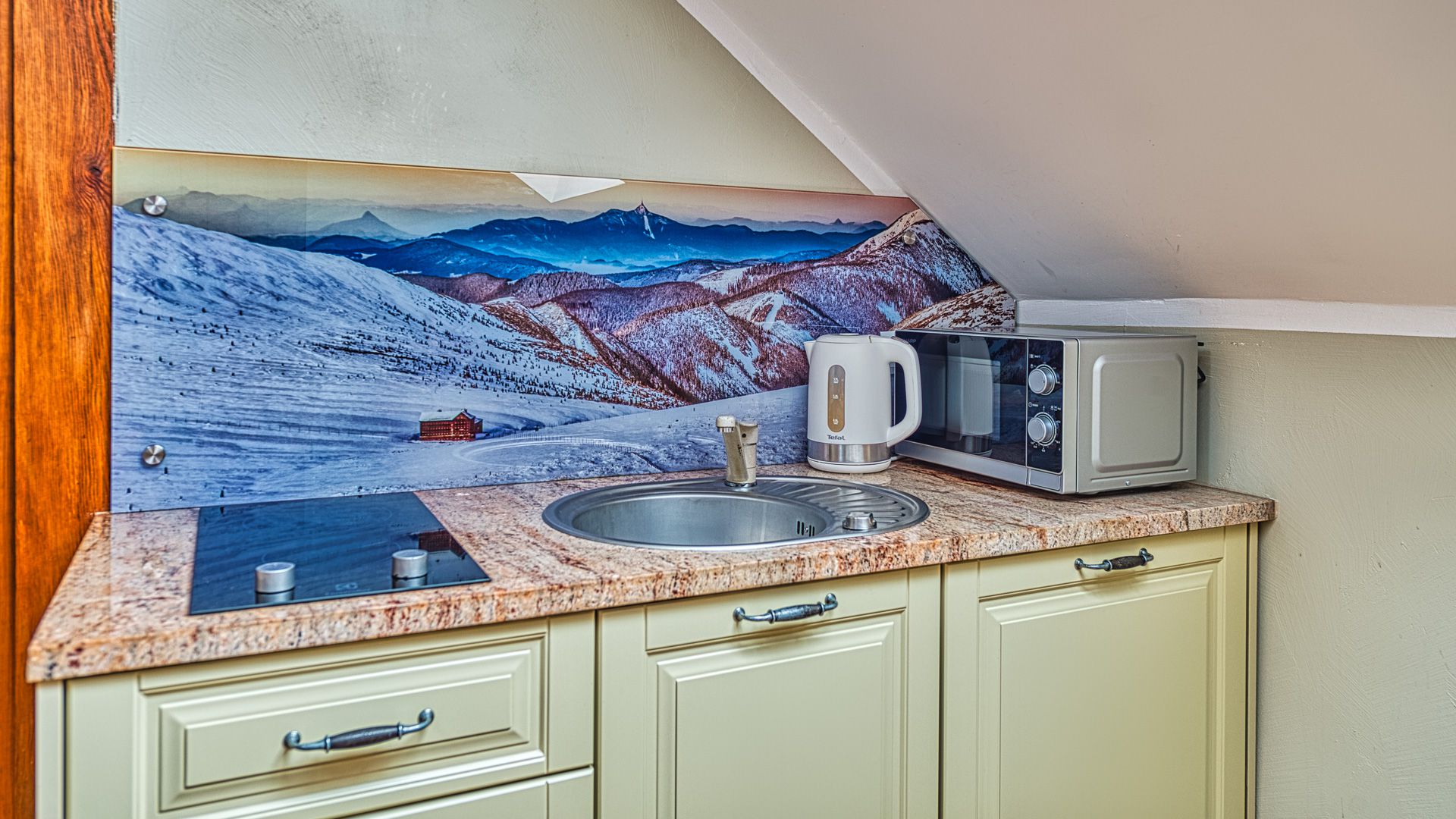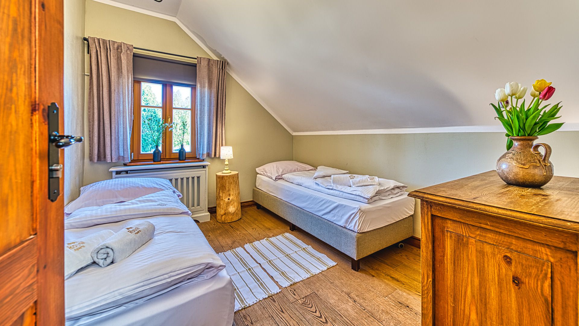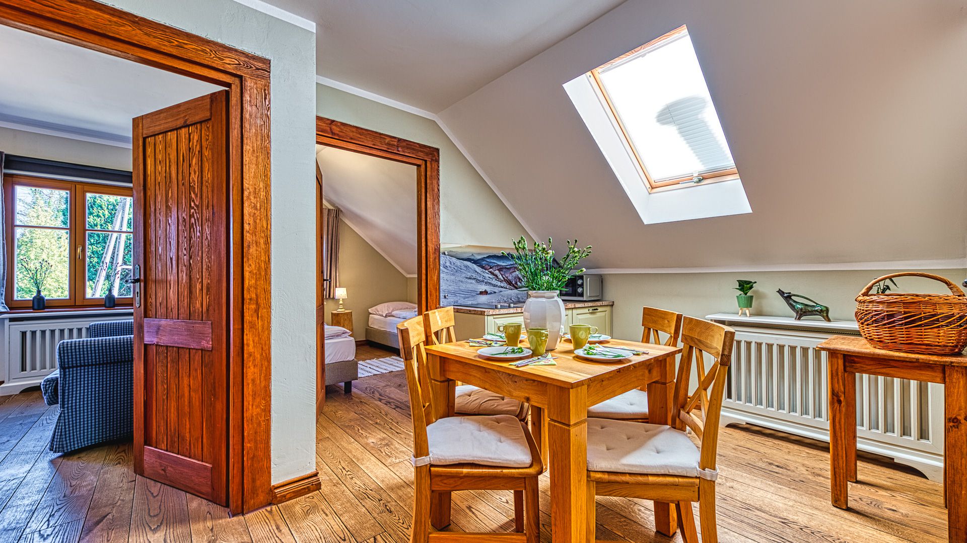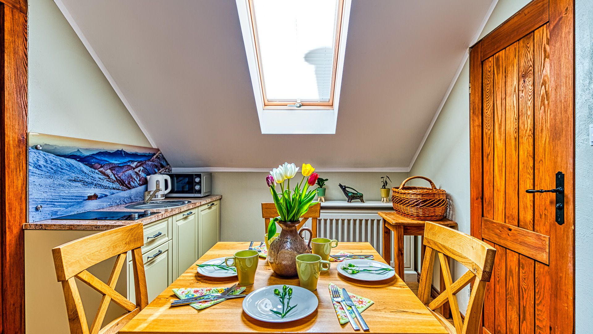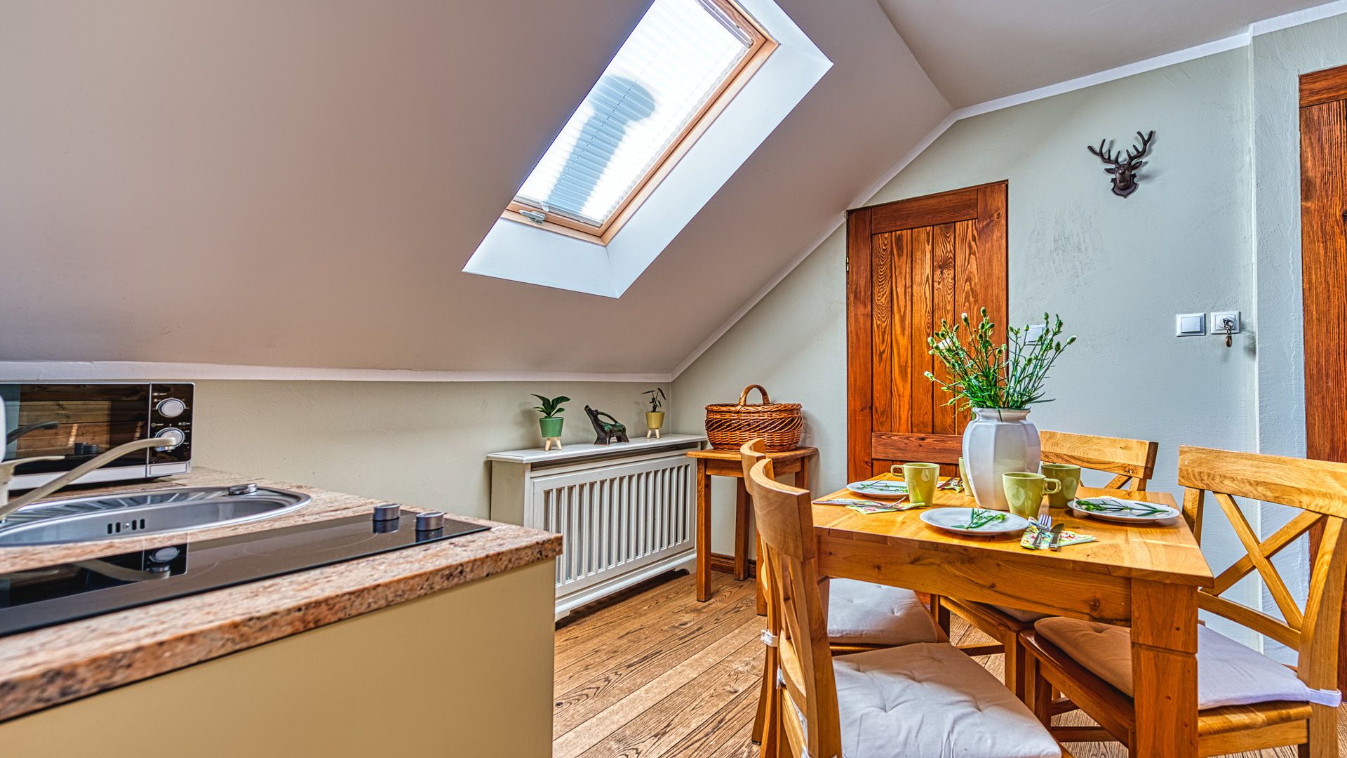 Prezentowany apartament posiada dwie sypialnie. W jednej są dwa łóżka pojedyncze, z możliwością złączenia, a w drugiej trzy łóżka pojedyncze, również z taką opcją. W części dziennej znajduje się telewizor z płaskim ekranem, aneks kuchenny, stół z krzesłami. Ponadto część kuchenna zaopatrzona jest w następujące udogodnienia: zestaw do przygotowywania kawy i herbaty, lodówka, kuchenka mikrofalowa, czajnik elektryczny, przybory kuchenne, płyta grzewcza.