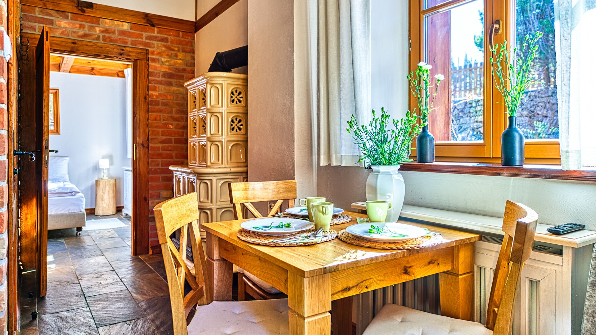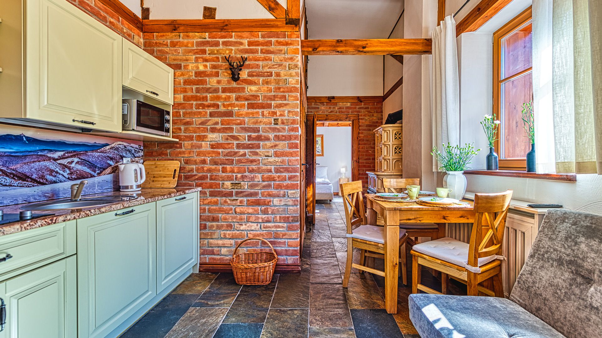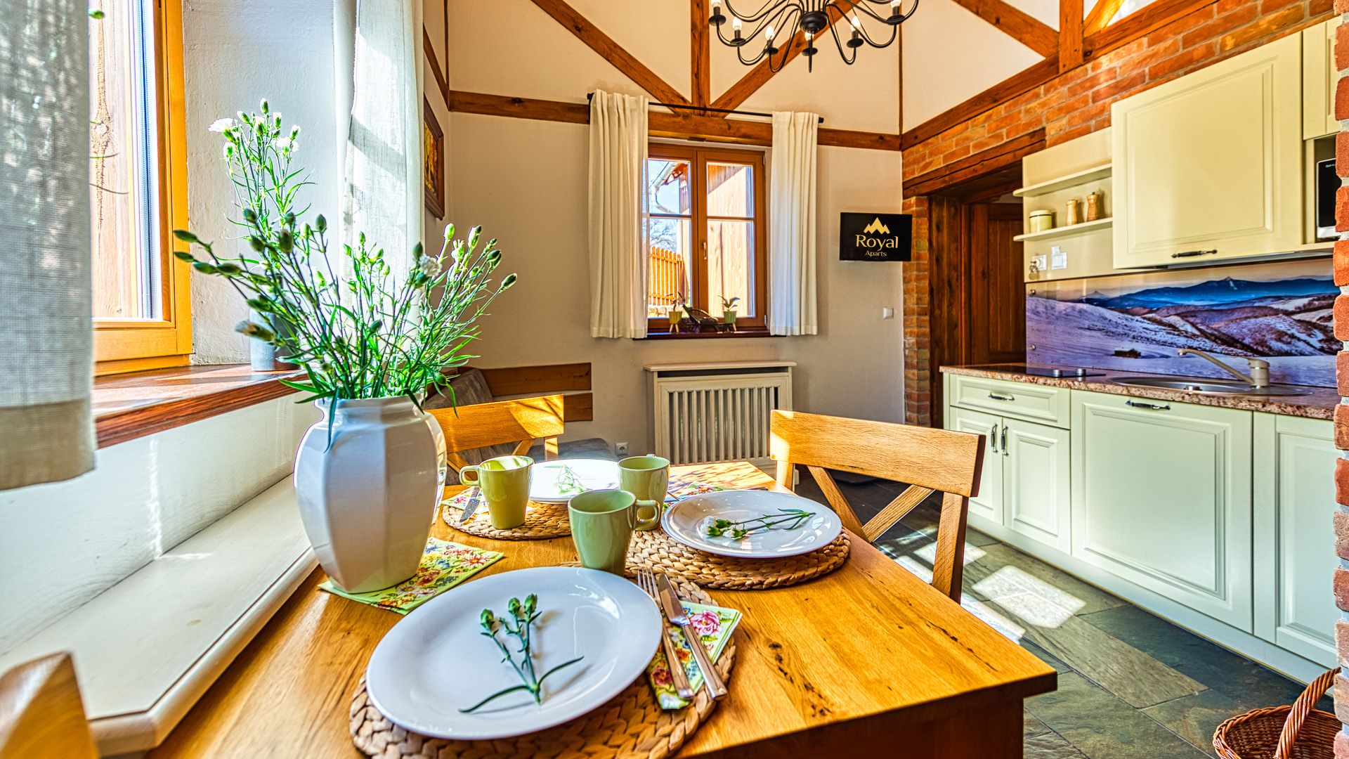Apartament mieści się przy ulicy Waryńskiego 1. Posiada jedną sypialnię, w której są dwa pojedyncze łóżka, z możliwością ich złączenia (zależnie od wymagań gości). W części dziennej znajduje się kominek, telewizor z płaskim ekranem, stół i krzesła oraz rozkładana sofa. Ponadto apartament wyposażony jest w takie udogodnienia jak: ogrzewanie, kamienna podłoga, szafa/garderoba. Ciekawie wygląda wykończenie łazienki, w której mieści się prysznic. Dodatkowo w części dziennej znajduje się aneks kuchenny z płytą grzewczą, a także lodówka, mikrofalówka, czajnik elektryczny, przybory kuchenne czy zestaw do przygotowywania kawy i herbaty. Zapewniamy też ręczniki, pościel i dostęp do bezpłatnego WiFi.