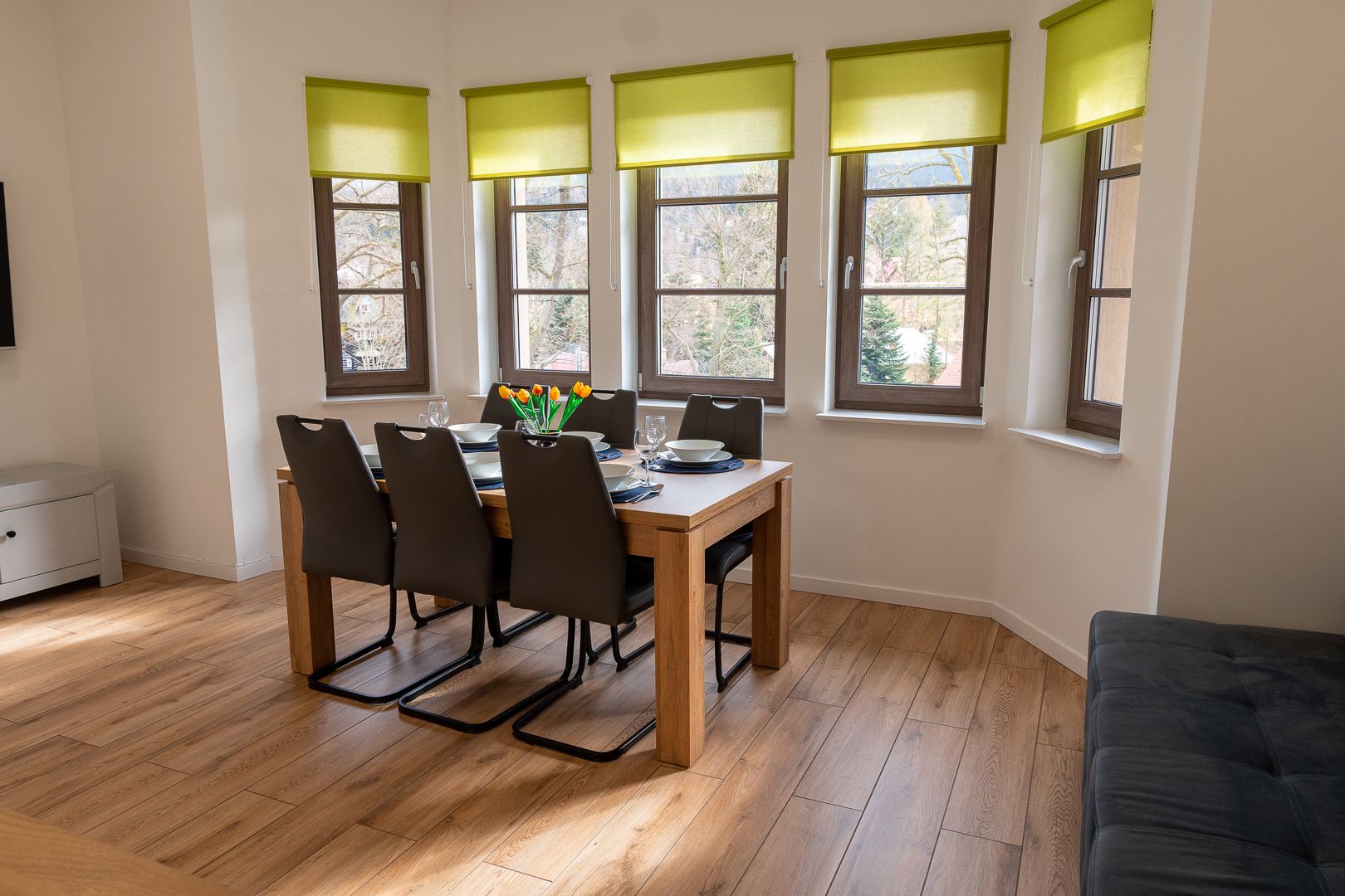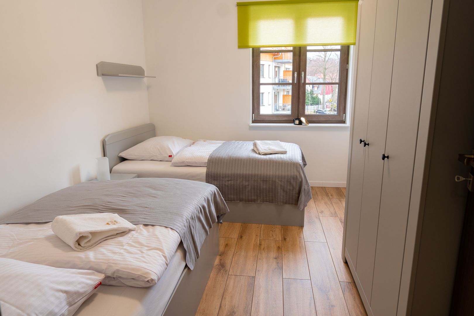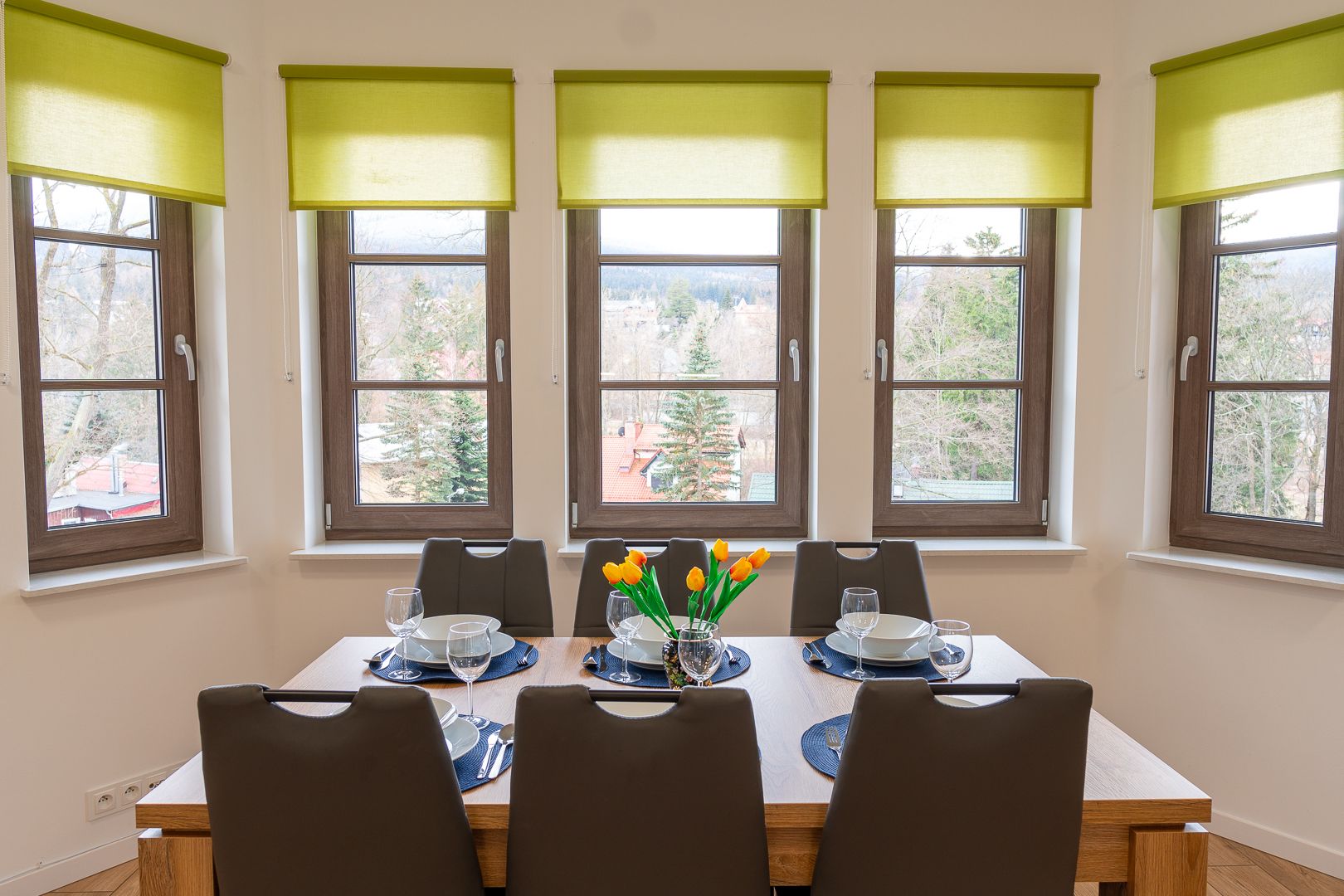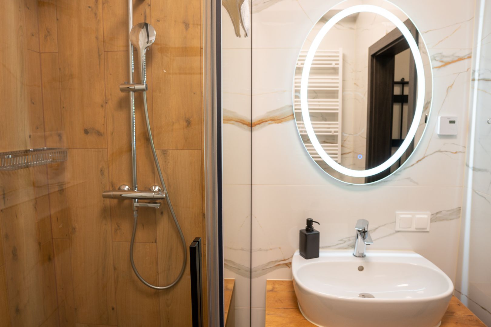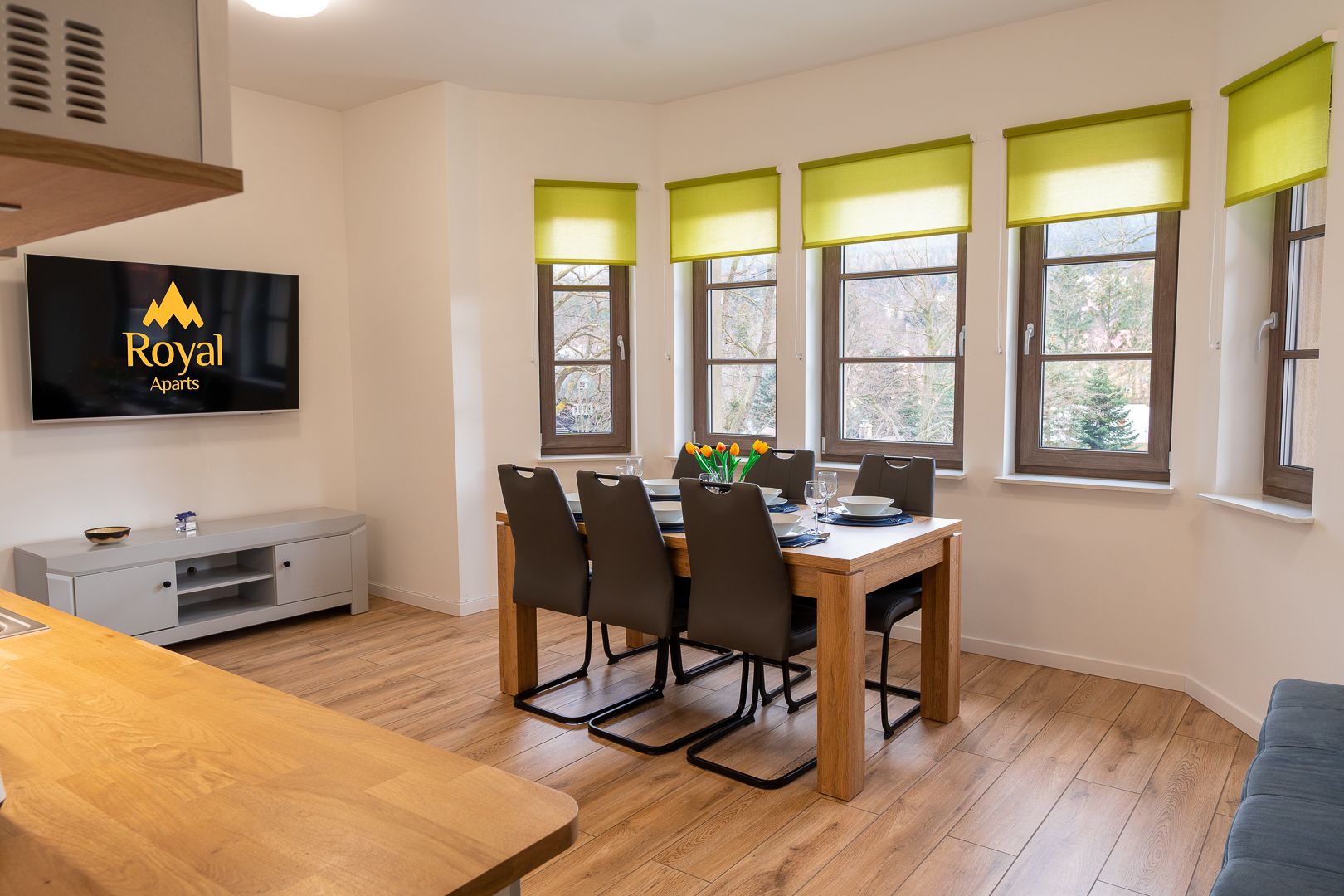 Prezentowany apartament jest częścią prestiżowego kompleksu Stone Hill w samym centrum Szklarskiej Poręby. To nowoczesny, w pełni wyposażony lokal o powierzchni 45m^2, który zapewni komfortowy pobyt nawet 5 osobom. Składa się z sypialni, w której stoją pojedyncze i podwójne łóżko, części wypoczynkowej z kanapą, połączonej z aneksem kuchennym i jadalnią oraz łazienki z prysznicem i pralką.