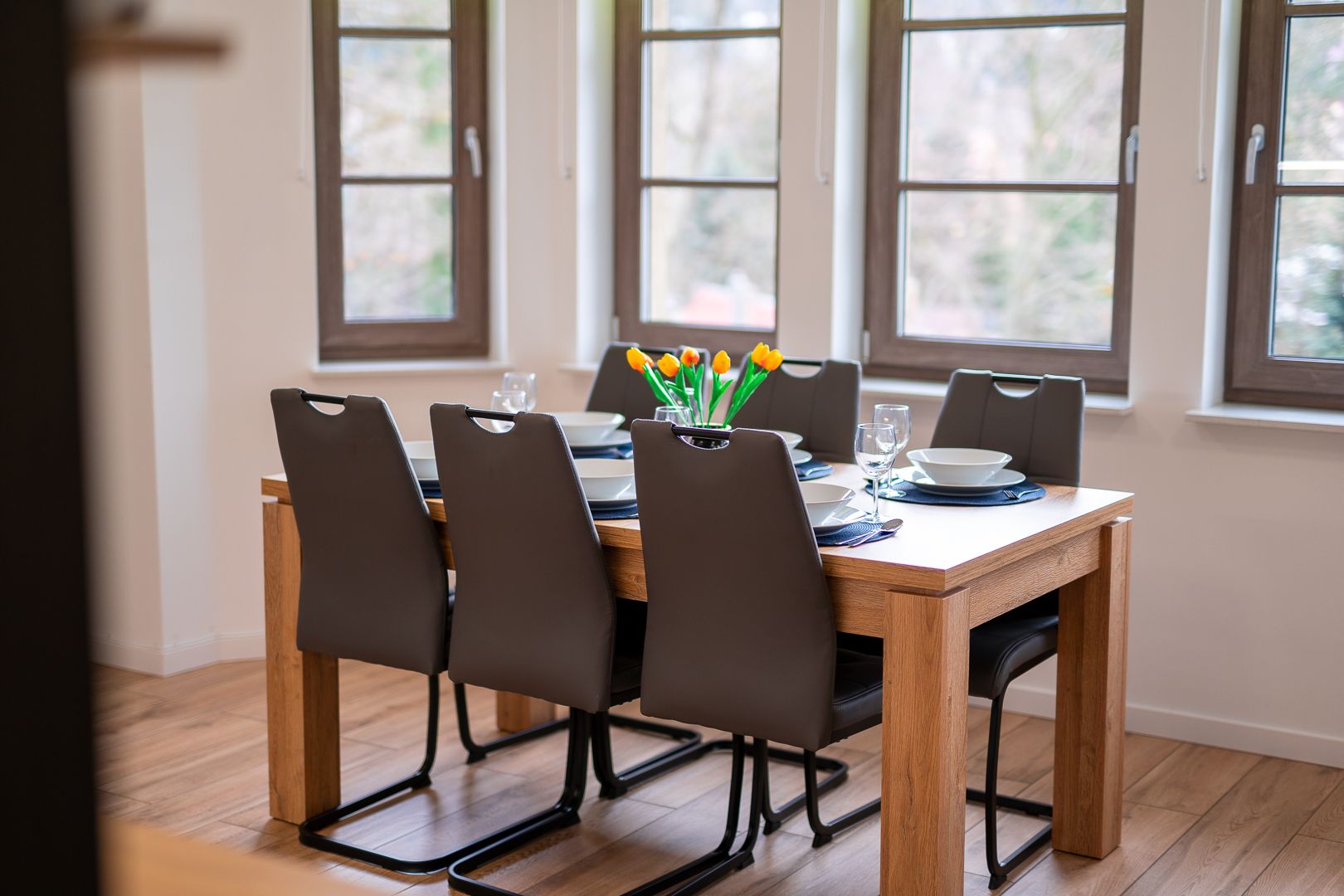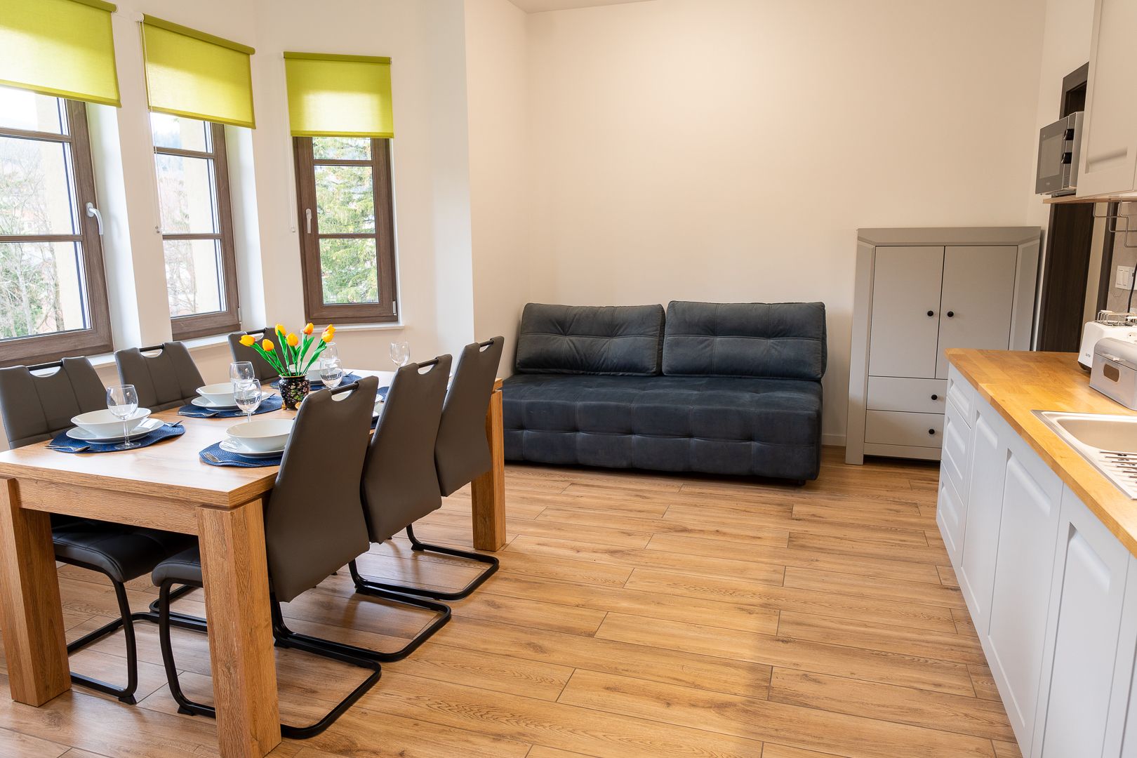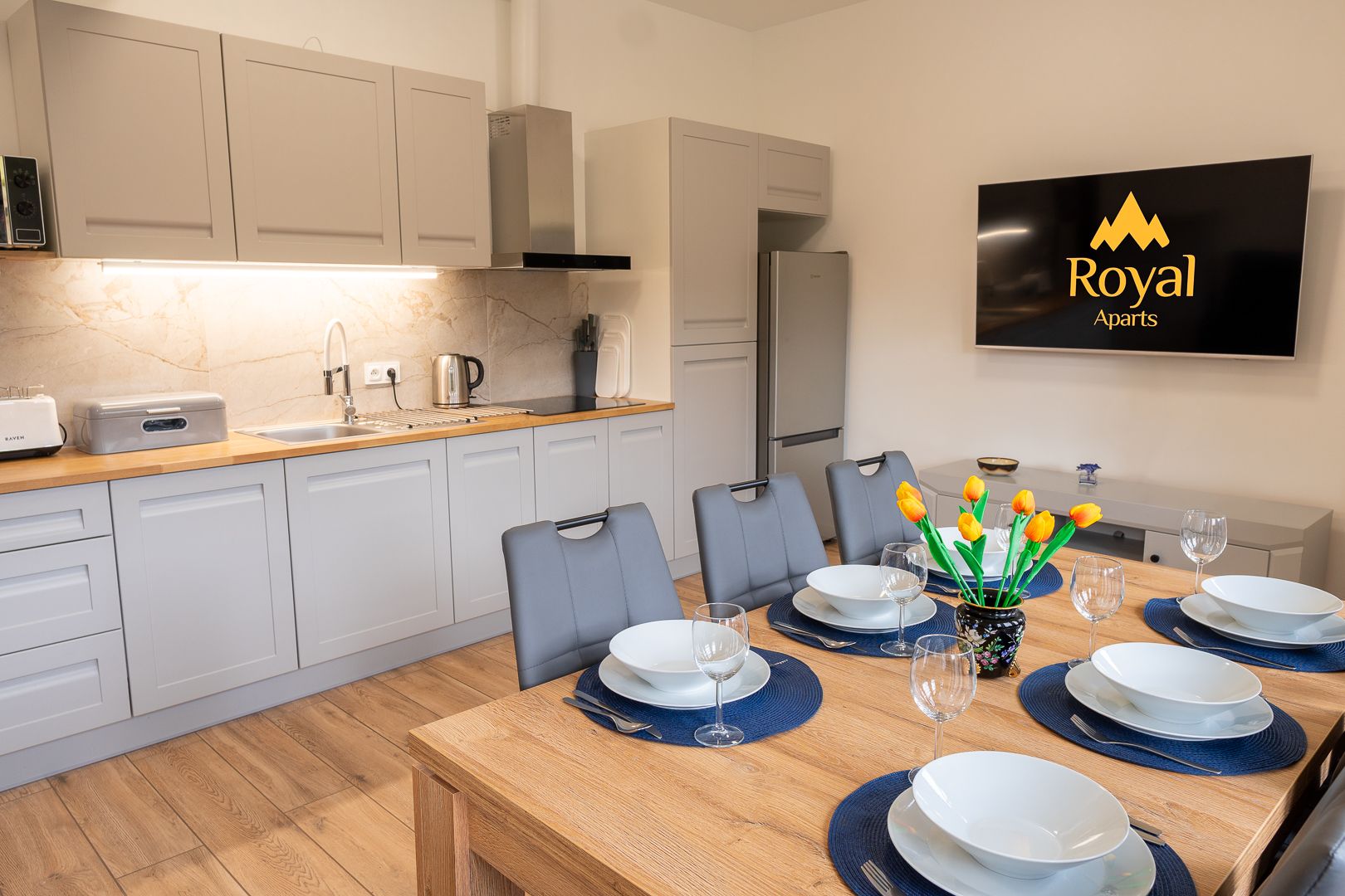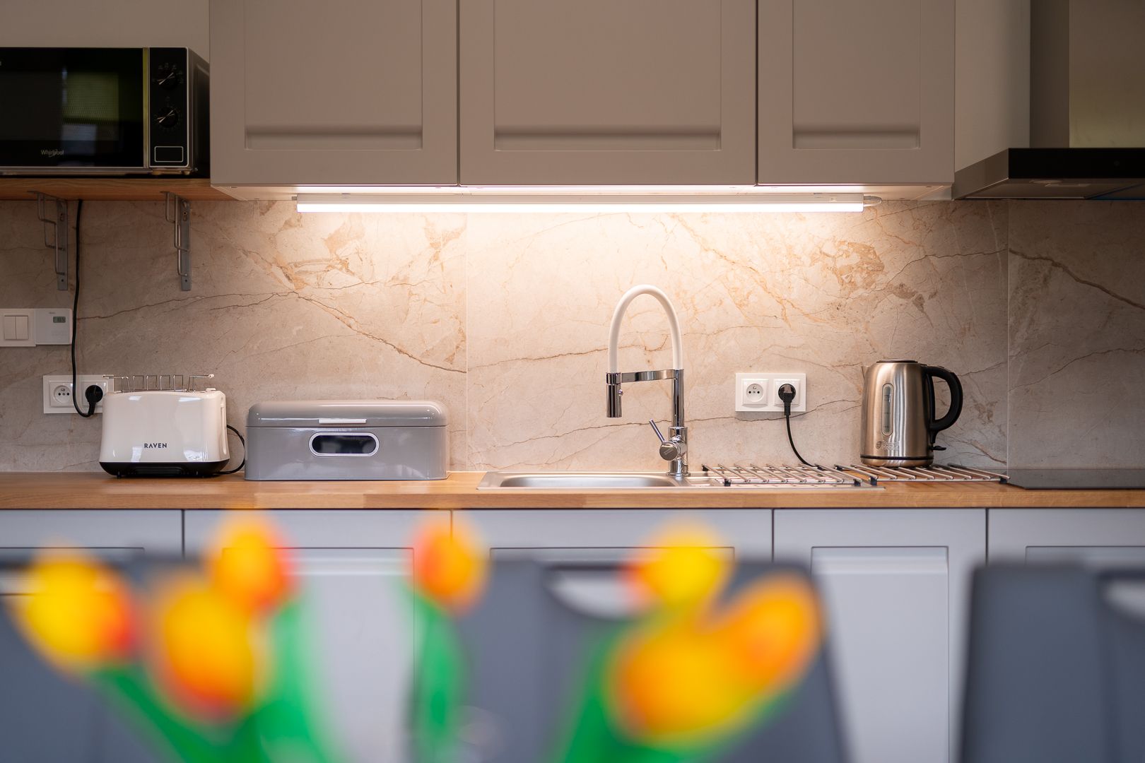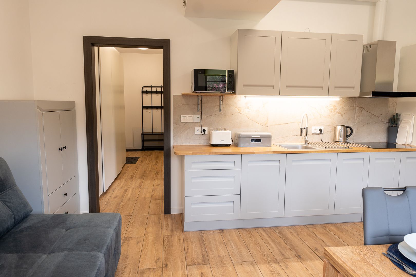 W pełni wyposażony aneks kuchenny umożliwi przygotowanie nawet uroczystej kolacji. W skład wyposażenia wchodzą m.in.: talerze i sztućce, płyta kuchenna wraz z garnkami i patelnią, mikrofalówka, zmywarka oraz ekspres do kawy.