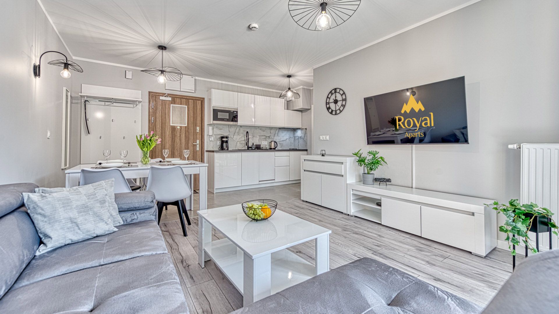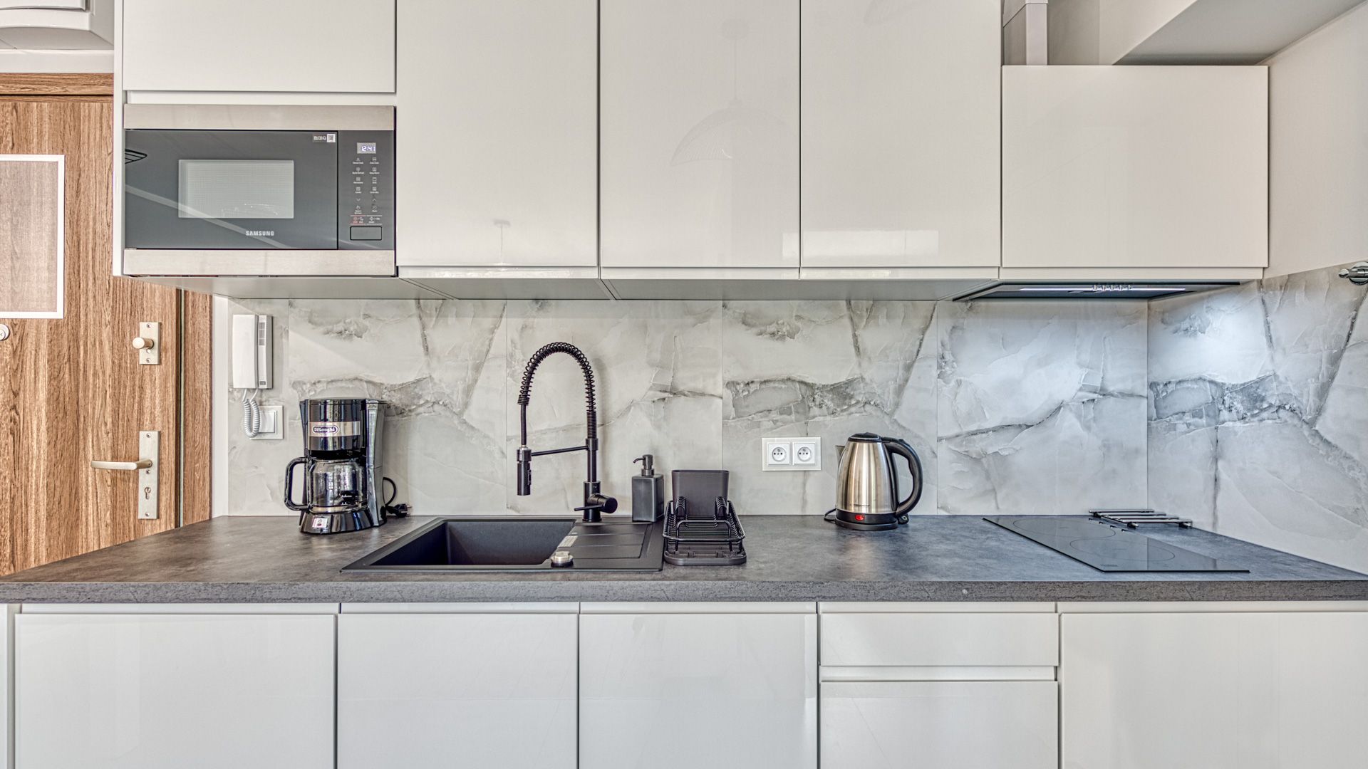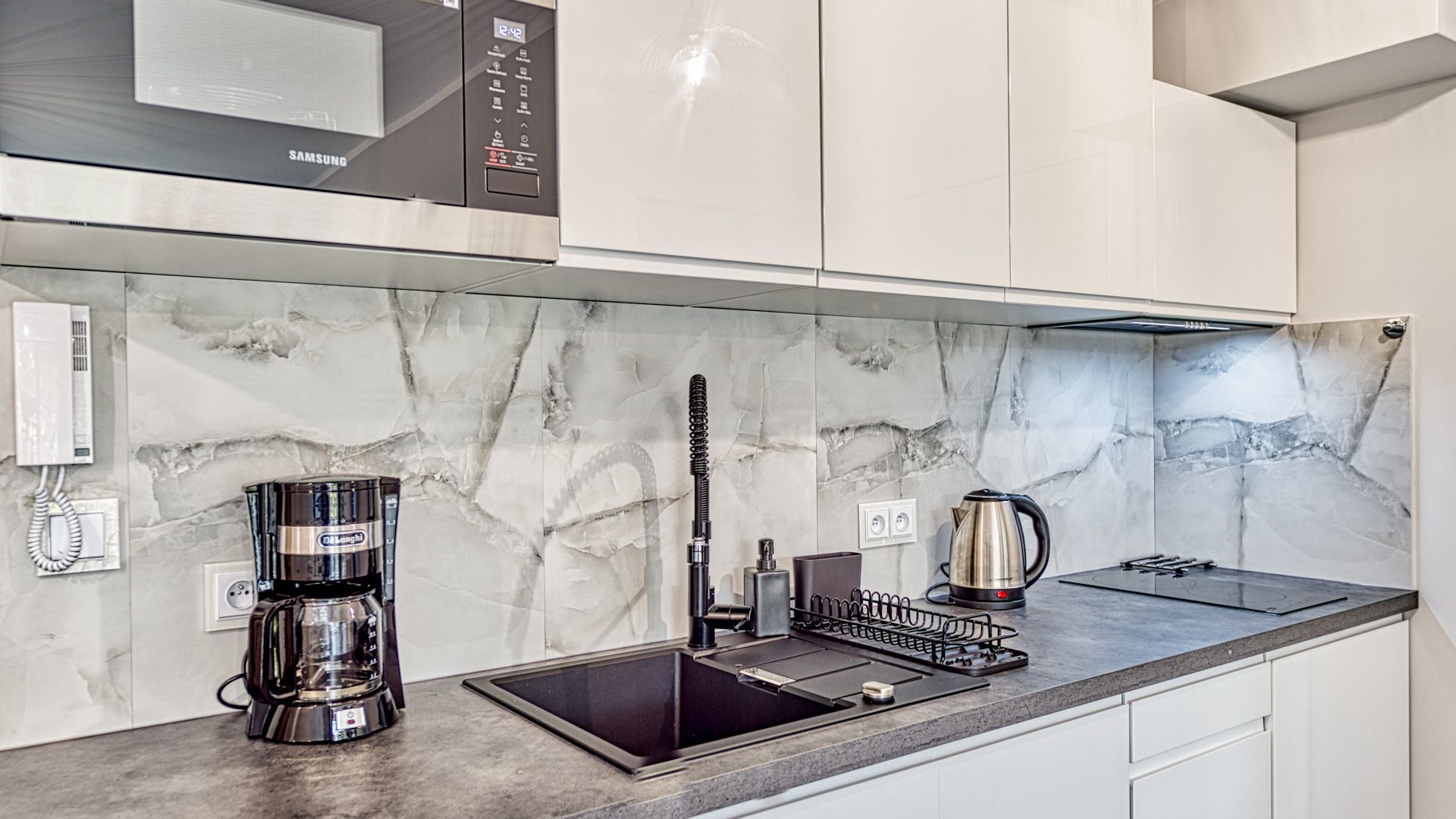 W pełni doposażony aneks kuchenny umożliwi przygotowanie nawet uroczystej kolacji. W skład wyposażenia wchodzą m.in.: talerze i sztućce, płyta kuchenna wraz z garnkami i patelnią, opiekacz/toster, lodówka, zmywarka, mikrofalówka oraz ekspres do kawy. Przy jadalnym stole przewidziano miejsce dla 4-ech osób.
