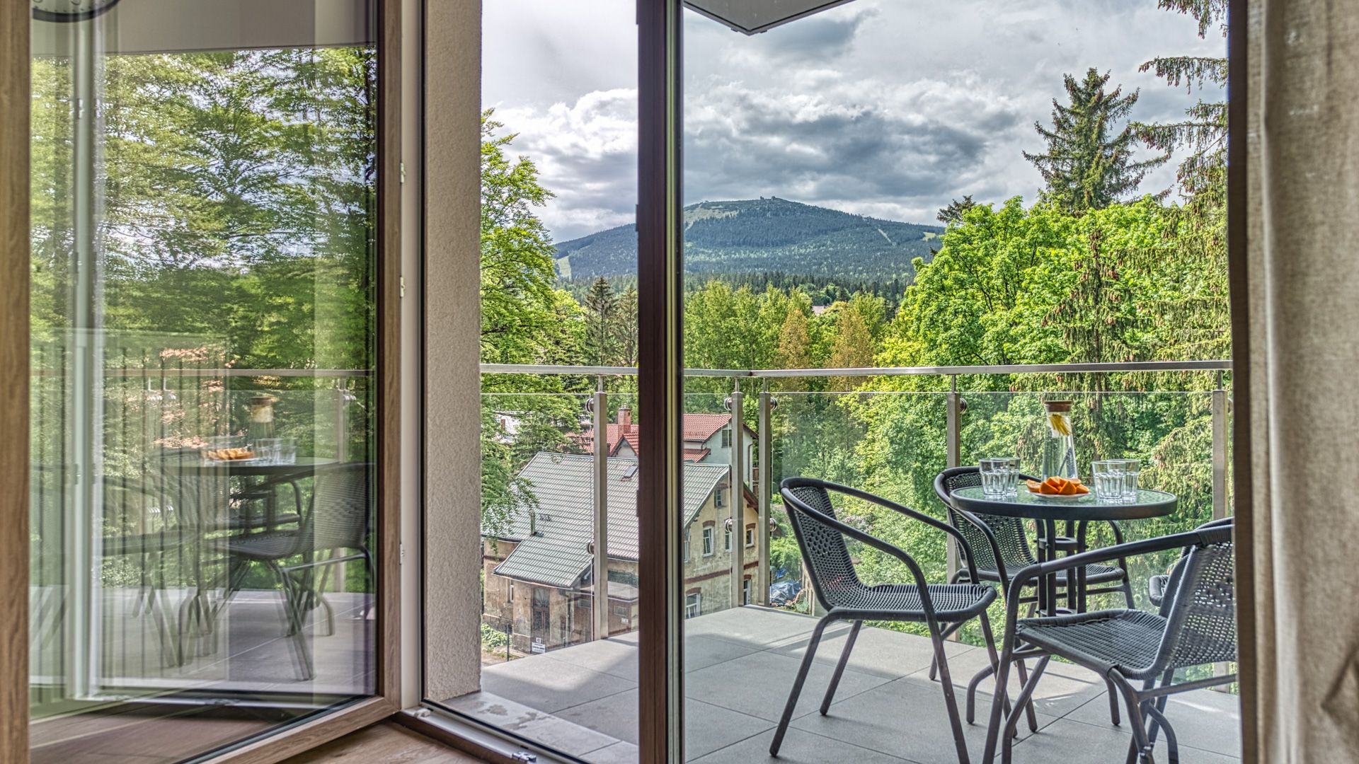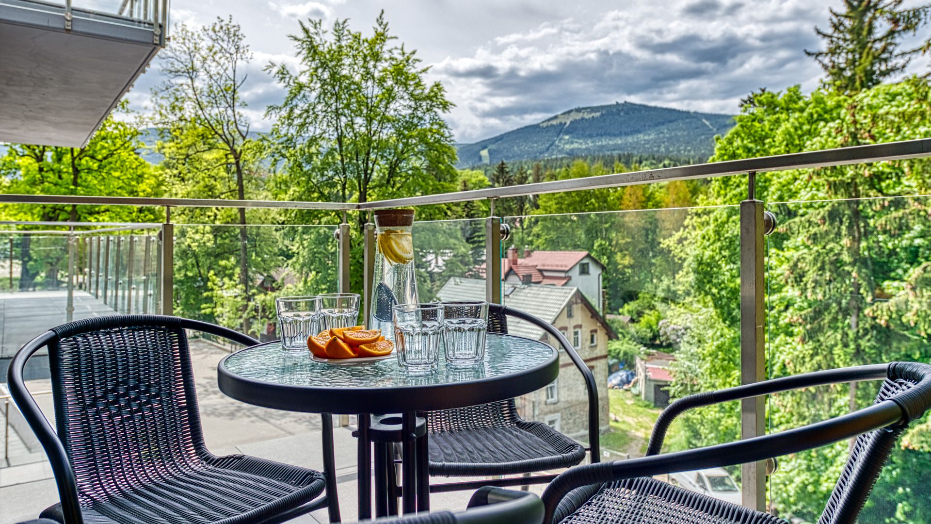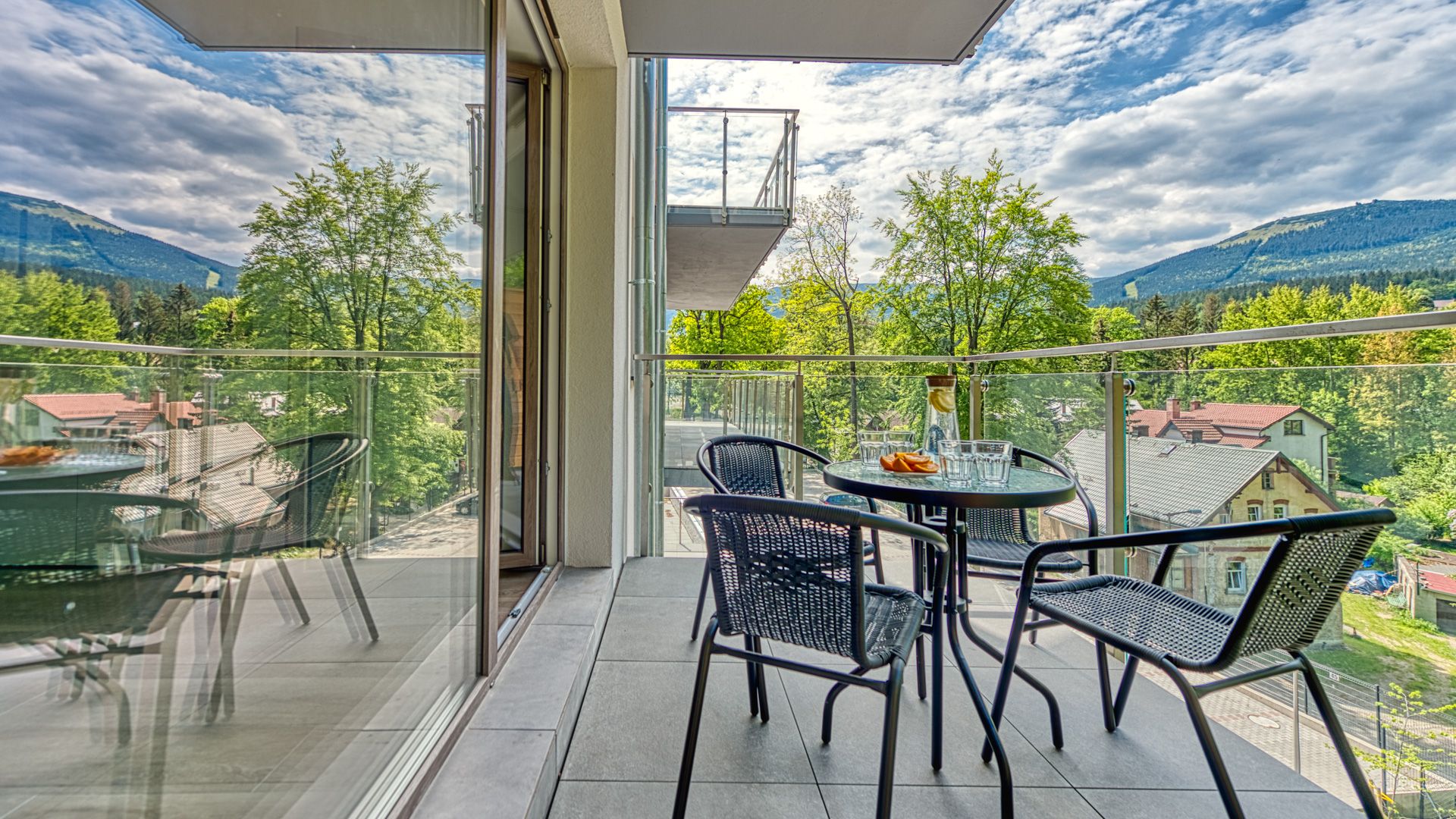 Obszerny balkon będzie ulubionym miejscem Gości na poranną kawę w otoczeniu gór.