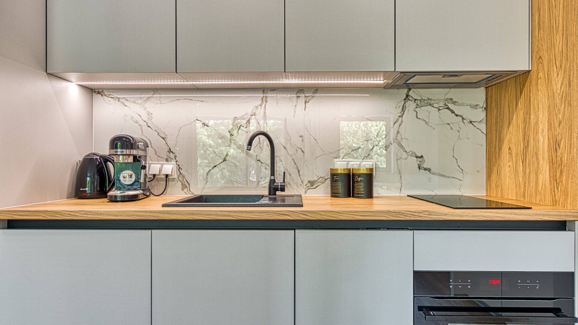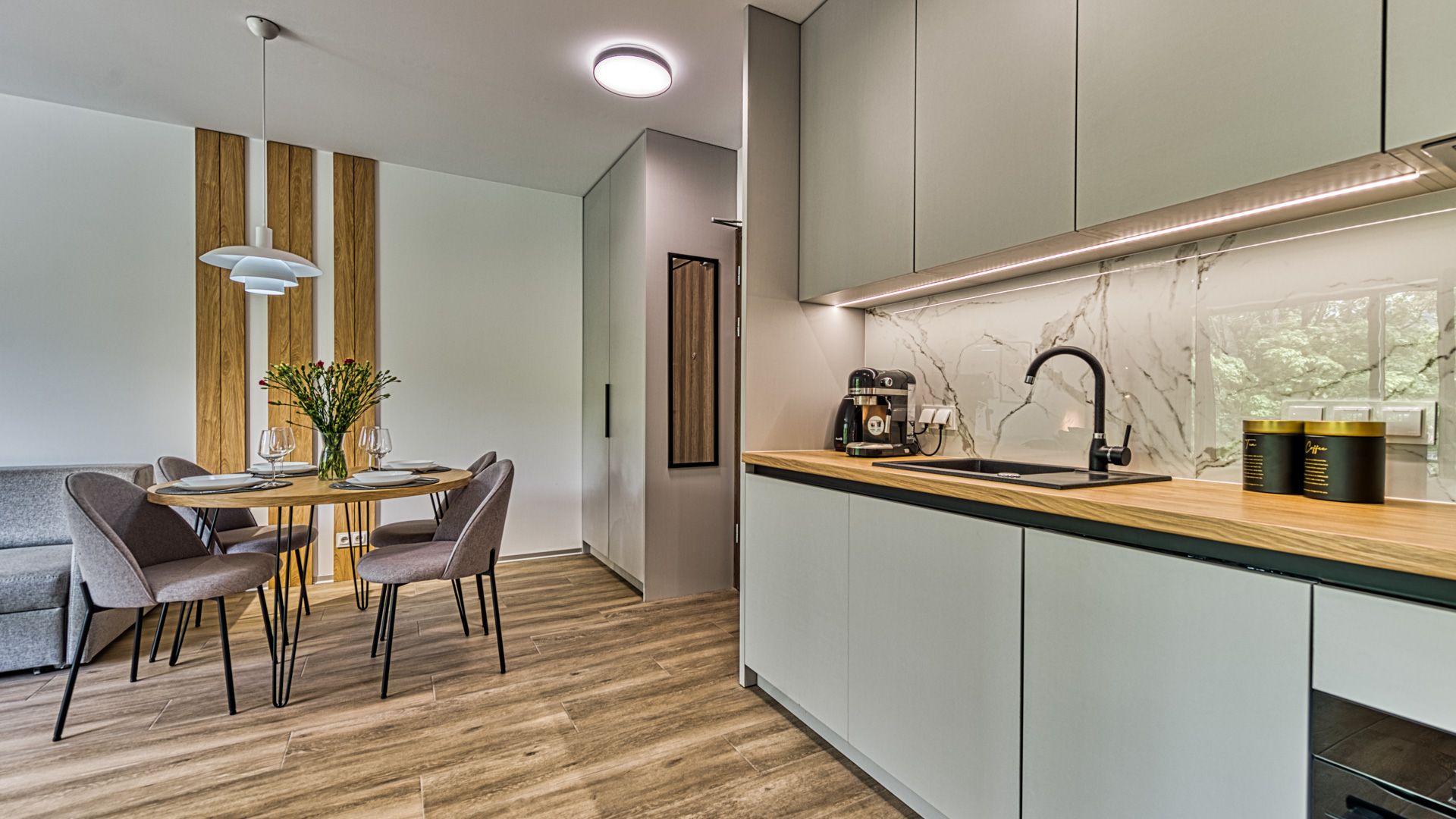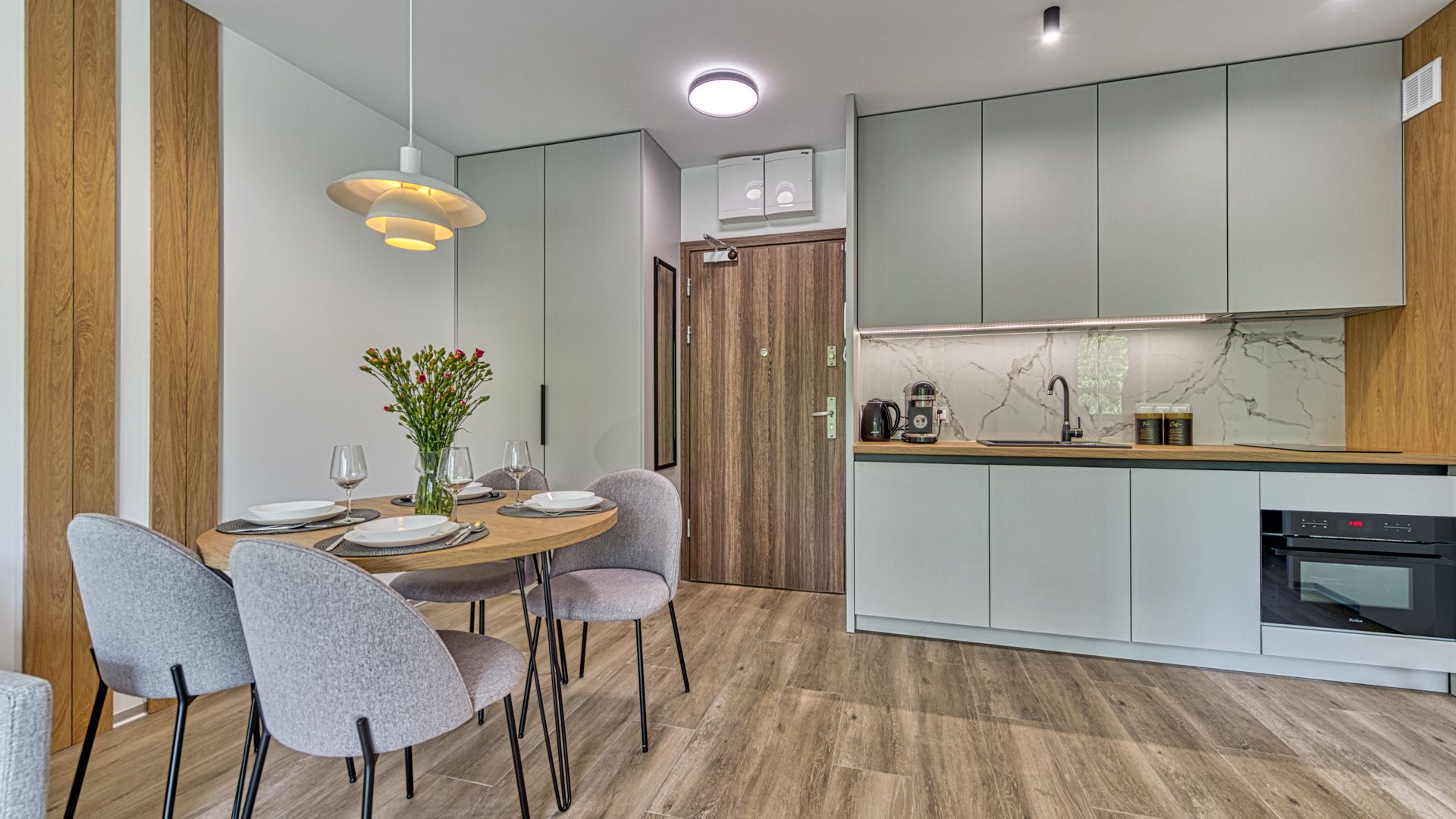W pełni doposażony aneks kuchenny umożliwi przygotowanie nawet uroczystej kolacji. W skład wyposażenia wchodzą m.in.: talerze i sztućce, płyta kuchenna wraz z garnkami i patelnią, opiekacz/toster, lodówka, zmywarka, mikrofalówka oraz ekspres do kawy. Przy jadalnym stole przewidziano miejsce dla 4-ech osób.
