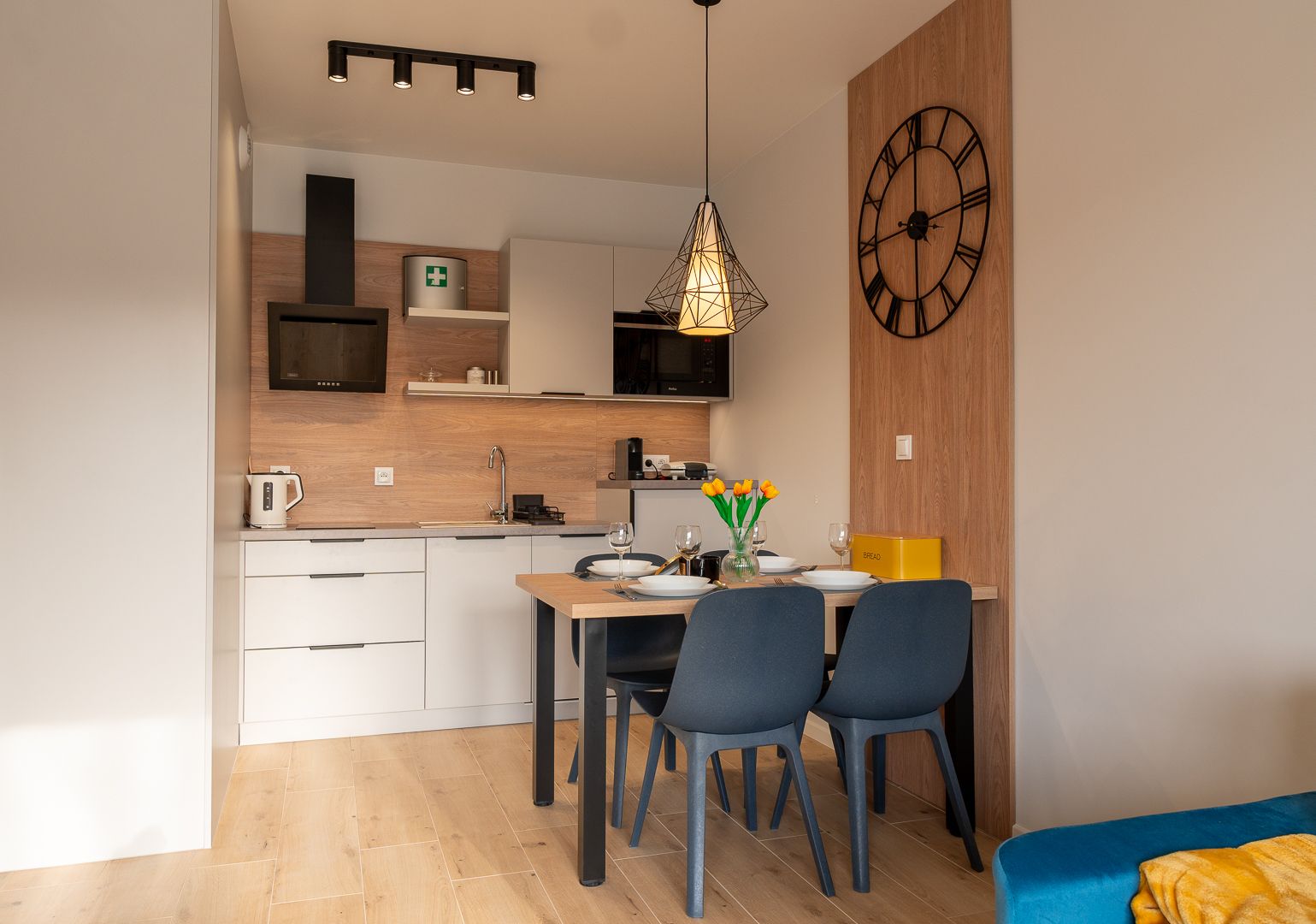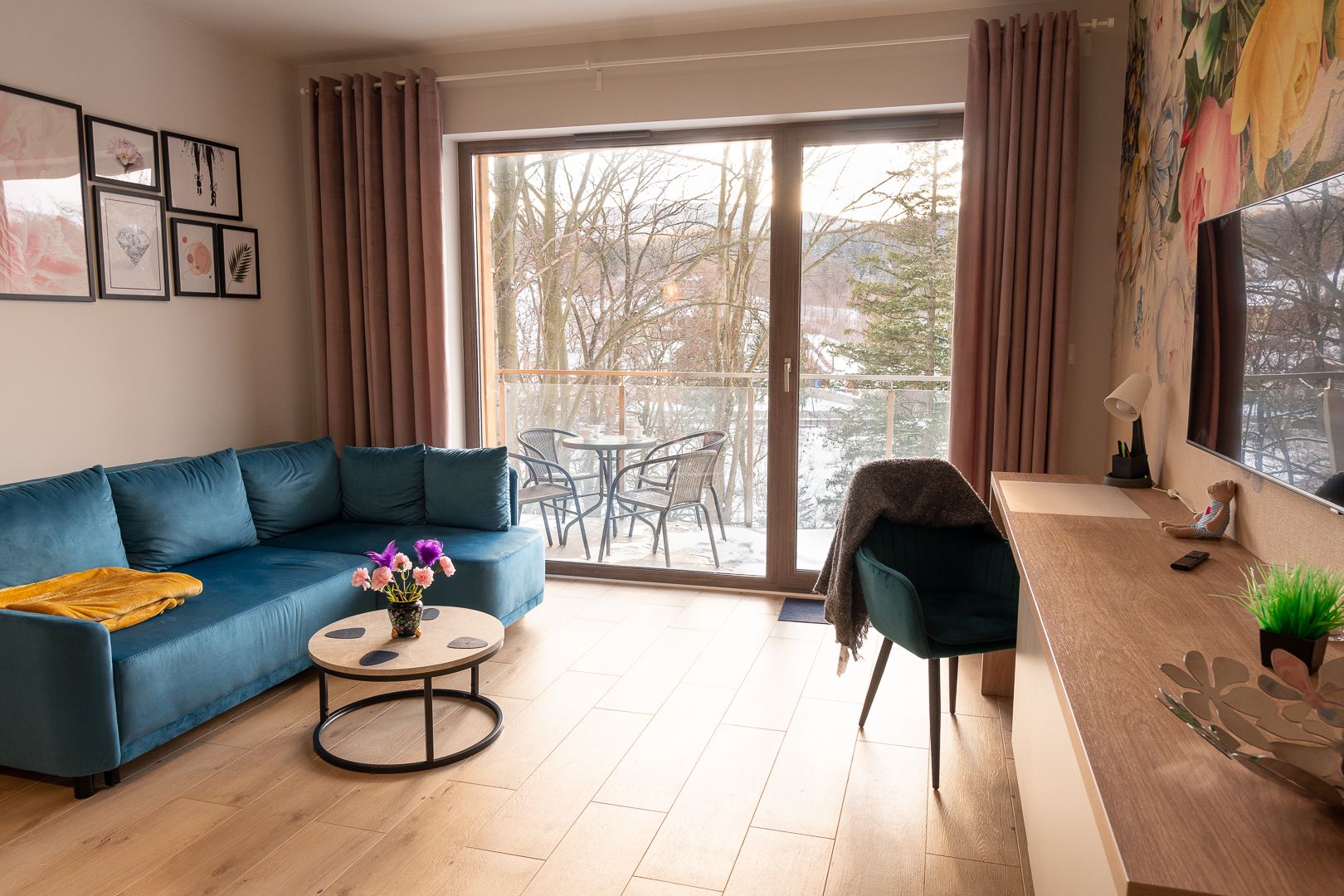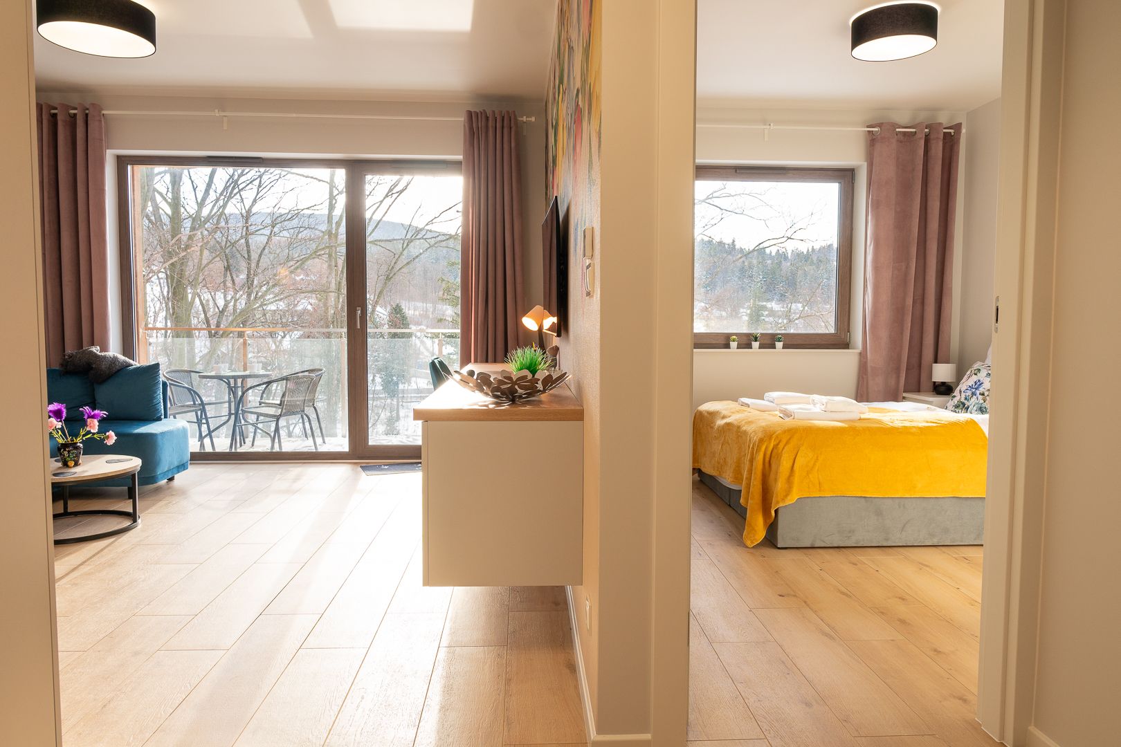 Prezentowany apartament jest częścią prestiżowego kompleksu Stone Hill w samym centrum Szklarskiej Poręby. To nowoczesny, dwupokojowy apartament o powierzchni 39m^2. W sypialni znajduje się wygodne małżeńskie łoże i duża szafa. Część dzienna apartamentu zaopatrzona w rozkładaną sofę i płaski telewizor, połączona jest z w pełni wyposażonym aneksem kuchennym. Sam aneks zaopatrzony jest we wszelkie niezbędne do przygotowania smacznego posiłku sprzęty, m.in. czajnik, płytę grzewczą, talerze i sztućce, lodówkę, ekspres do kawy, opiekacz/toster, zmywarkę, mikrofalówkę, etc. W łazience znajduje się pralka oraz prysznic. Ponadto zapewniamy Gościom dostęp do darmowego Internetu Wi-Fi.