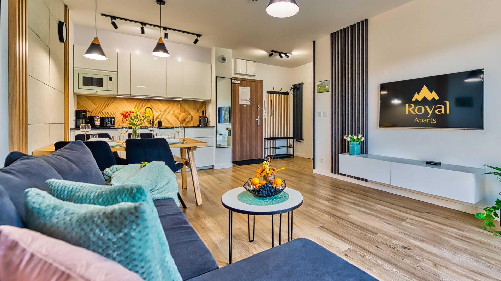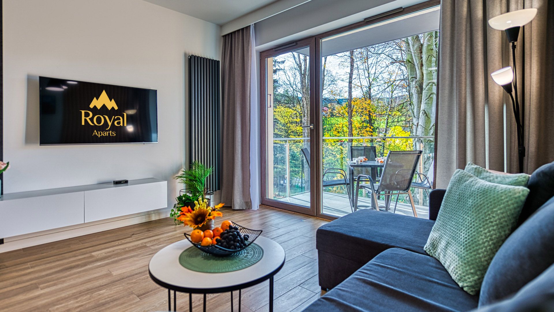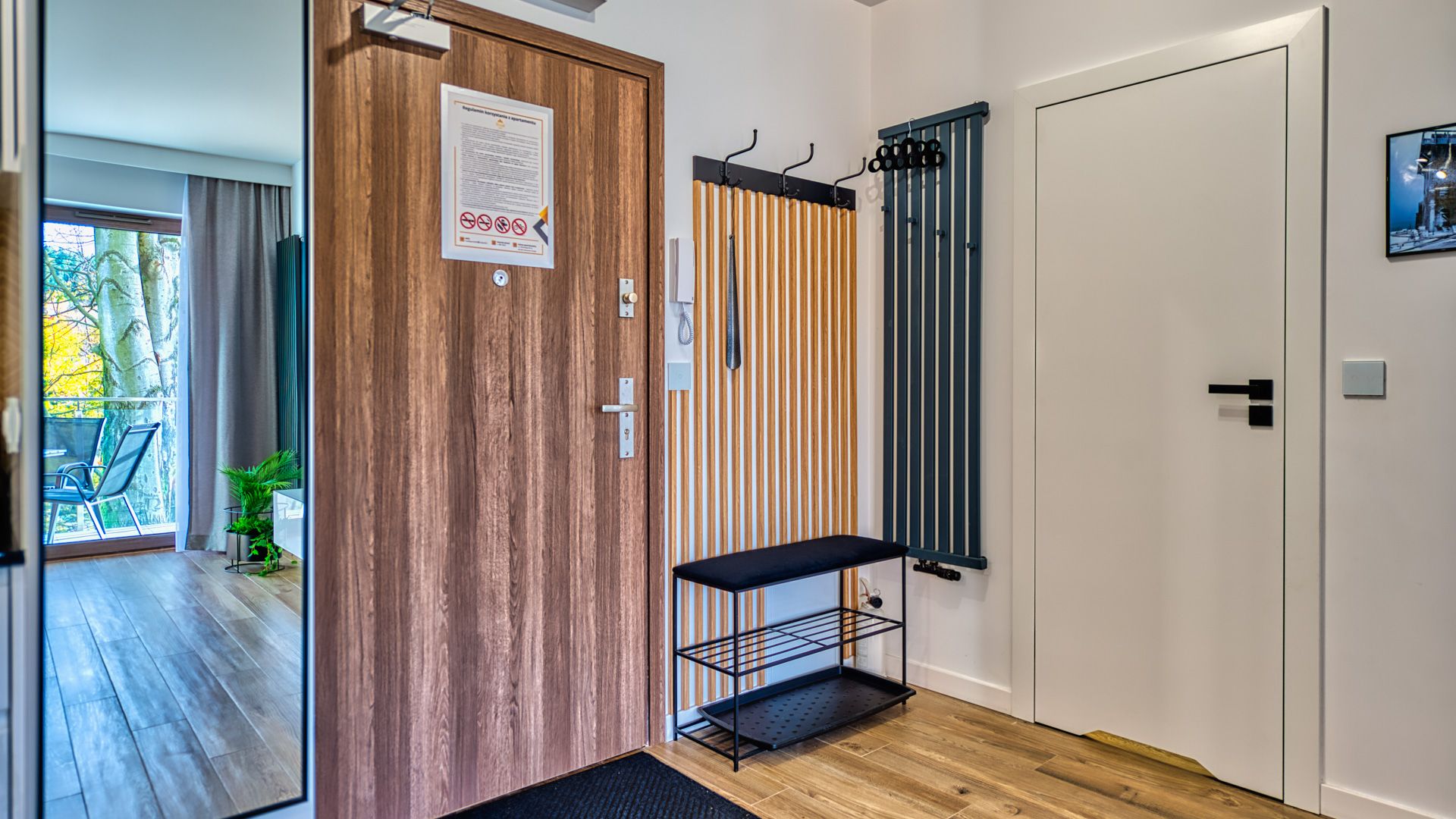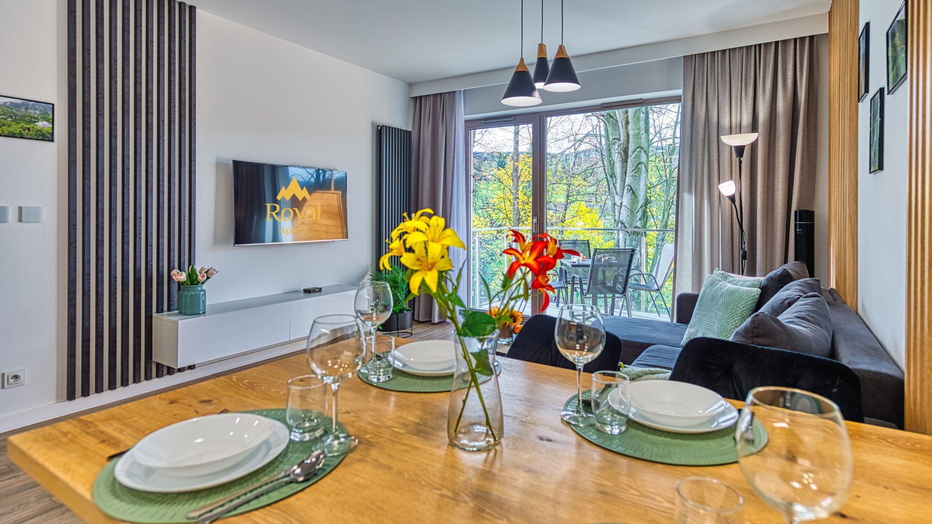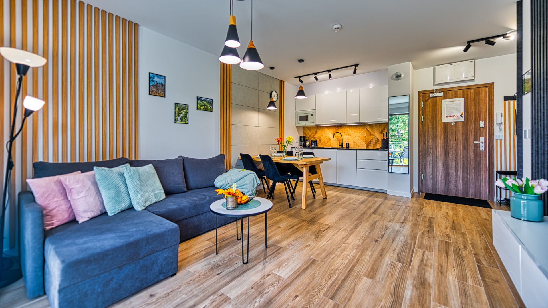 Prezentowany apartament jest częścią prestiżowego kompleksu Stone Hill w samym centrum Szklarskiej Poręby. To nowoczesny, w pełni wyposażony apartament o powierzchni 38m^2, przeznaczony dla maksymalnie czterech osób. Składa się z sypialni, w której stoi duże, małżeńskie łoże, części wypoczynkowej, połączonej z aneksem kuchennym oraz łazienki z prysznicem i pralką. W części dziennej stoi rozkładana, dwuosobowa sofa, naprzeciwko której wisi panoramiczny telewizor.