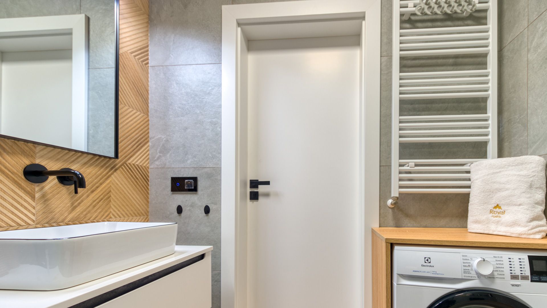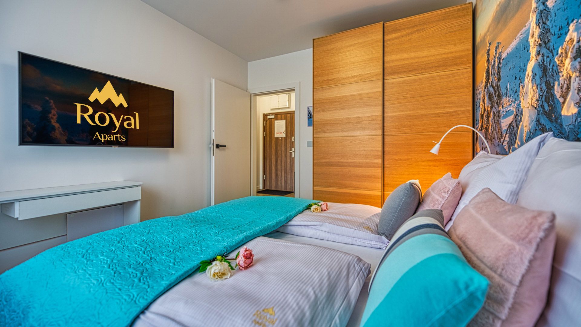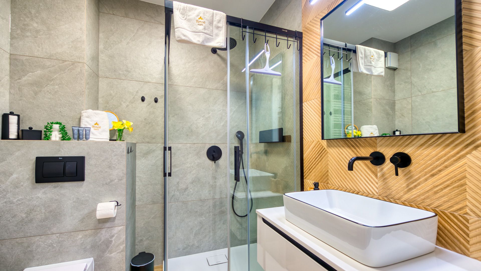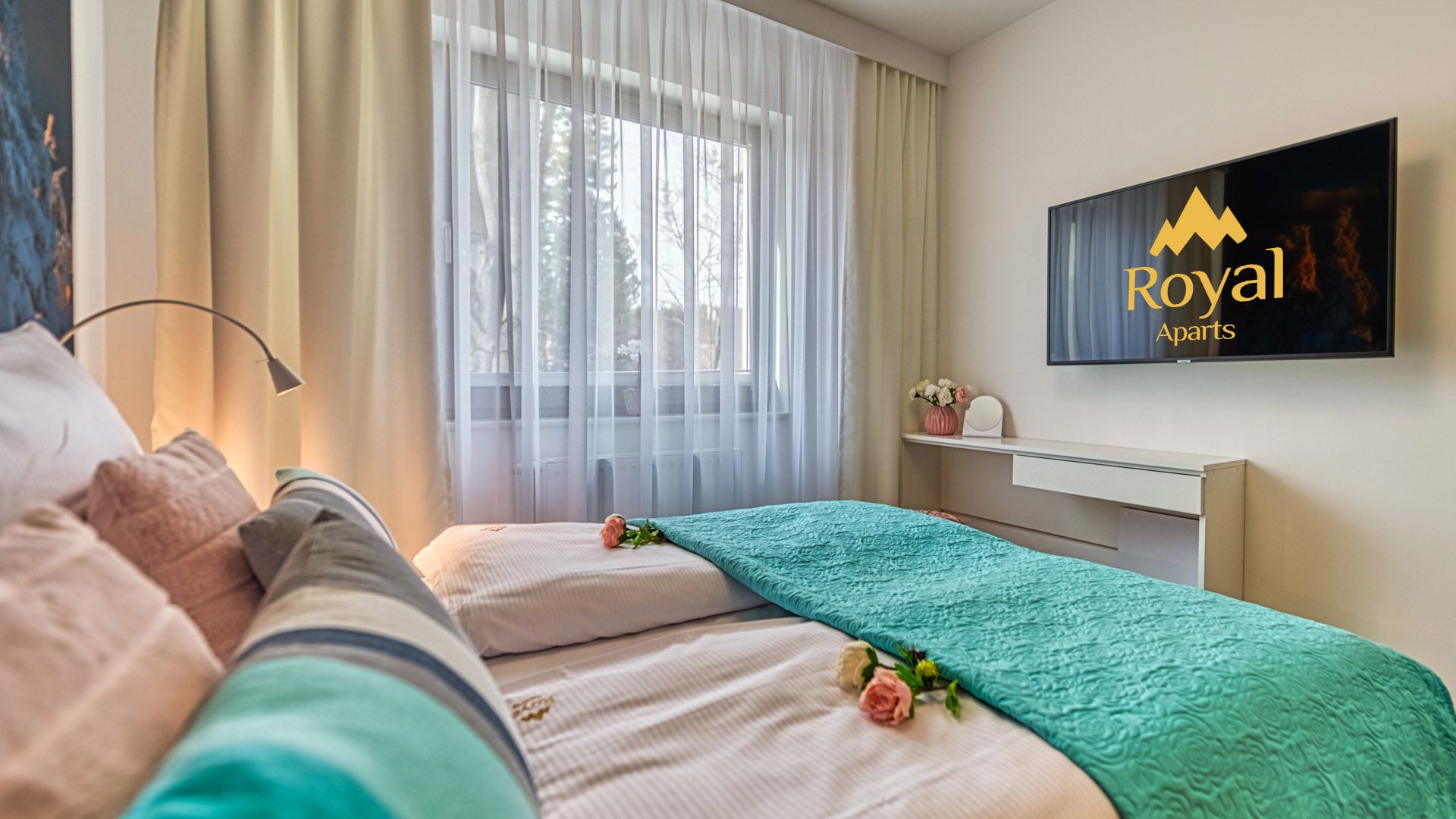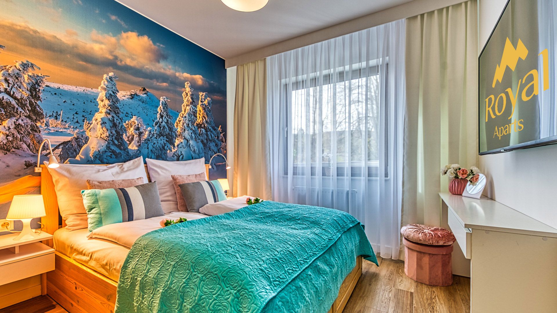 Prezentowany apartament jest częścią prestiżowego kompleksu Stone Hill w samym centrum Szklarskiej Poręby. To nowoczesny, w pełni wyposażony apartament o powierzchni 38m^2, przeznaczony dla maksymalnie czterech osób. Składa się z sypialni, w której stoi duże, małżeńskie łoże, części wypoczynkowej, połączonej z aneksem kuchennym oraz łazienki z prysznicem i pralką. W części dziennej stoi rozkładana, dwuosobowa sofa, naprzeciwko której wisi panoramiczny telewizor.