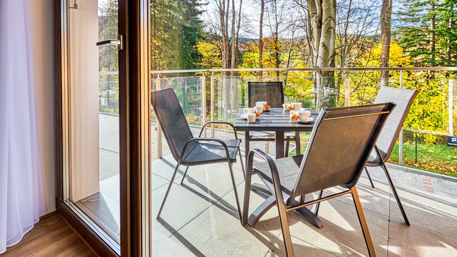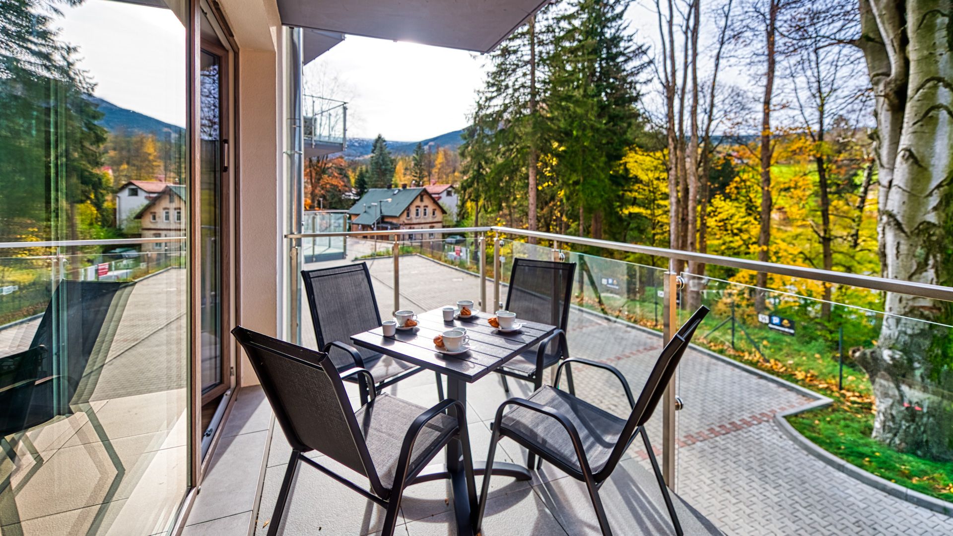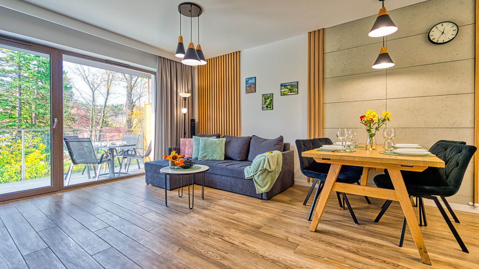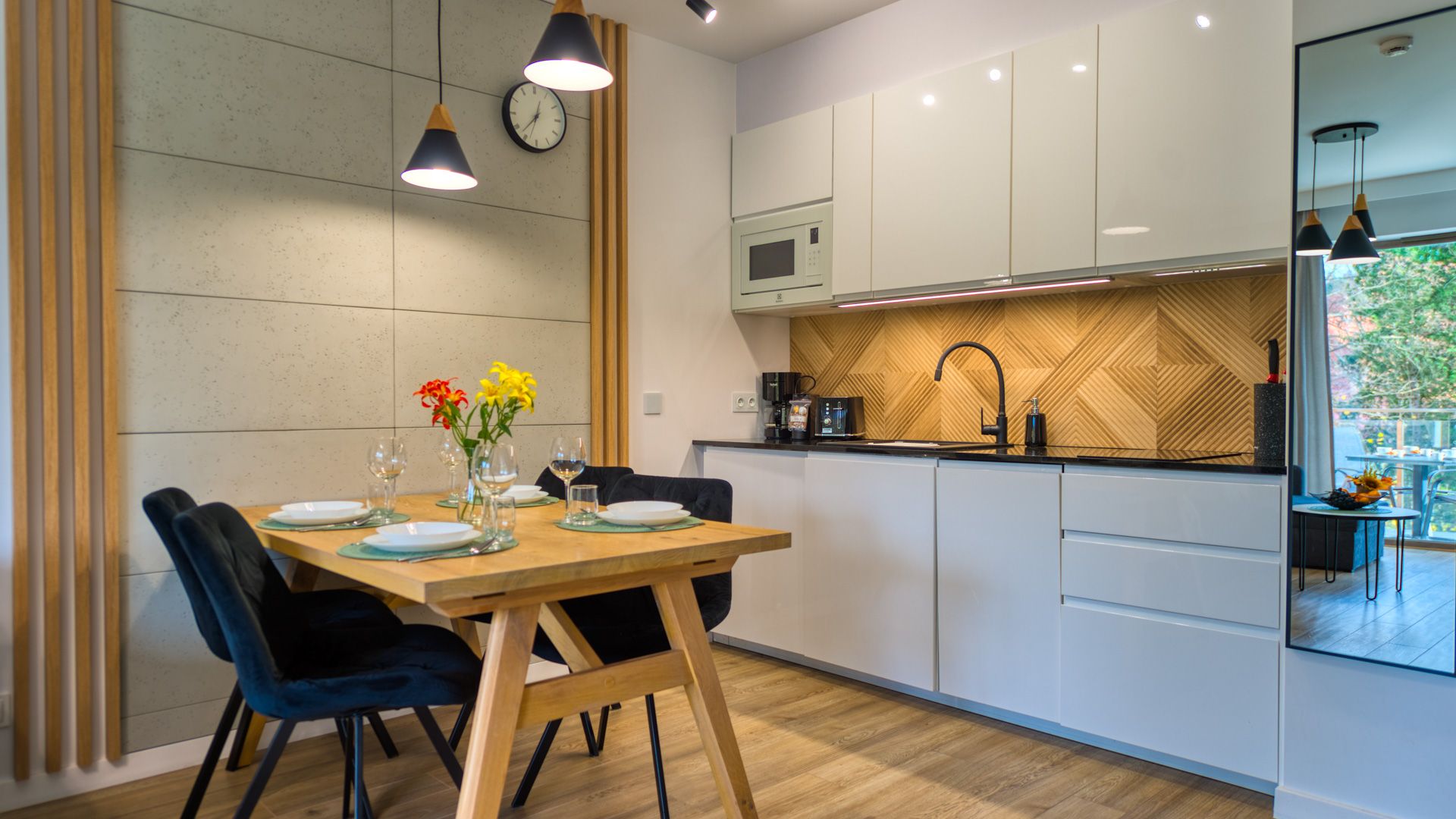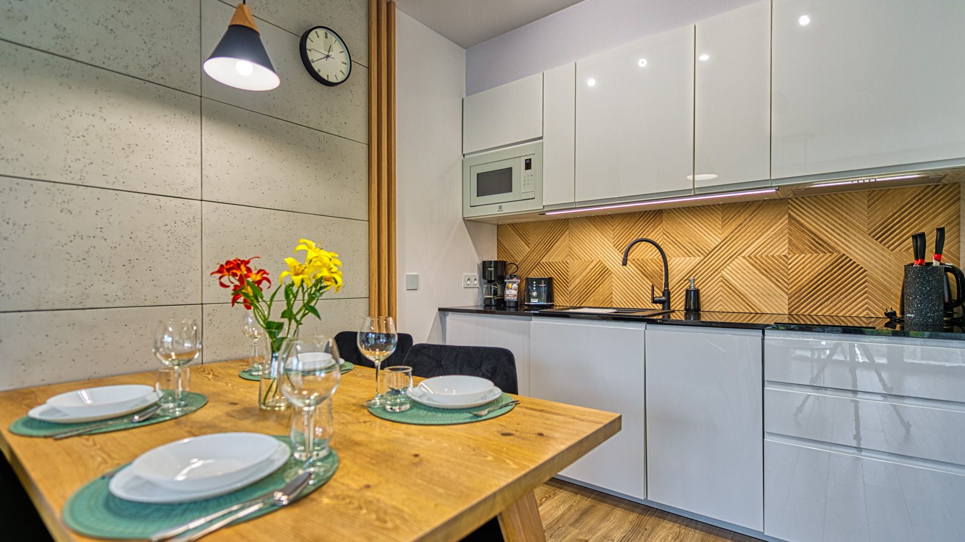 Obszerny balkon będzie ulubionym miejscem Gości na poranną kawę, a w pełni wyposażona kuchnia umożliwi przygotowanie nawet uroczystej kolacji. W skład wyposażenia wchodzą m.in.: talerze i sztućce, płyta kuchenna wraz z garnkami i patelnią, mikrofalówka, zmywarka oraz ekspres do kawy.