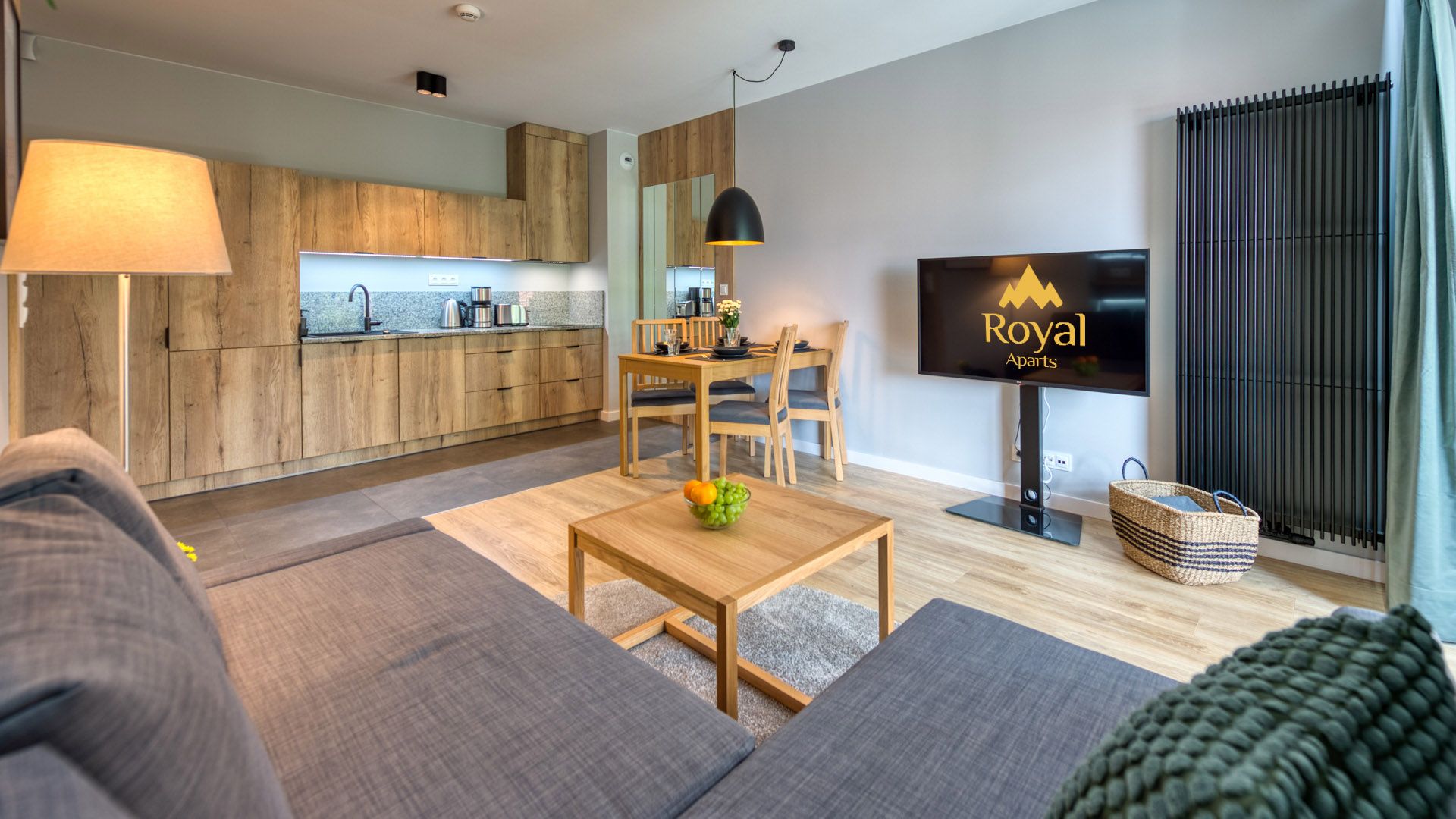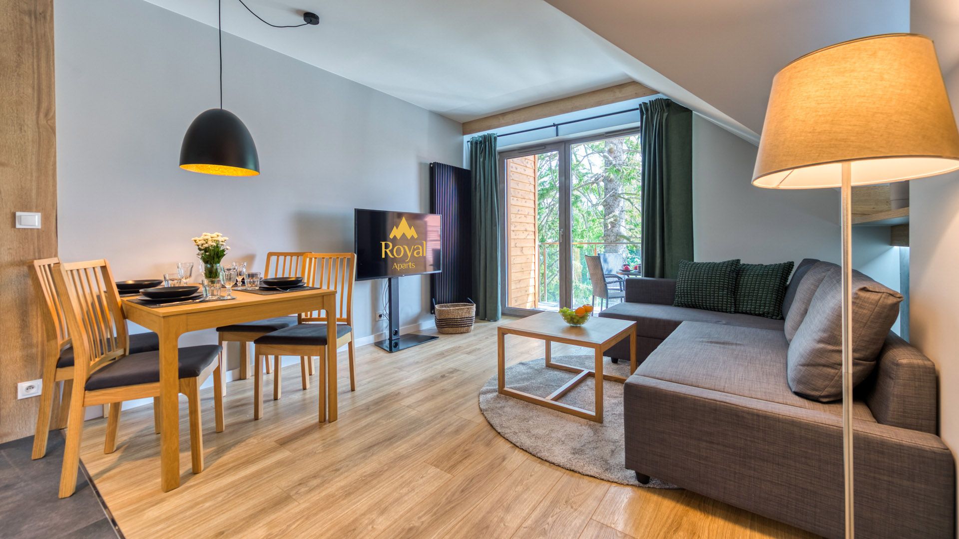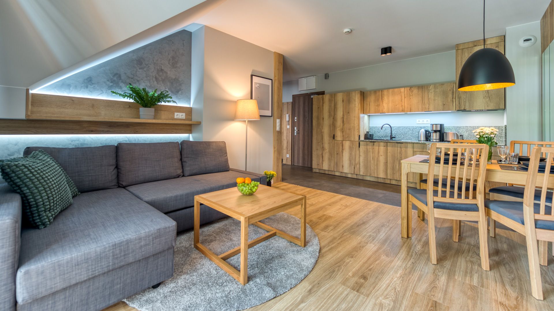 Prezentowany apartament jest częścią prestiżowego kompleksu Stone Hill w samym centrum Szklarskiej Poręby. To nowoczesny, czteroosobowy, w pełni wyposażony lokal o powierzchni 40m^2. W sypialni znajduje się duże łóżko małżeńskie oraz obszerna szafa. Część dzienna apartamentu składa się z, salonu połączonego z aneksem kuchennym i wyposażona jest w rozkładaną sofę, panoramiczny telewizor i stół kuchenny. Całość domyka wykończona w wysokim standardzie łazienka z pralką.