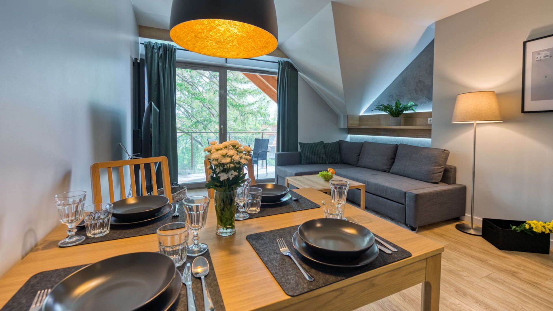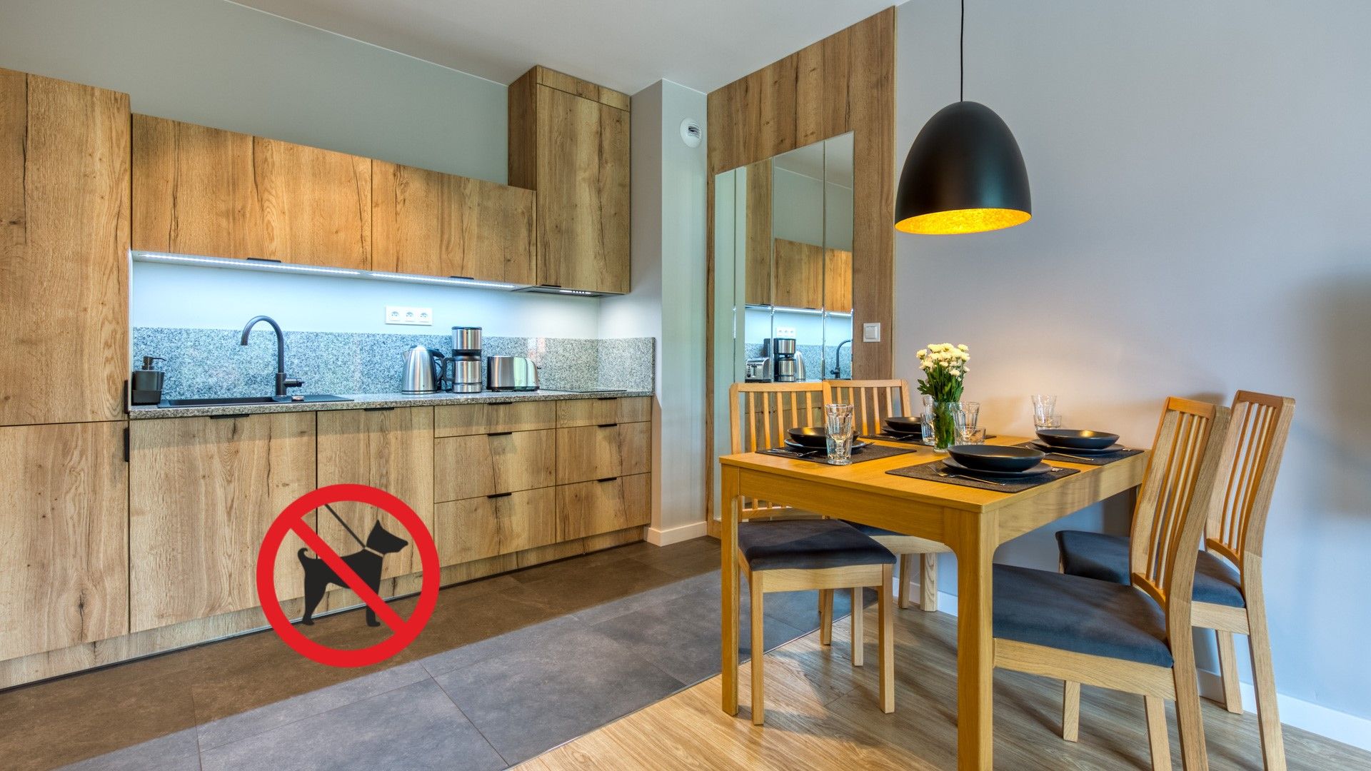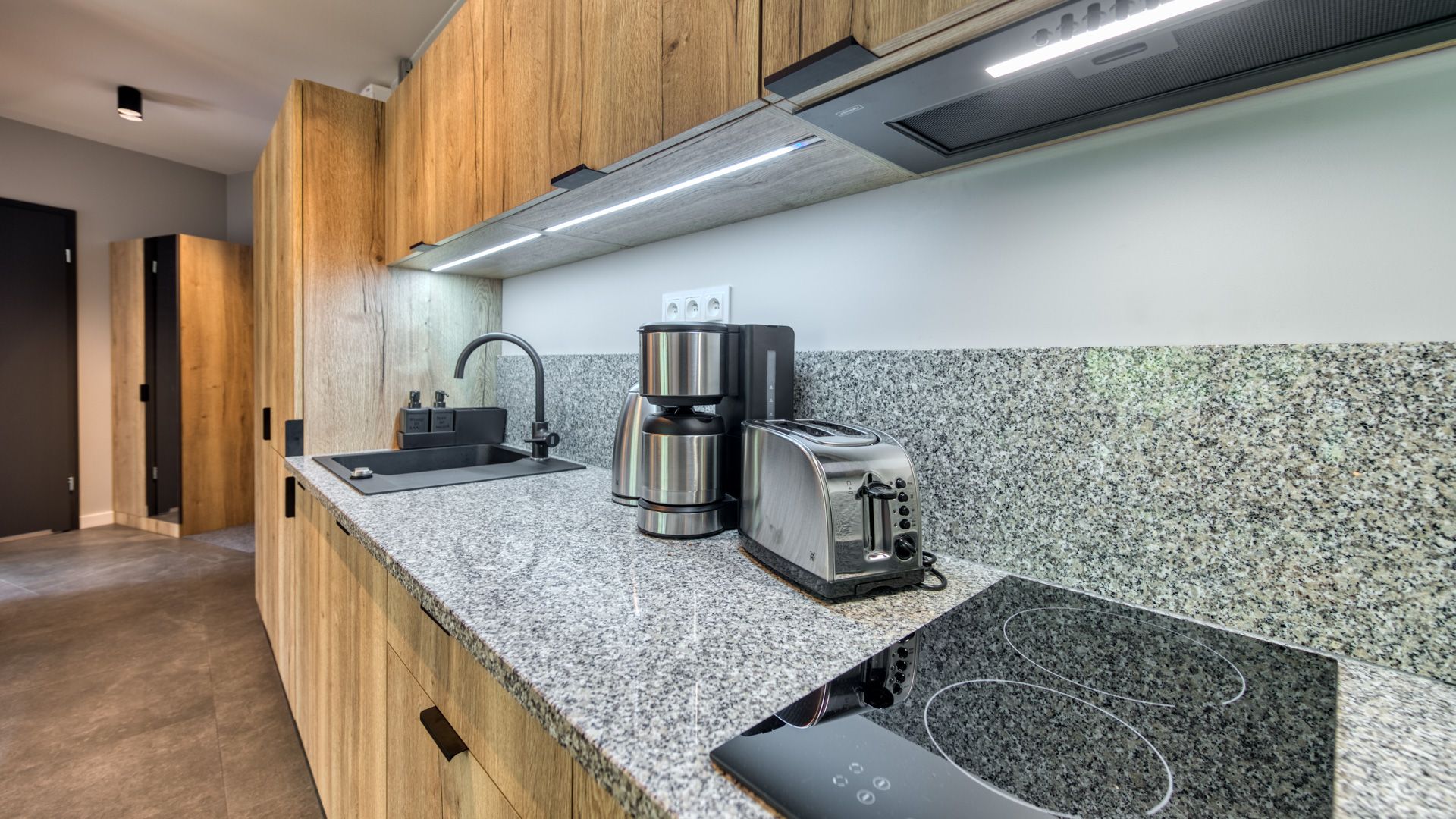 W pełni doposażony aneks kuchenny umożliwi przygotowanie nawet uroczystej kolacji. W skład wyposażenia wchodzą m.in.: talerze i sztućce, płyta kuchenna wraz z garnkami i patelnią, opiekacz/toster, lodówka, zmywarka oraz ekspres do kawy. Przy jadalnym stole przewidziano miejsce dla 4-ech osób.