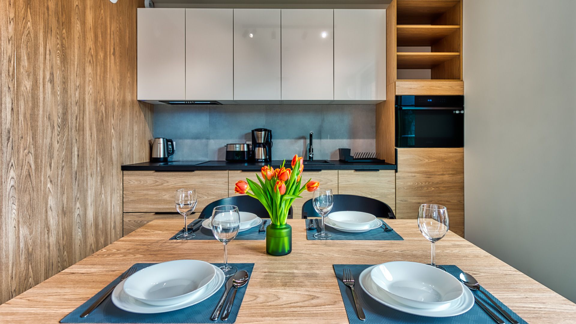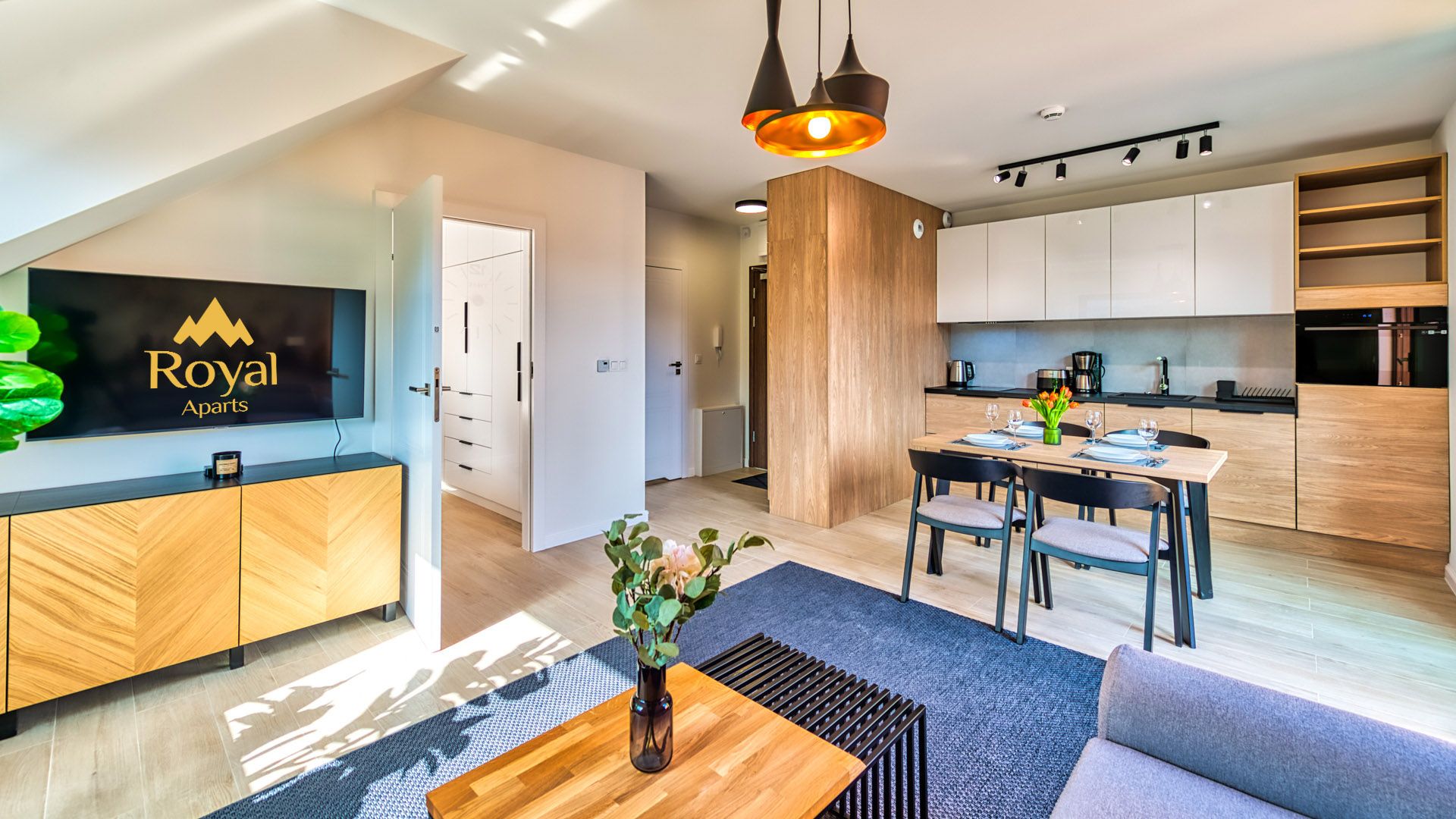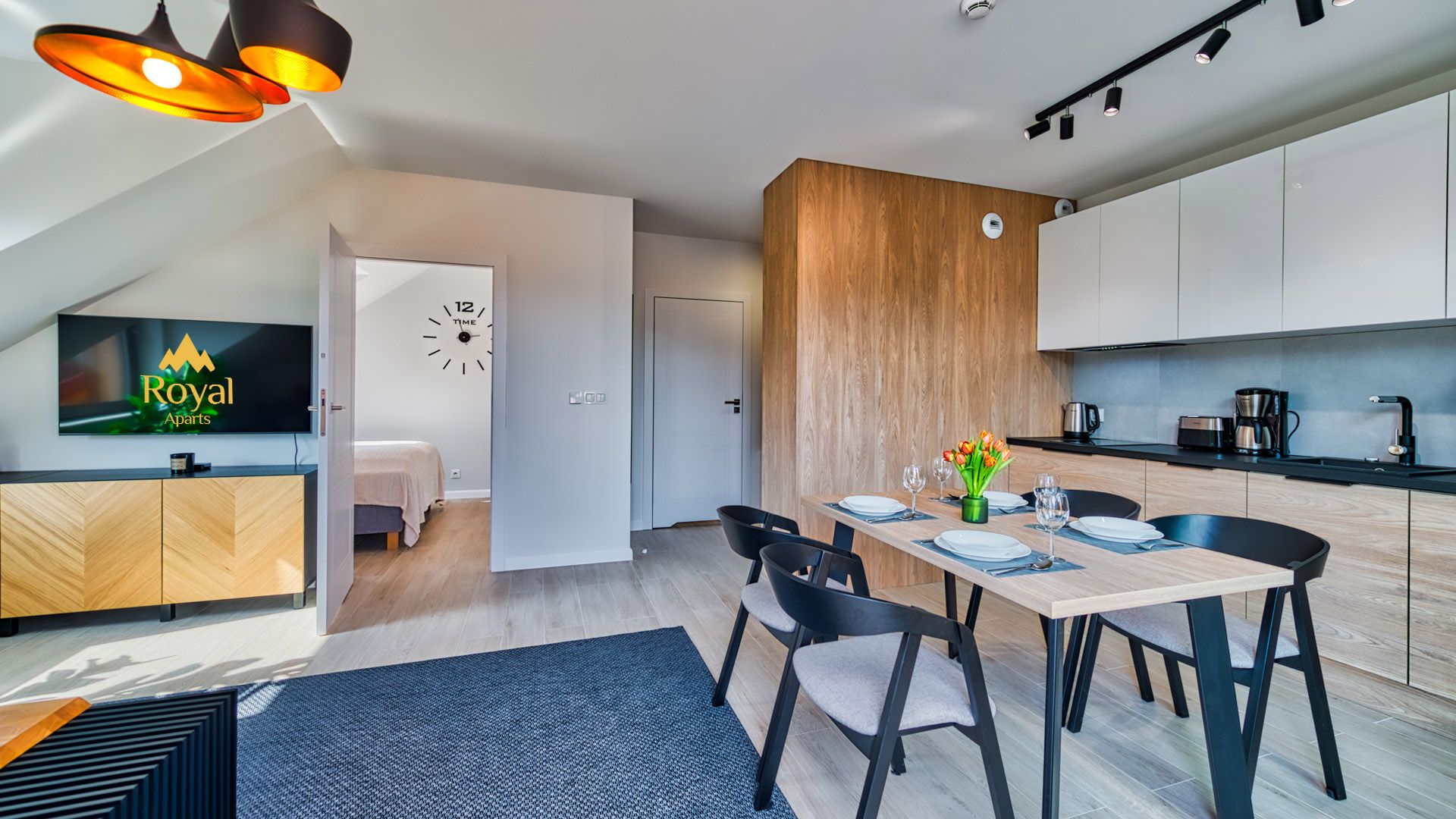 Sam lokal składa się z sypialni, w której znajdziemy duże, dwuosobowe łóżko, części wypoczynkowej, połączonej z aneksem kuchennym oraz łazienki z prysznicem i pralką. Ponadto w części dziennej mamy rozkładaną sofę i płaski telewizor. Aneks kuchenny wyposażony jest we wszystkie, niezbędne sprzęty, pozwalające na przygotowanie nawet uroczystego posiłku. Są to m.in.: czajnik, talerze i sztućce, lodówka, opiekacz/toster, ekspres do kawy, zmywarka, mikrofalówka, płyta grzewcza.