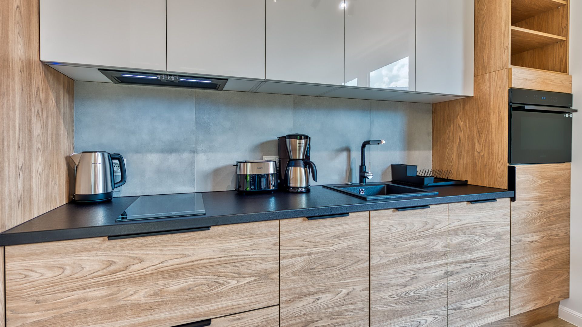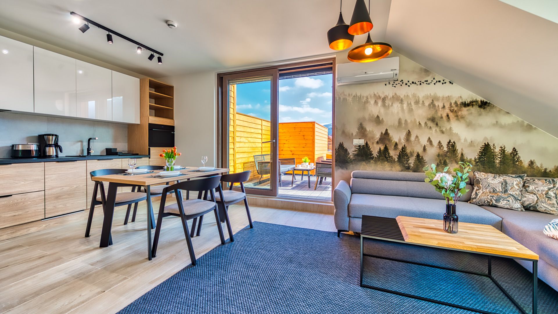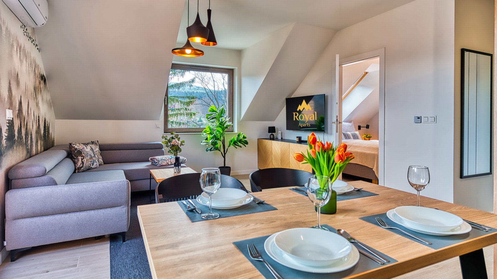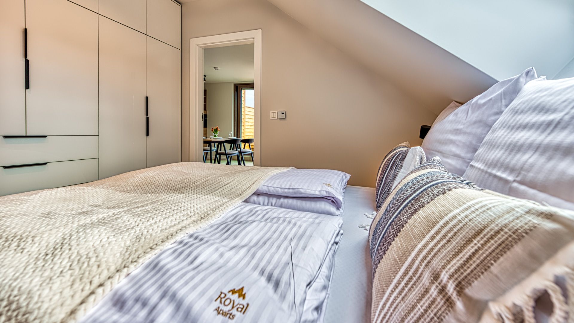 Sam lokal składa się z sypialni, w której znajdziemy duże, dwuosobowe łóżko, części wypoczynkowej, połączonej z aneksem kuchennym oraz łazienki z prysznicem i pralką. Ponadto w części dziennej mamy rozkładaną sofę i płaski telewizor. Aneks kuchenny wyposażony jest we wszystkie, niezbędne sprzęty, pozwalające na przygotowanie nawet uroczystego posiłku. Są to m.in.: czajnik, talerze i sztućce, lodówka, opiekacz/toster, ekspres do kawy, zmywarka, mikrofalówka, płyta grzewcza.