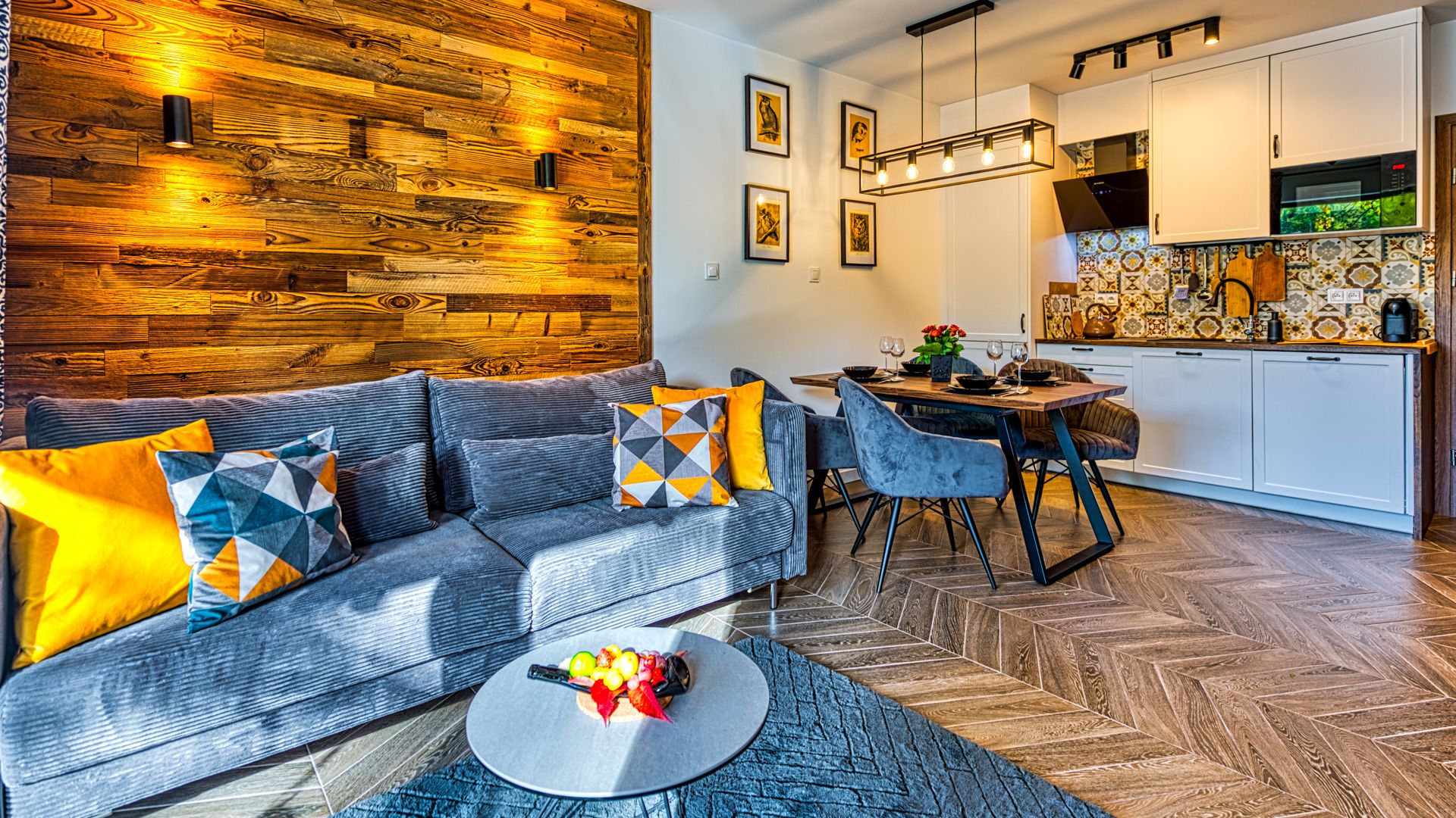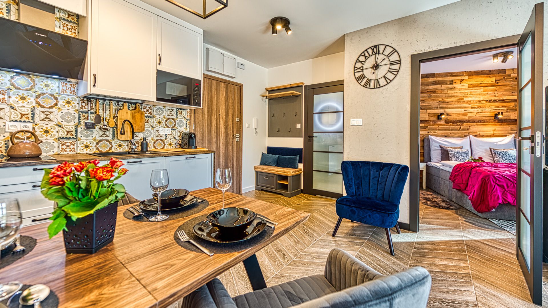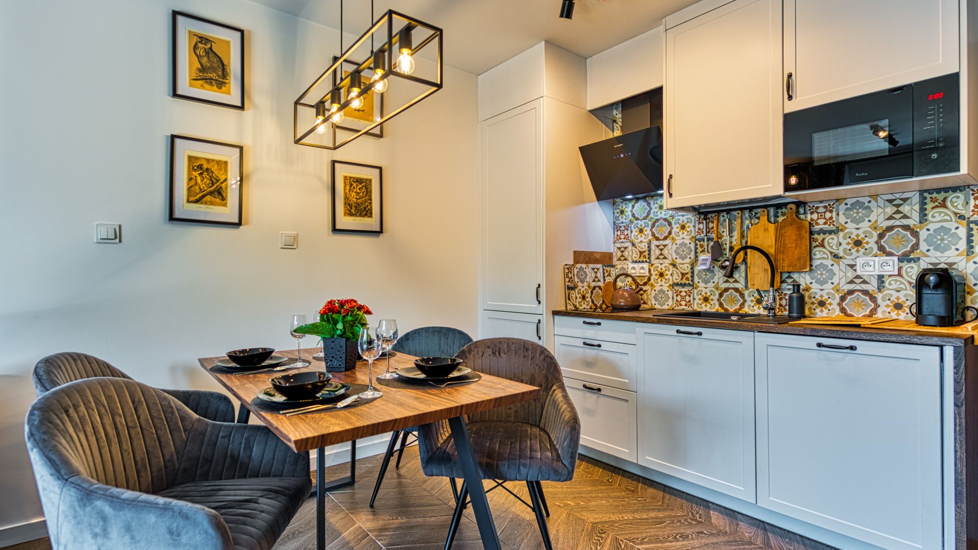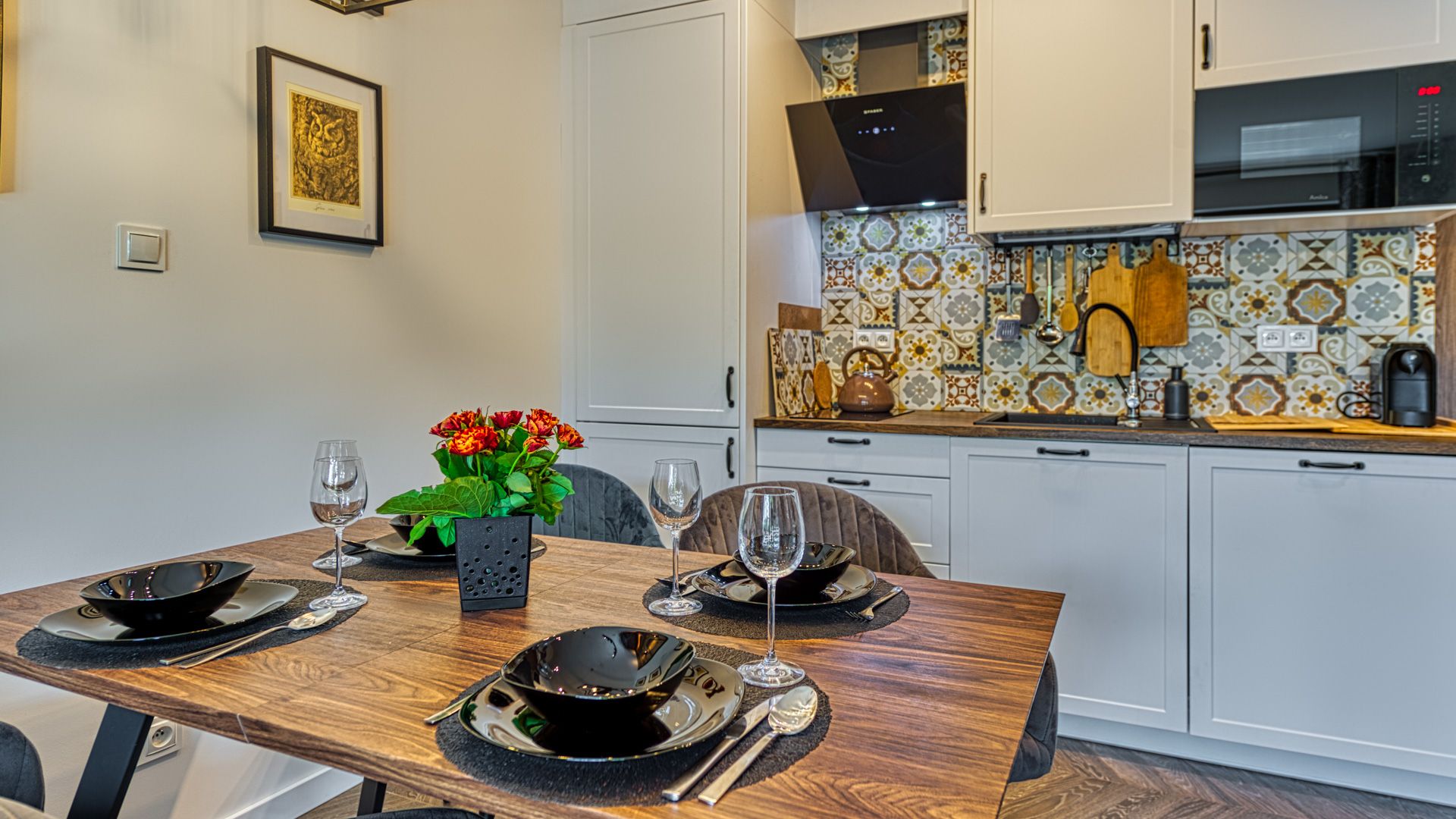 W pełni doposażony aneks kuchenny umożliwi przygotowanie nawet uroczystej kolacji. W skład wyposażenia wchodzą m.in.: talerze i sztućce, płyta kuchenna wraz z garnkami i patelnią, lodówka, zmywarka, mikrofalówka oraz ekspres do kawy. Przy jadalnym stole przewidziano miejsce dla 4-ech osób.
