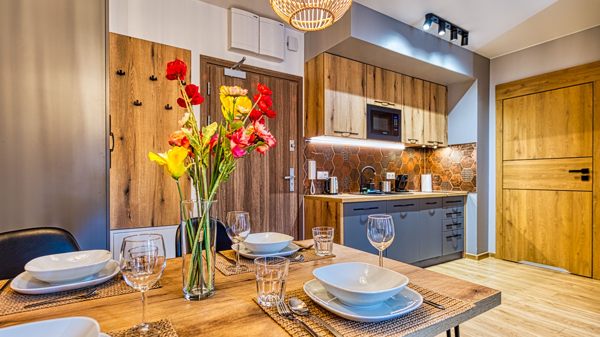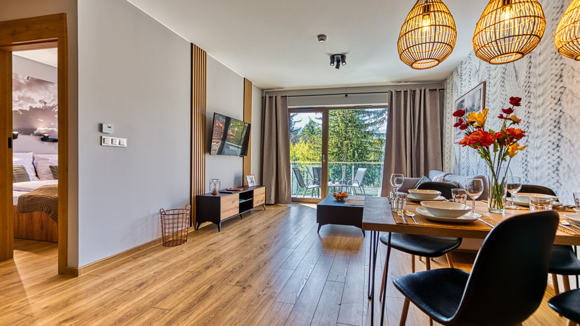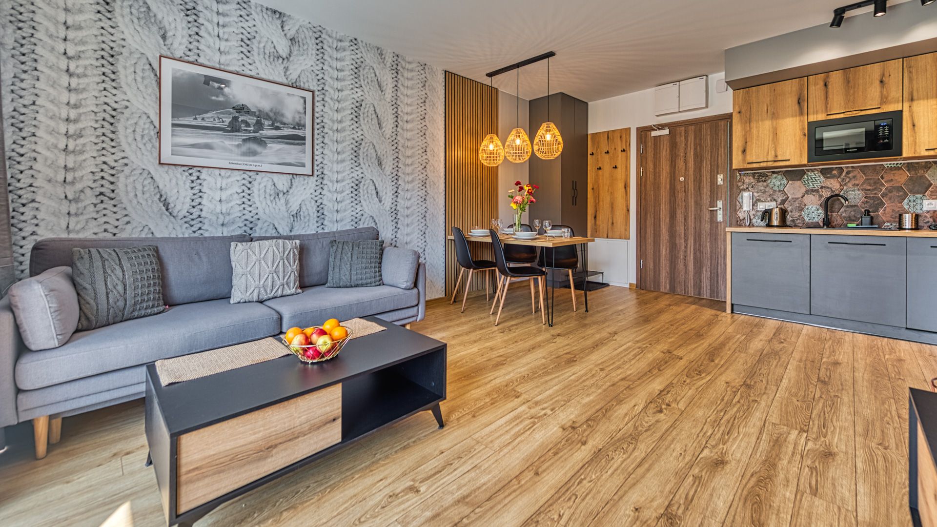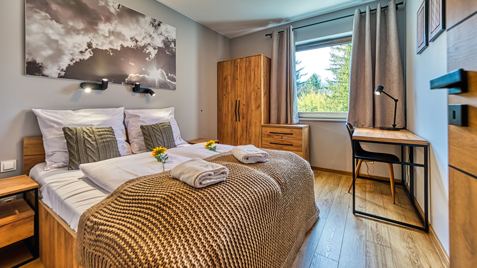Prezentowany apartament jest częścią prestiżowego kompleksu Stone Hill w samym centrum Szklarskiej Poręby. To nowoczesny, dwupokojowy apartament o powierzchni 38m2. W sypialni znajduje się wygodne małżeńskie łoże, duża szafa i biurko. Do dyspozycji gości jest również składane łóżeczko dziecięce. Część dzienna apartamentu zaopatrzona w rozkładaną sofę i płaski telewizor, połączona jest z w pełni wyposażonym aneksem kuchennym. W skład aneksu wchodzą m.in. płyta grzewcza, czajnik, talerze i sztućce, lodówka, ekspres do kawy, zmywarka, etc. Łazienka apartamentu jest elegancka i wyposażona w prysznic, umywalkę, toaletę i pralkę. Wszystkie niezbędne ręczniki i przybory toaletowe są dostępne na miejscu, aby zapewnić wygodę i komfort podczas pobytu.