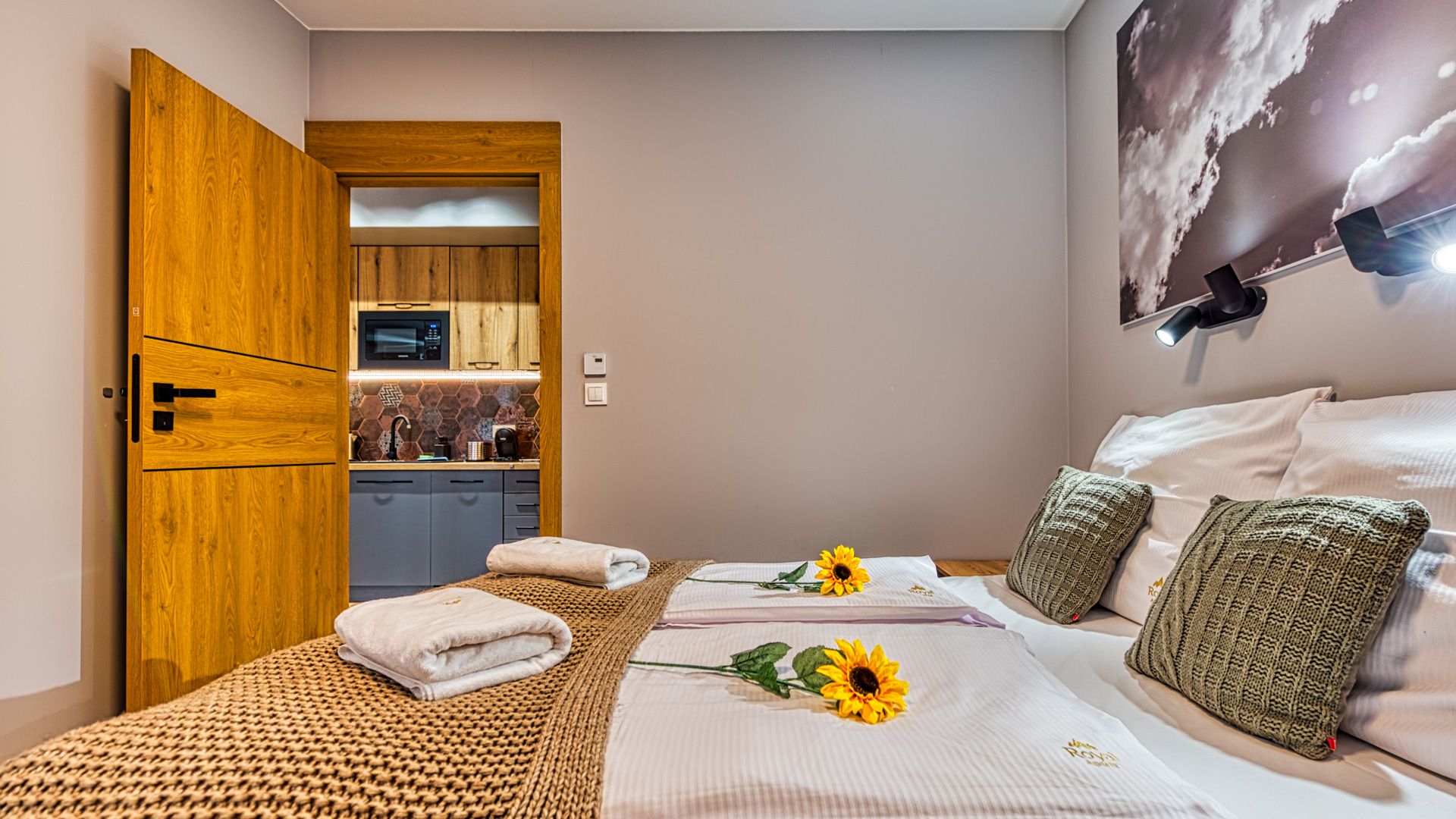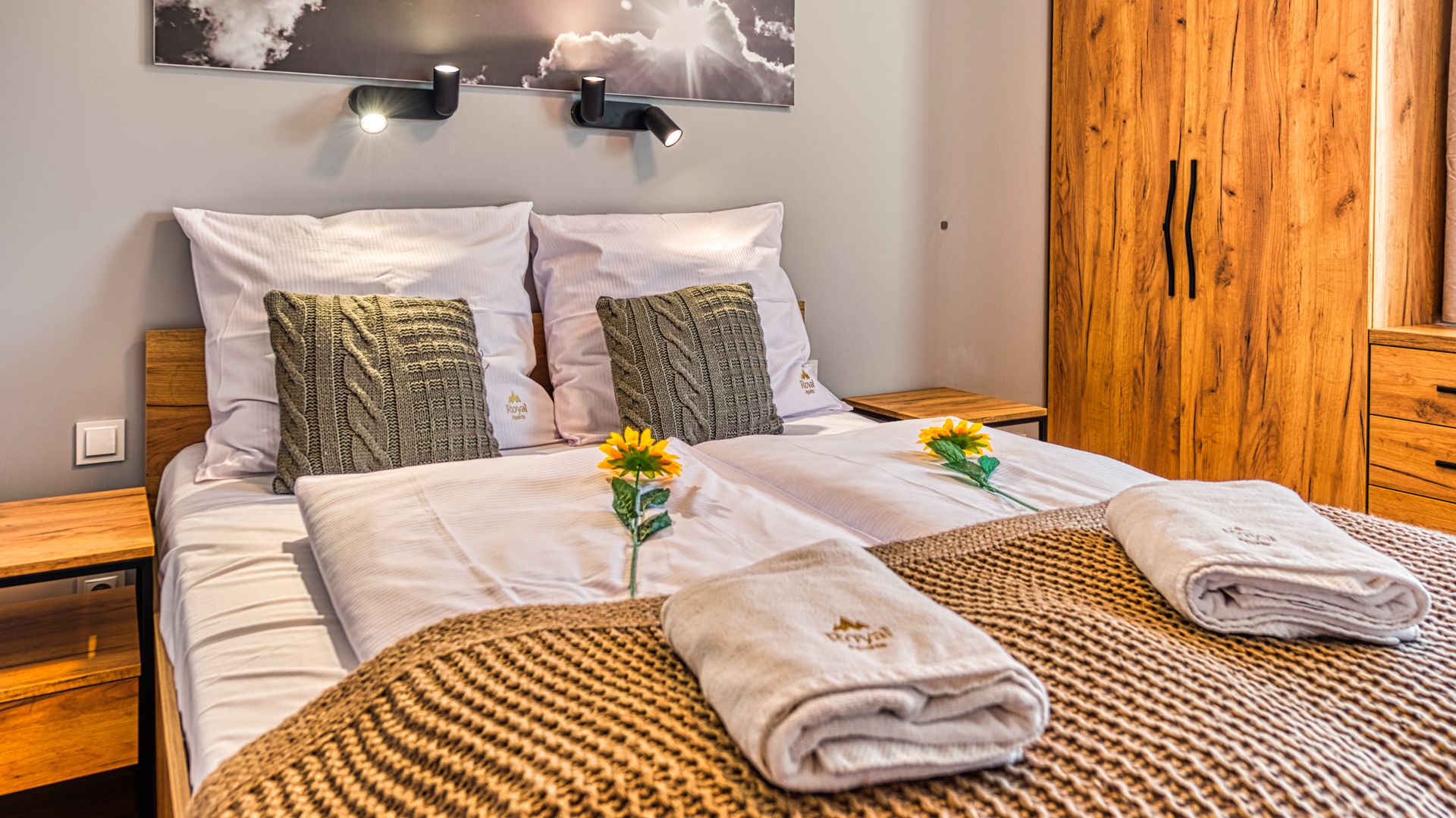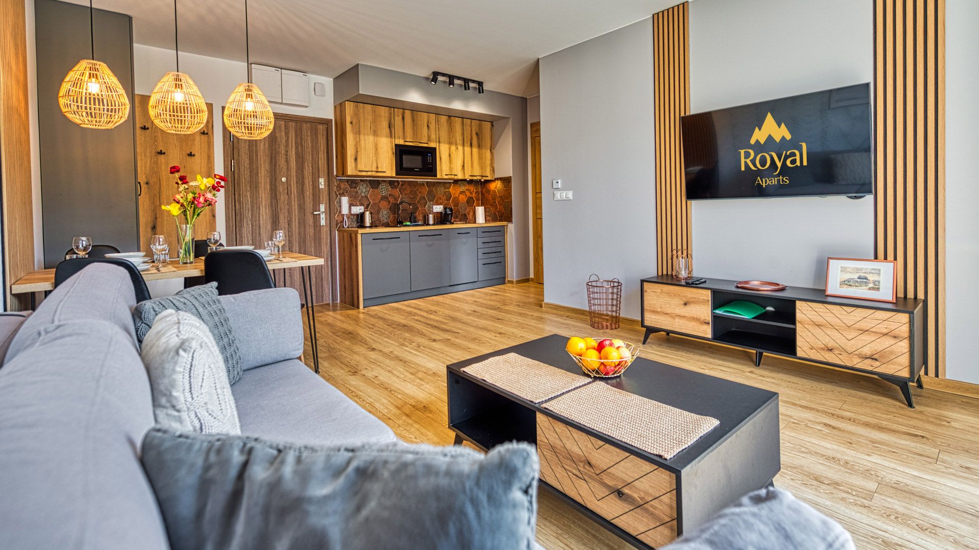 Prezentowany apartament jest częścią prestiżowego kompleksu Stone Hill w samym centrum Szklarskiej Poręby. To nowoczesny, dwupokojowy apartament o powierzchni 38m2. W sypialni znajduje się wygodne małżeńskie łoże, duża szafa i biurko. Do dyspozycji gości jest również składane łóżeczko dziecięce. Część dzienna apartamentu zaopatrzona w rozkładaną sofę i płaski telewizor, połączona jest z w pełni wyposażonym aneksem kuchennym. W skład aneksu wchodzą m.in. płyta grzewcza, czajnik, talerze i sztućce, lodówka, ekspres do kawy, zmywarka, etc. Łazienka apartamentu jest elegancka i wyposażona w prysznic, umywalkę, toaletę i pralkę. Wszystkie niezbędne ręczniki i przybory toaletowe są dostępne na miejscu, aby zapewnić wygodę i komfort podczas pobytu.