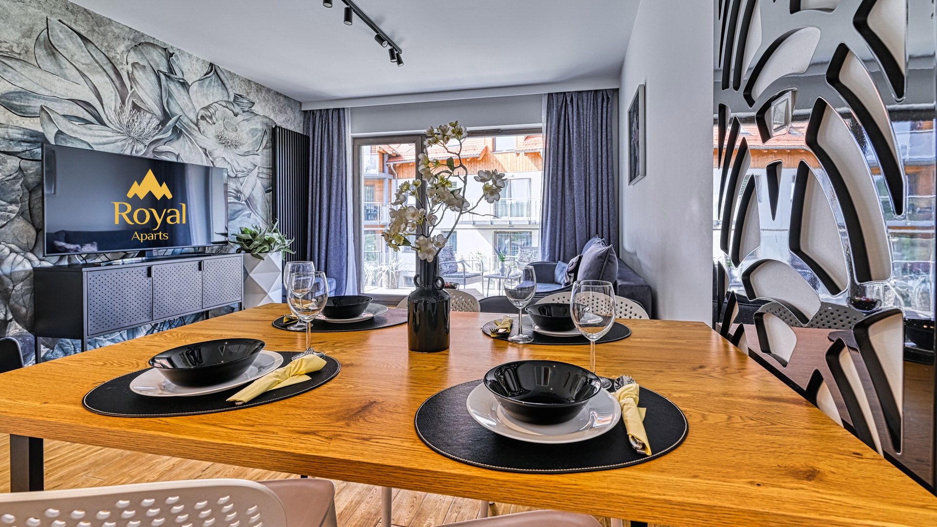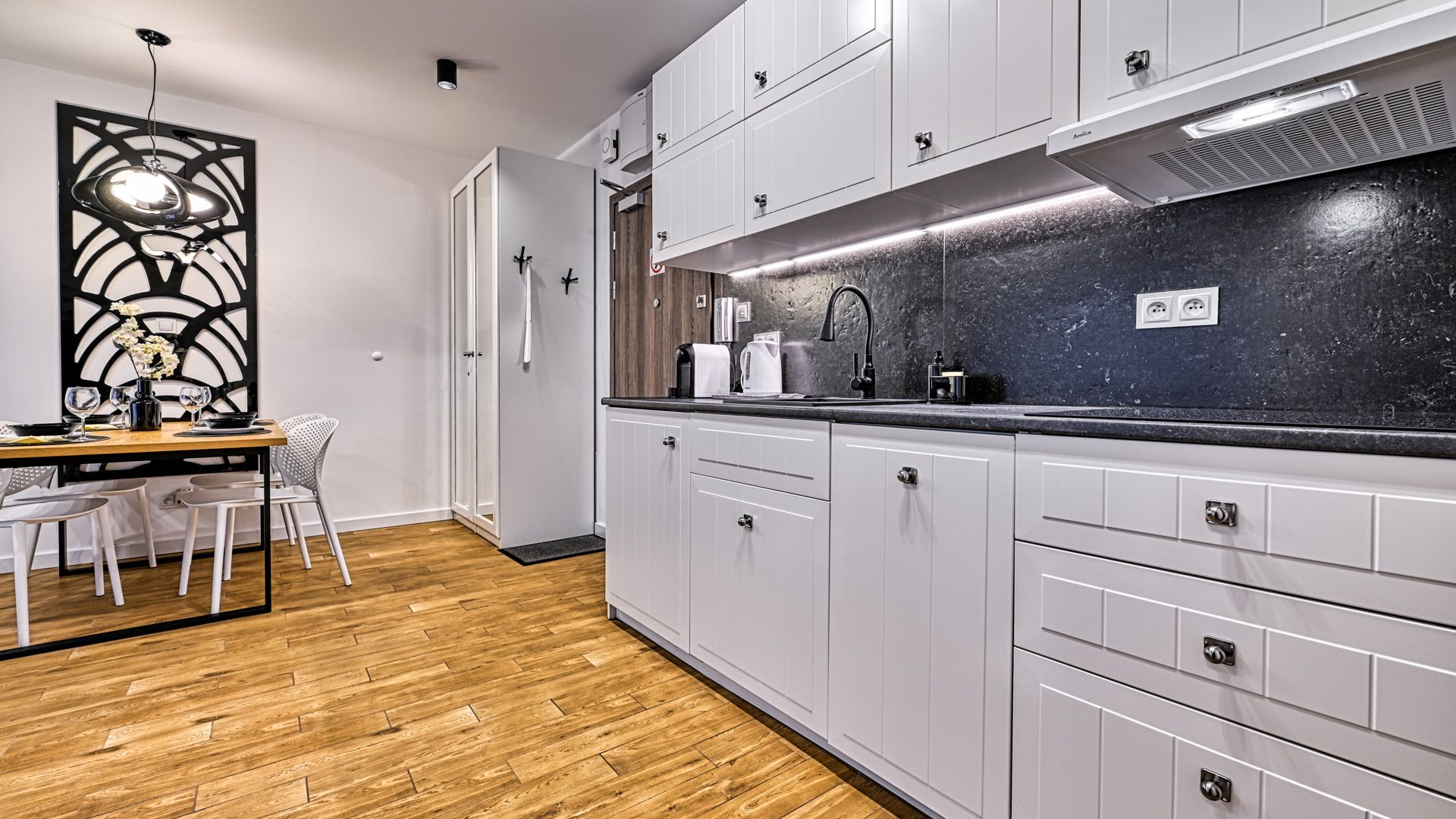 W pełni doposażony aneks kuchenny umożliwi przygotowanie nawet uroczystej kolacji. W skład wyposażenia wchodzą m.in.: talerze i sztućce, płyta kuchenna wraz z garnkami i patelnią, lodówka, zmywarka oraz ekspres do kawy. Przy jadalnym stole przewidziano miejsce dla 4-ech osób.