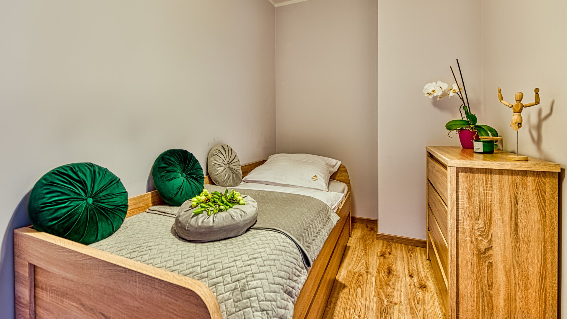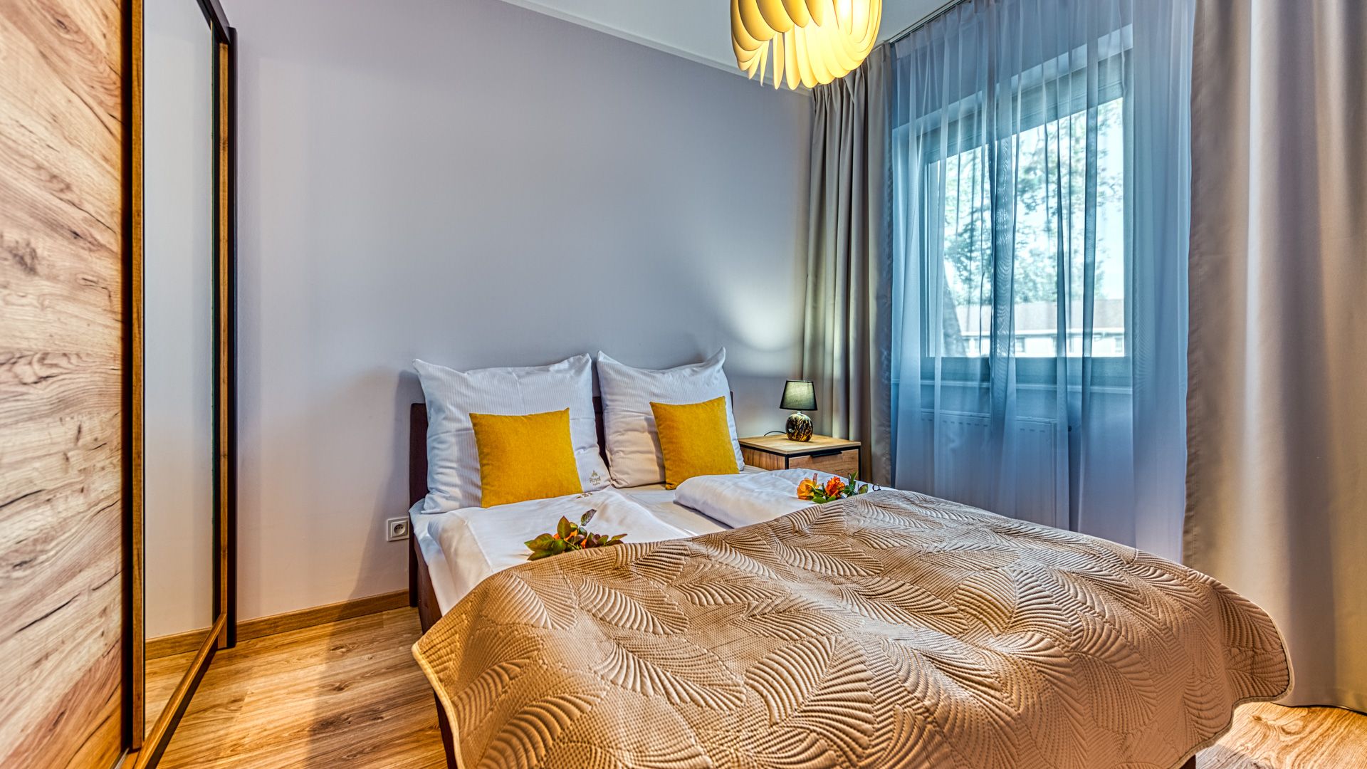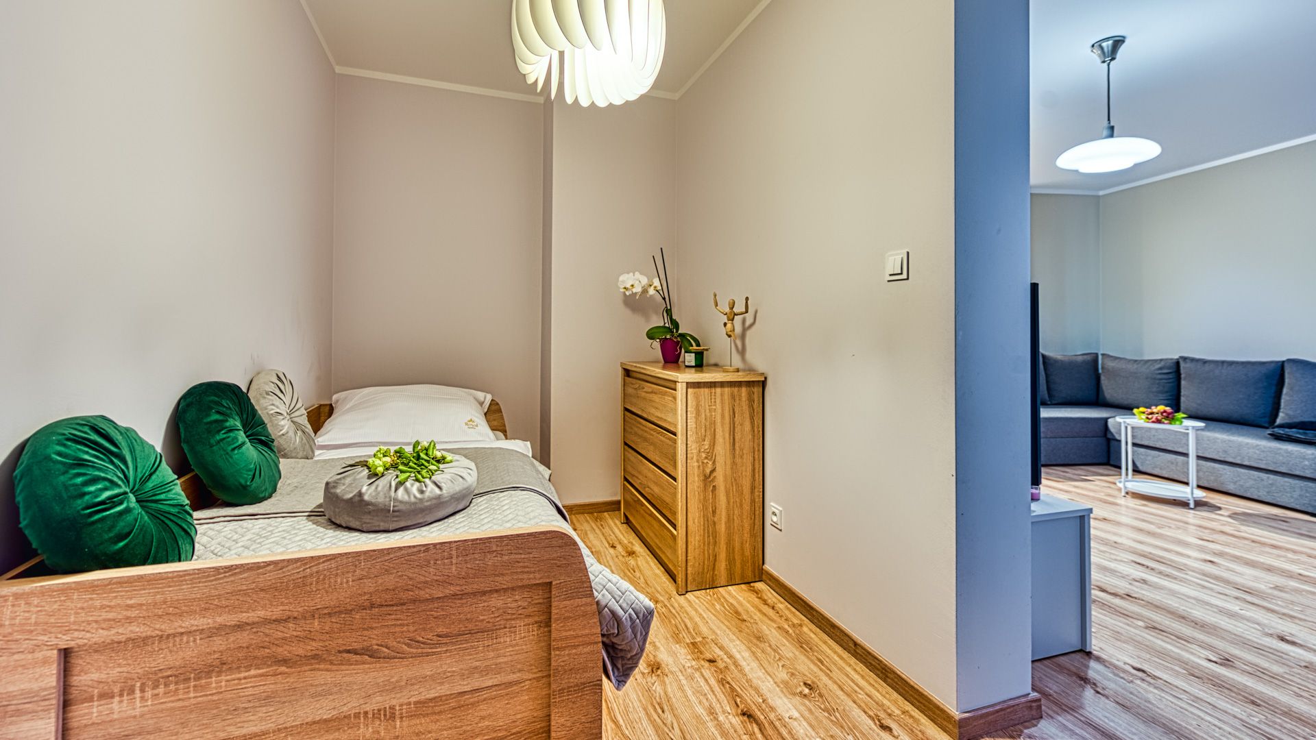 W sypialni znajdziemy wygodne podwójne łóżko. Drugi pokój sypialny wyposażony jest w łóżko pojedyncze.