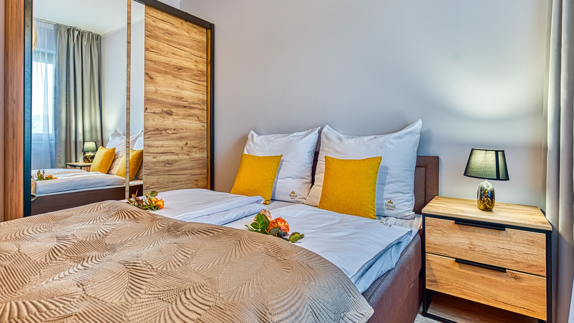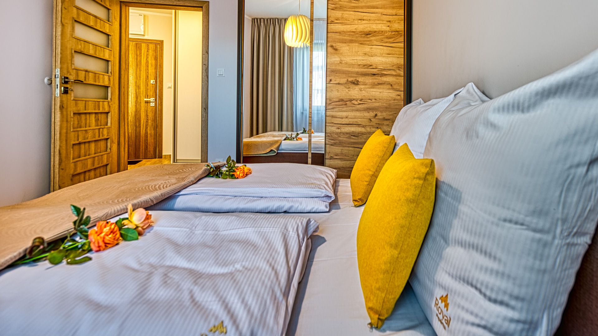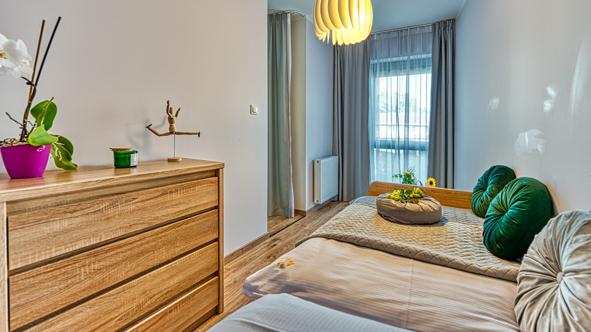 W sypialni znajdziemy wygodne podwójne łóżko. Drugi pokój sypialny wyposażony jest w łóżko pojedyncze.