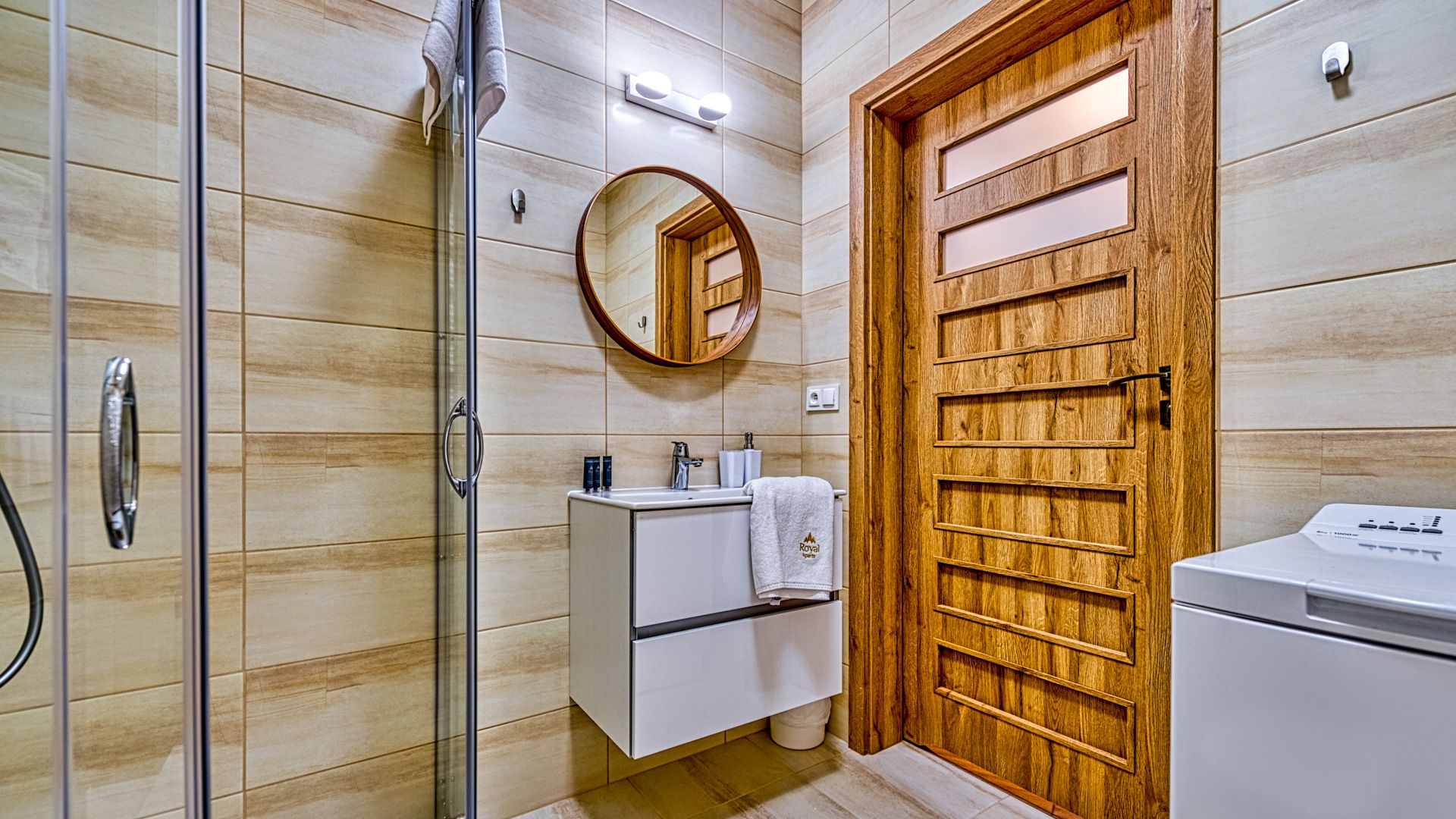 Całość domyka estetyczna łazienka z prysznicem i pralką.
