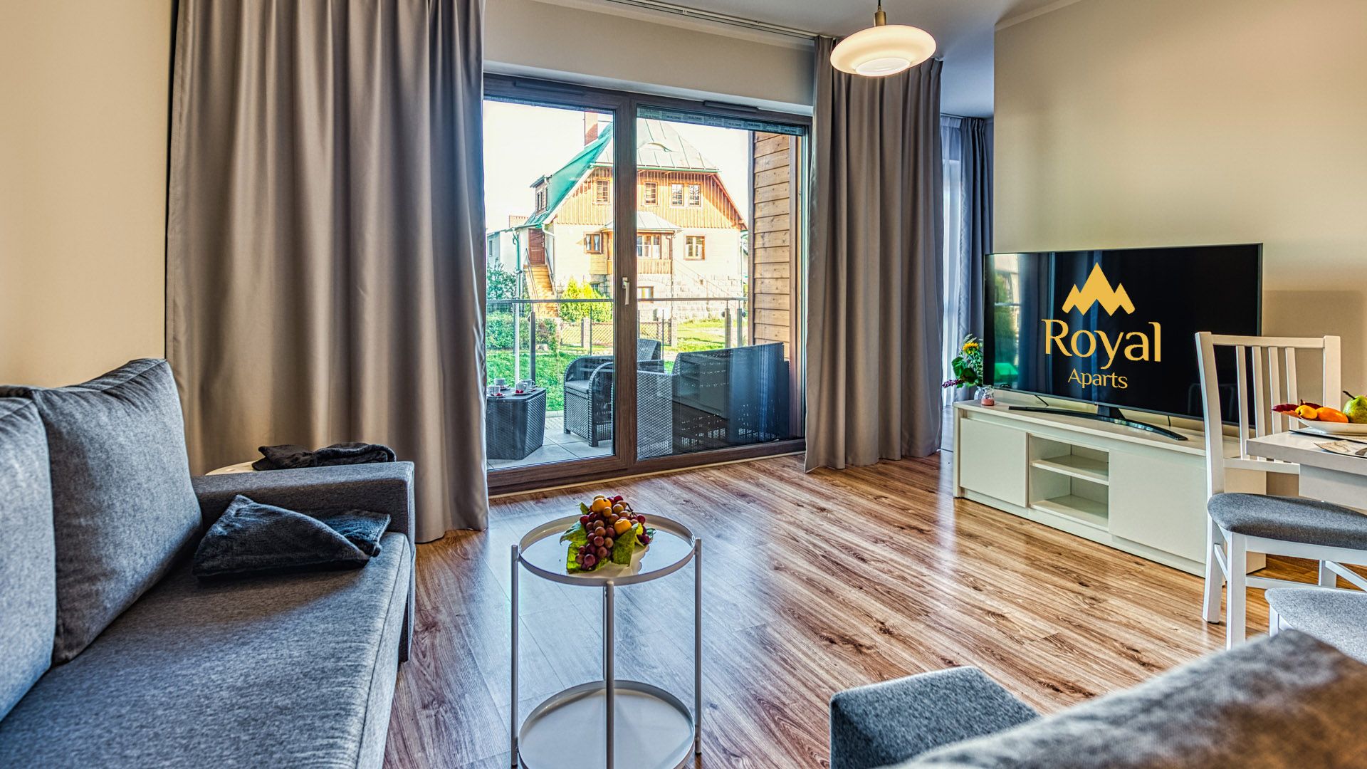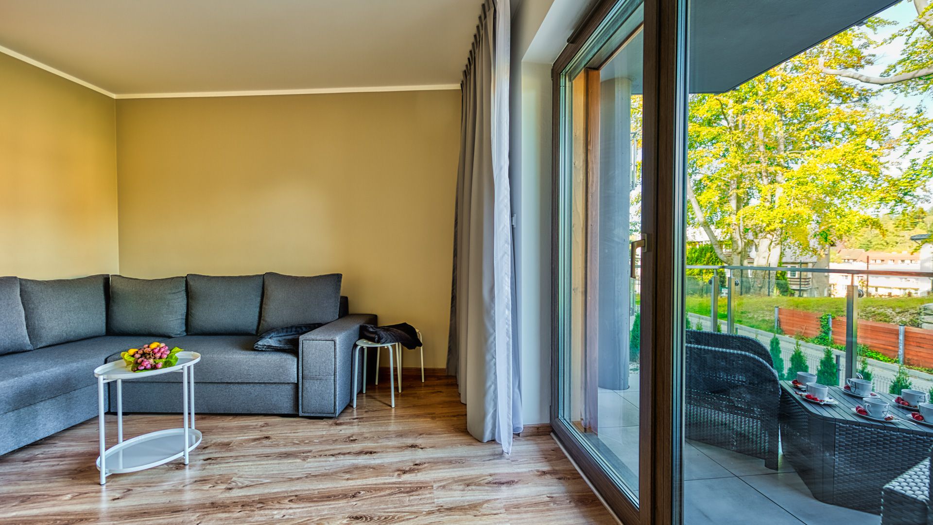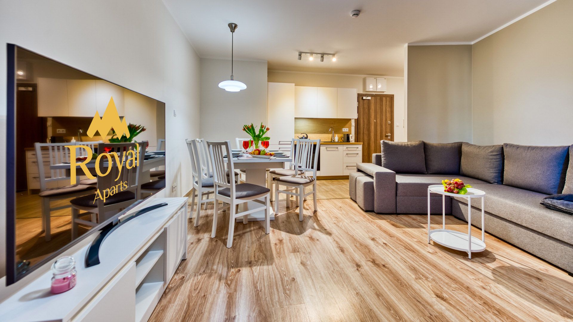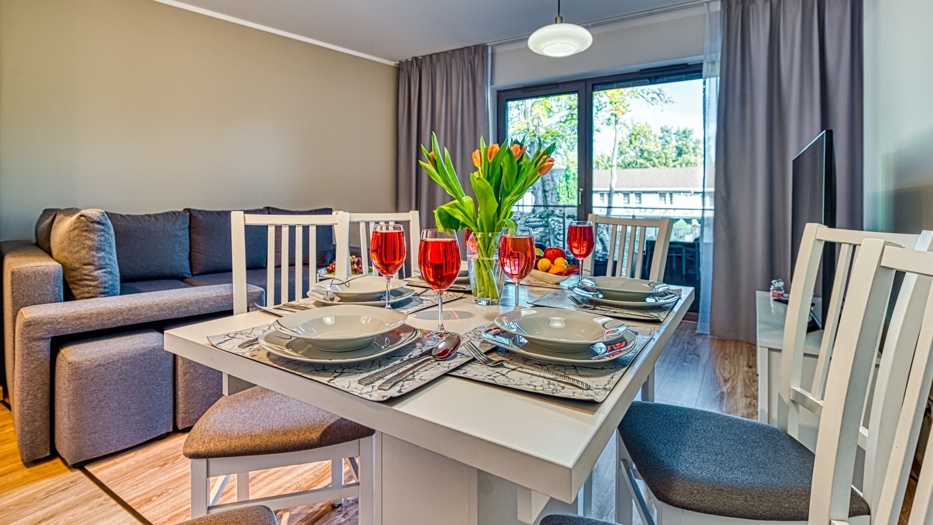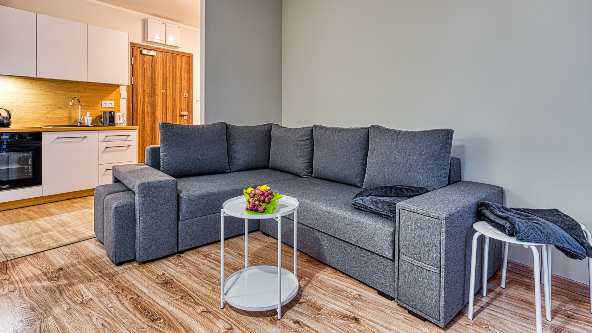 Część dzienna apartamentu składa się z salonu połączonego z aneksem kuchennym i wyposażona jest w rozkładaną sofę oraz stół kuchenny.