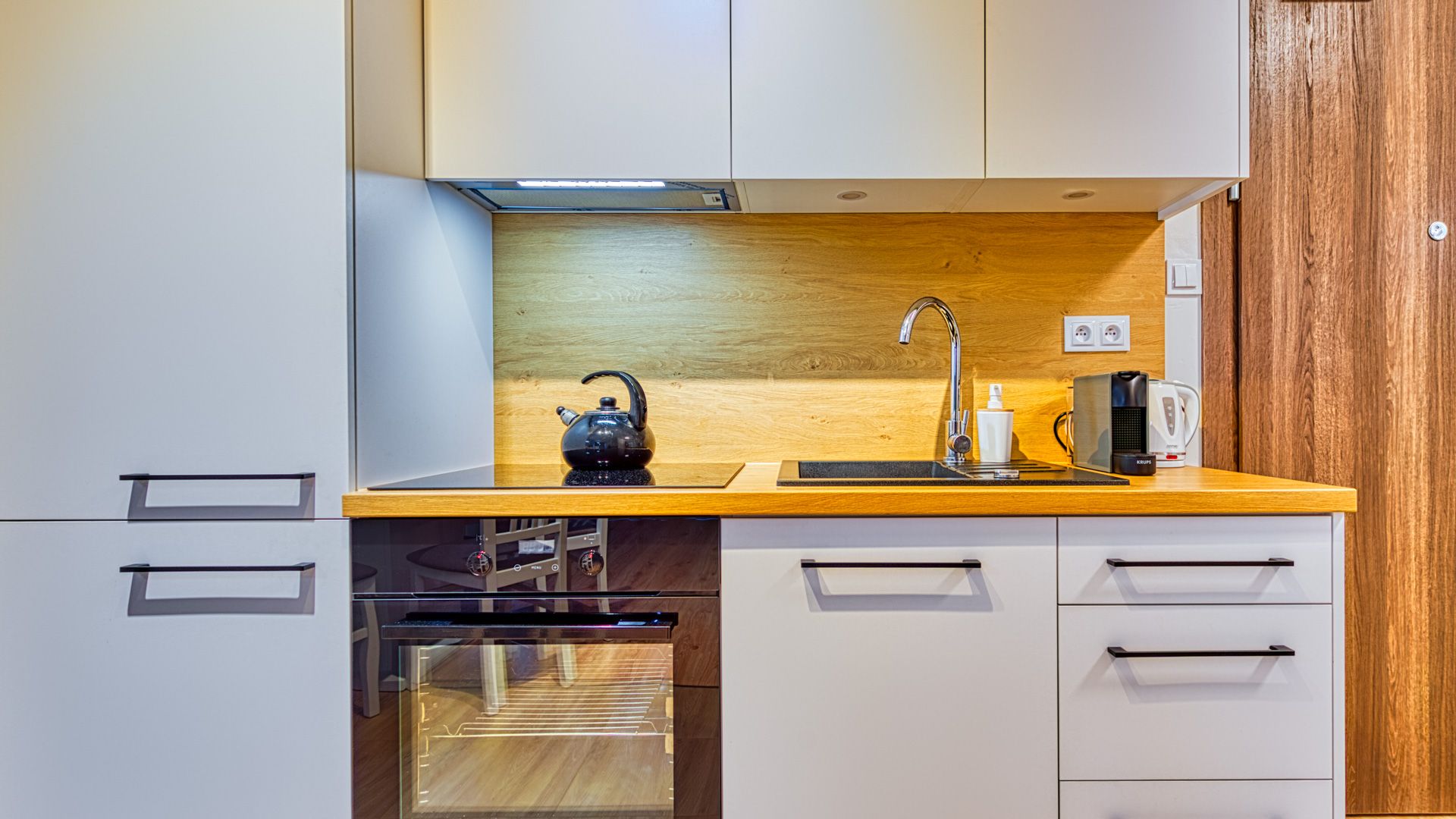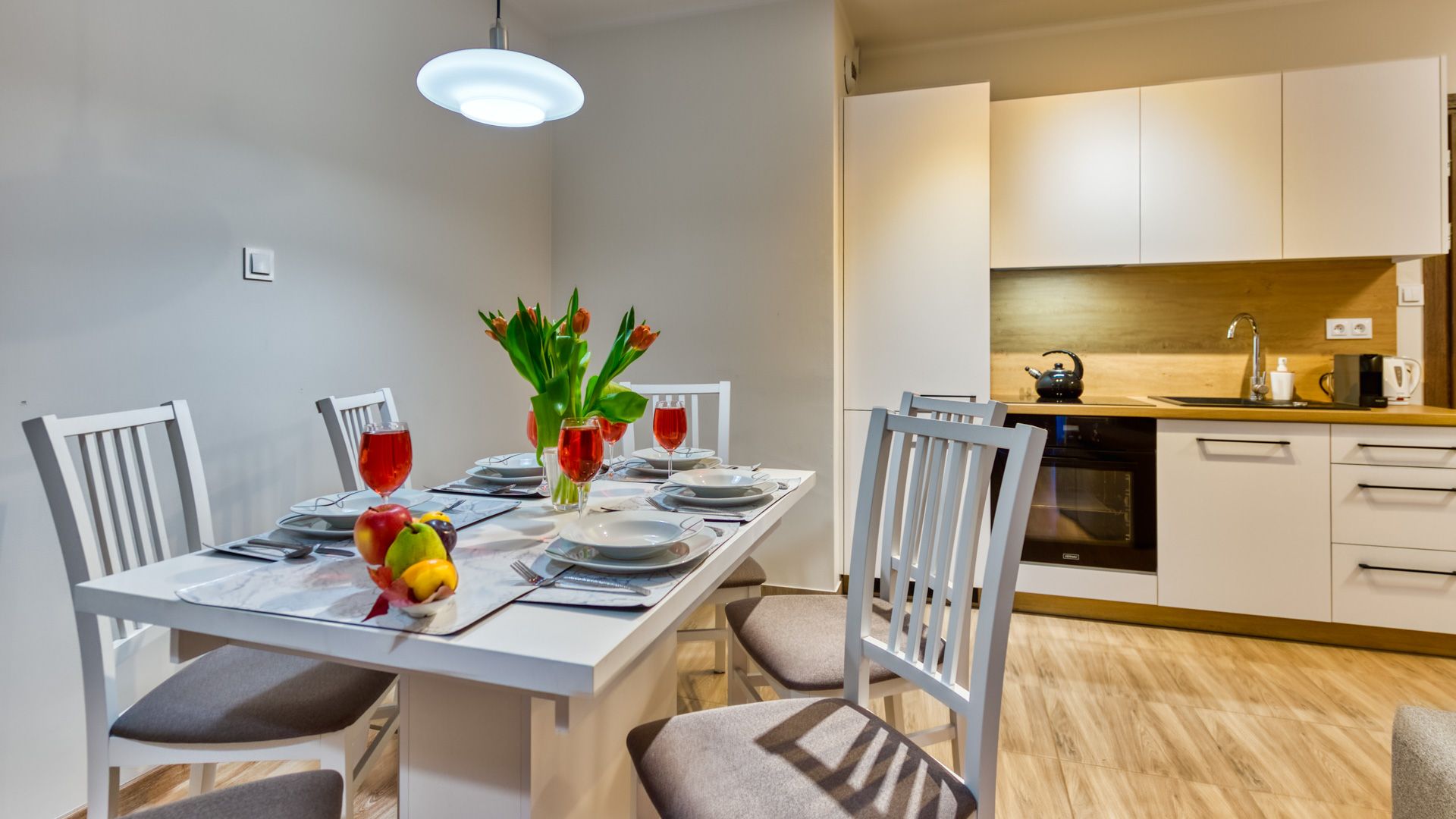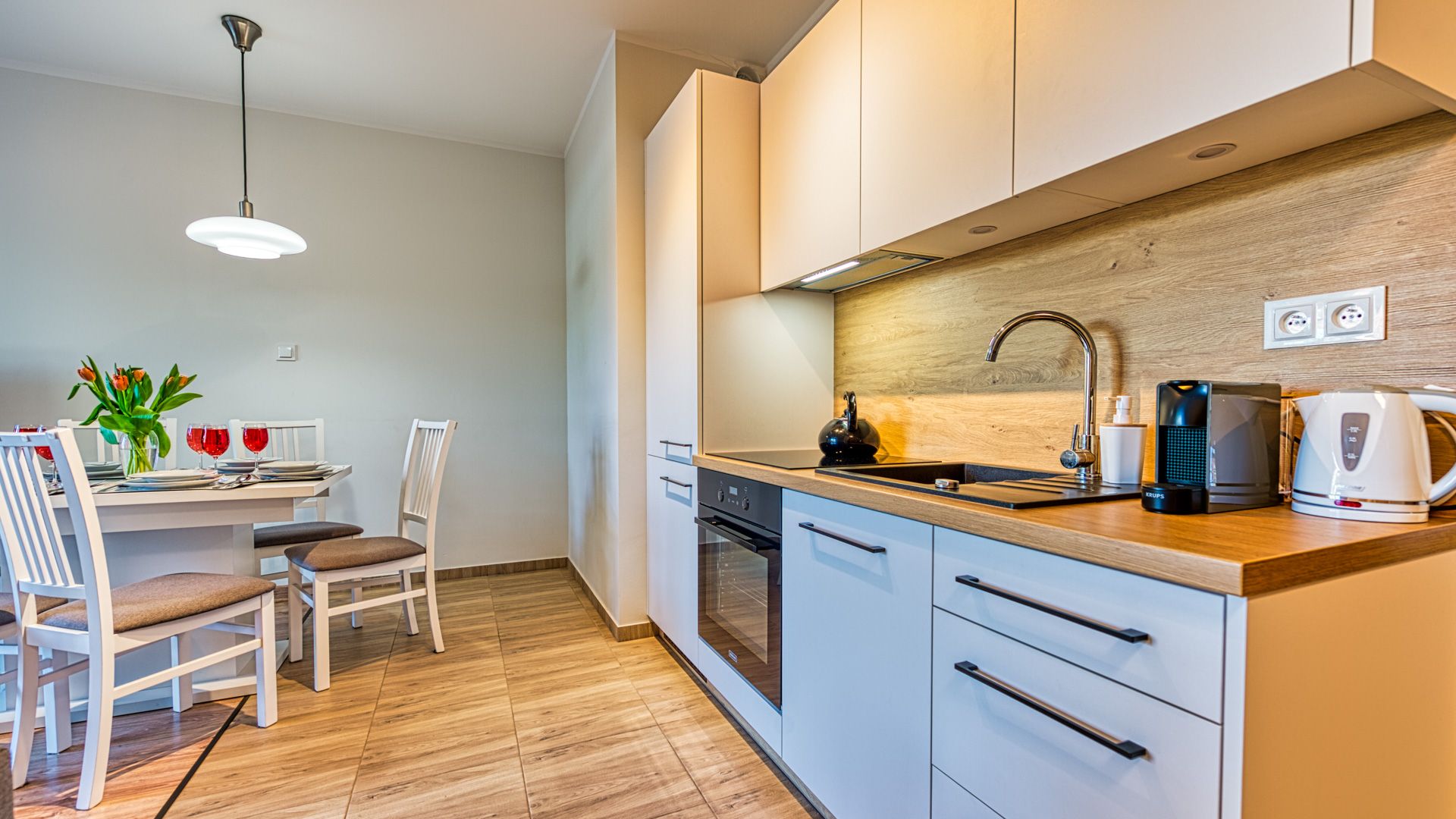 W pełni doposażony aneks kuchenny umożliwi przygotowanie nawet uroczystej kolacji dla wszystkich Gości apartamentu. W skład wyposażenia wchodzą m.in.: talerze i sztućce, płyta kuchenna wraz z garnkami i patelnią, lodówka, opiekacz/toster, piekarnik oraz ekspres do kawy.