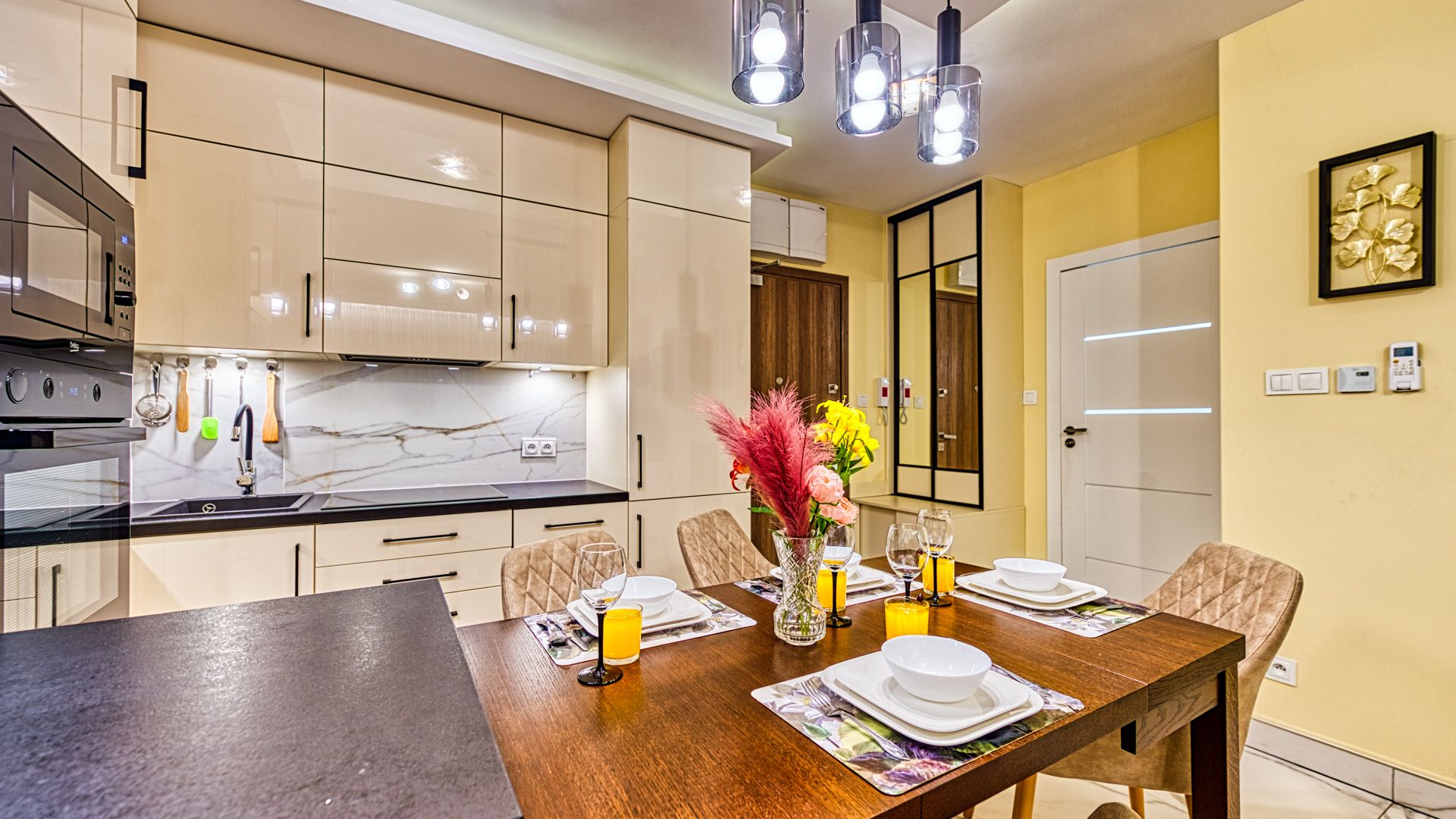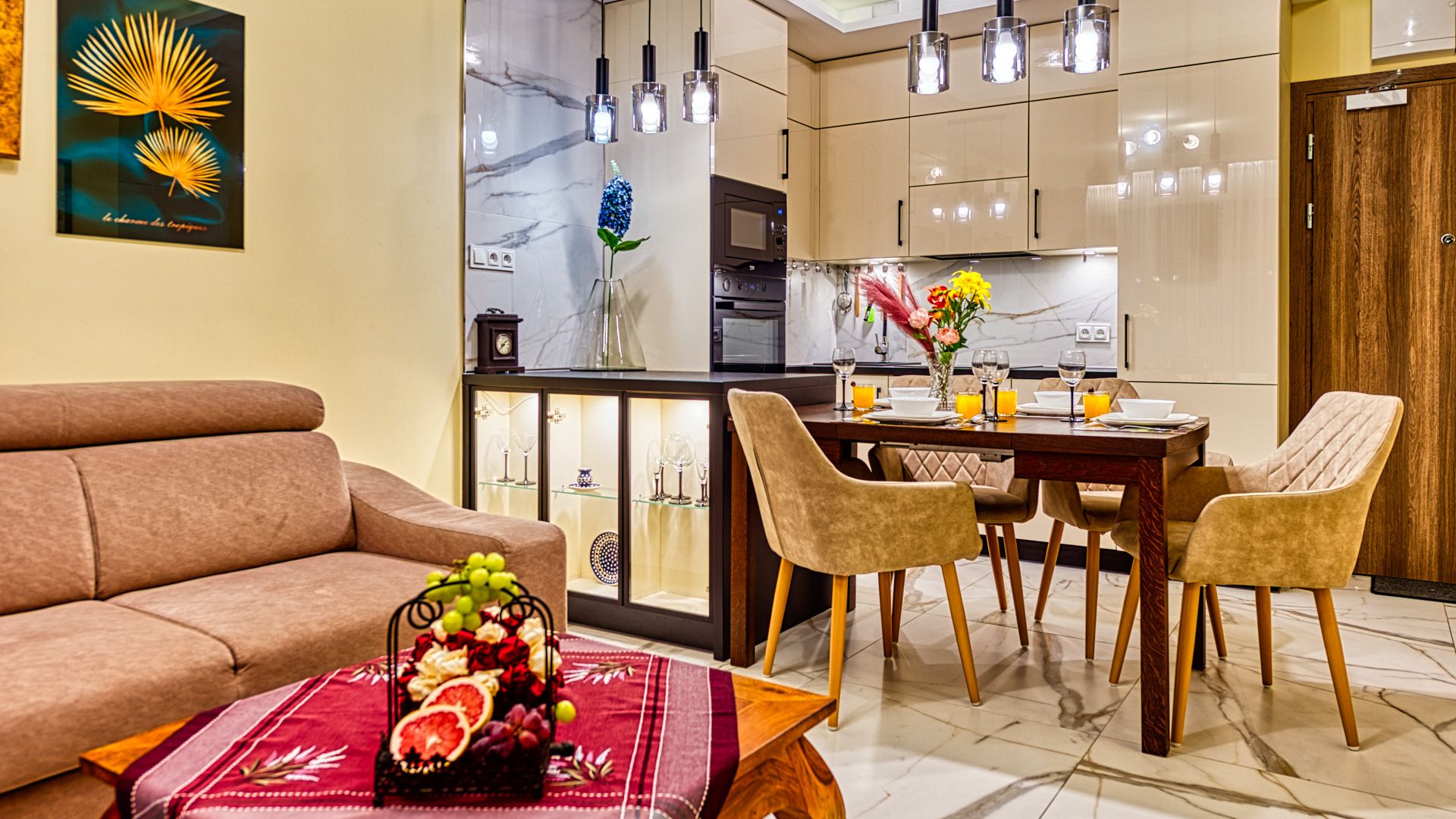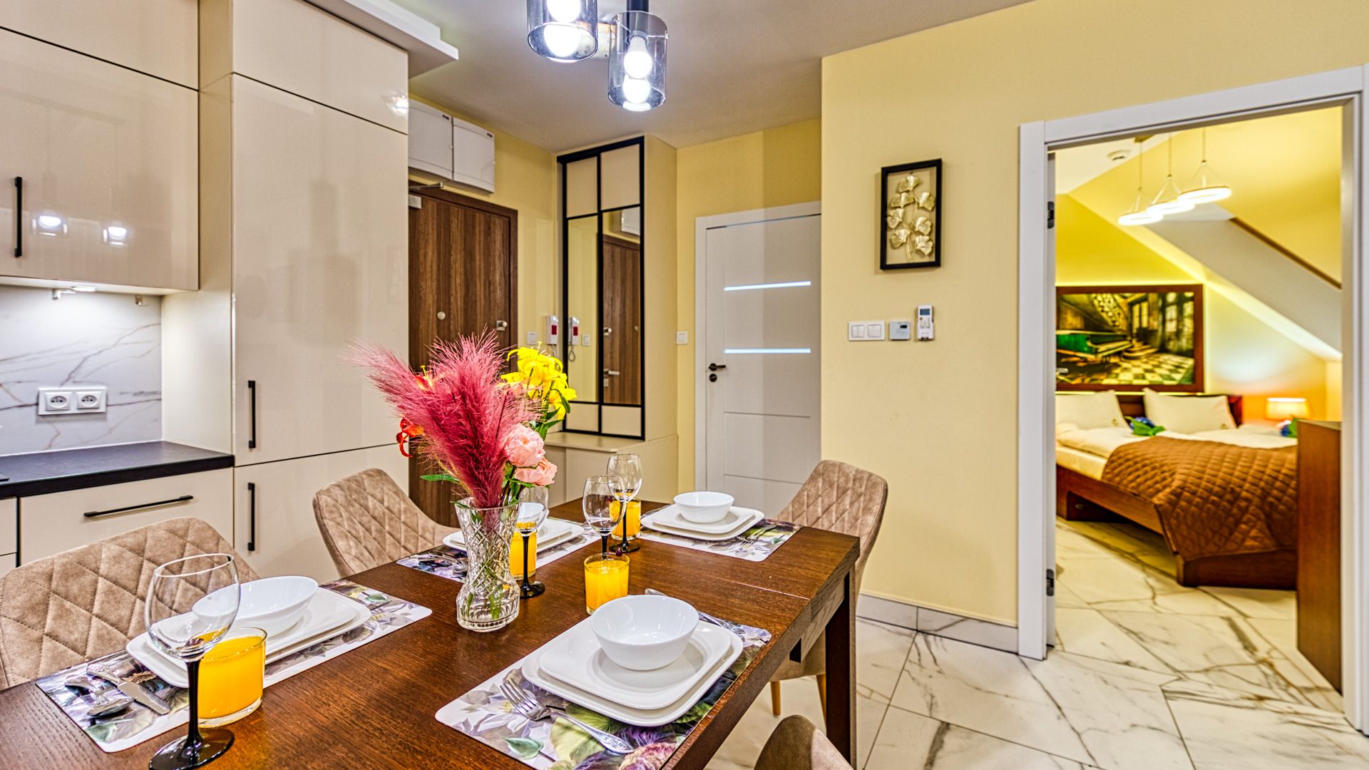 Sypialnia jest gustownie urządzona i wyposażona w wygodne łóżko dla dwóch osó. Salon z aneksem kuchennym to idealne miejsce do wspólnych posiłków i spotkań. Aneks kuchenny jest nowoczesny i w pełni wyposażony, oferując lodówkę, zmywarkę, płytę grzewczą, czajnik, ekspres do kawy oraz zestaw naczyń i sztućców. Nowoczesna łazienka wyposażona w prysznic. Zapewniamy świeże ręczniki oraz podstawowe przybory toaletowe. Balkon apartamentu to idealne miejsce do relaksu i odpoczynku na świeżym powietrzu. Jest przestronny i dobrze urządzony, oferując wygodne meble ogrodowe, na których można zrelaksować się przy kawie lub książce.