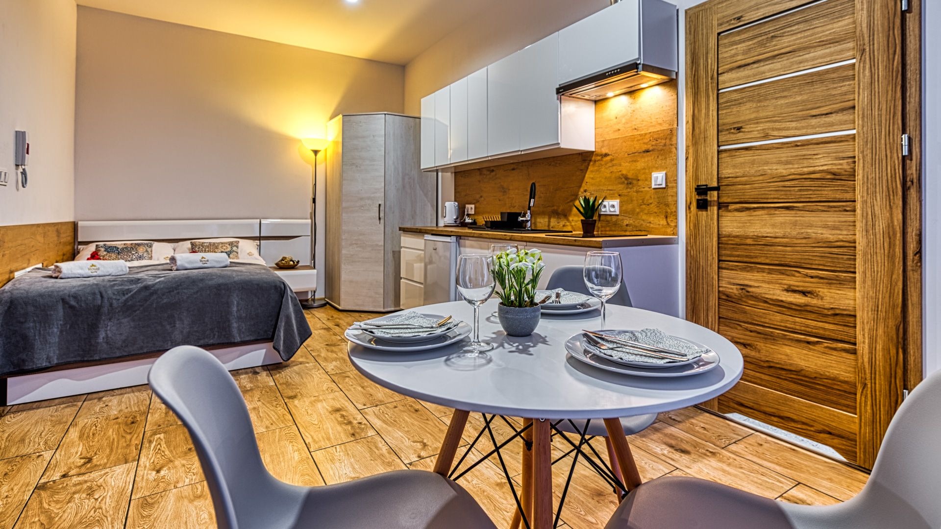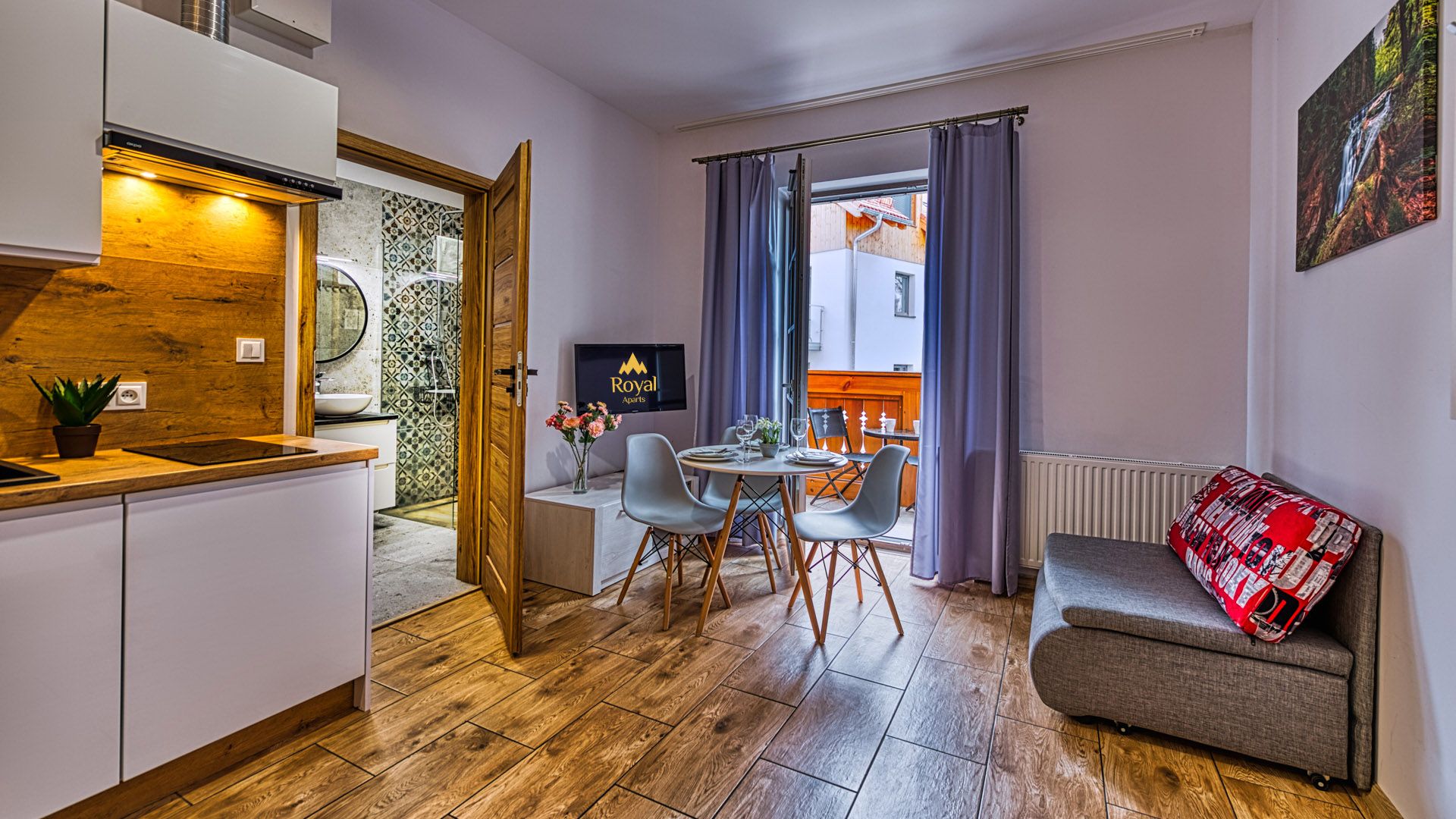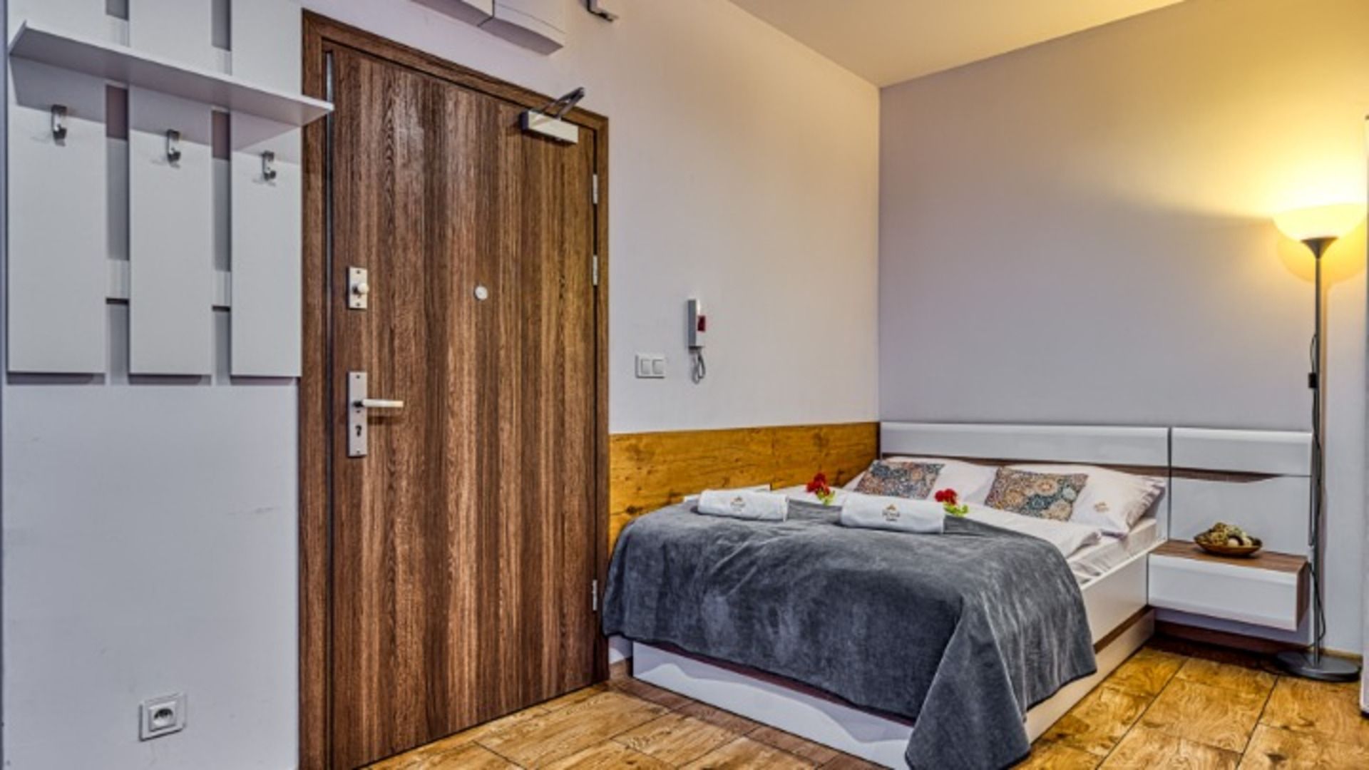 Po wejściu do apartamentu zostaniesz powitany przez przestronny salon połączony z aneksem kuchennym i miejscami sypialnymi w postaci podwójnego łóżka i rozkładanego fotelu zachęcających do odpoczynku po długim dniu zwiedzania.
