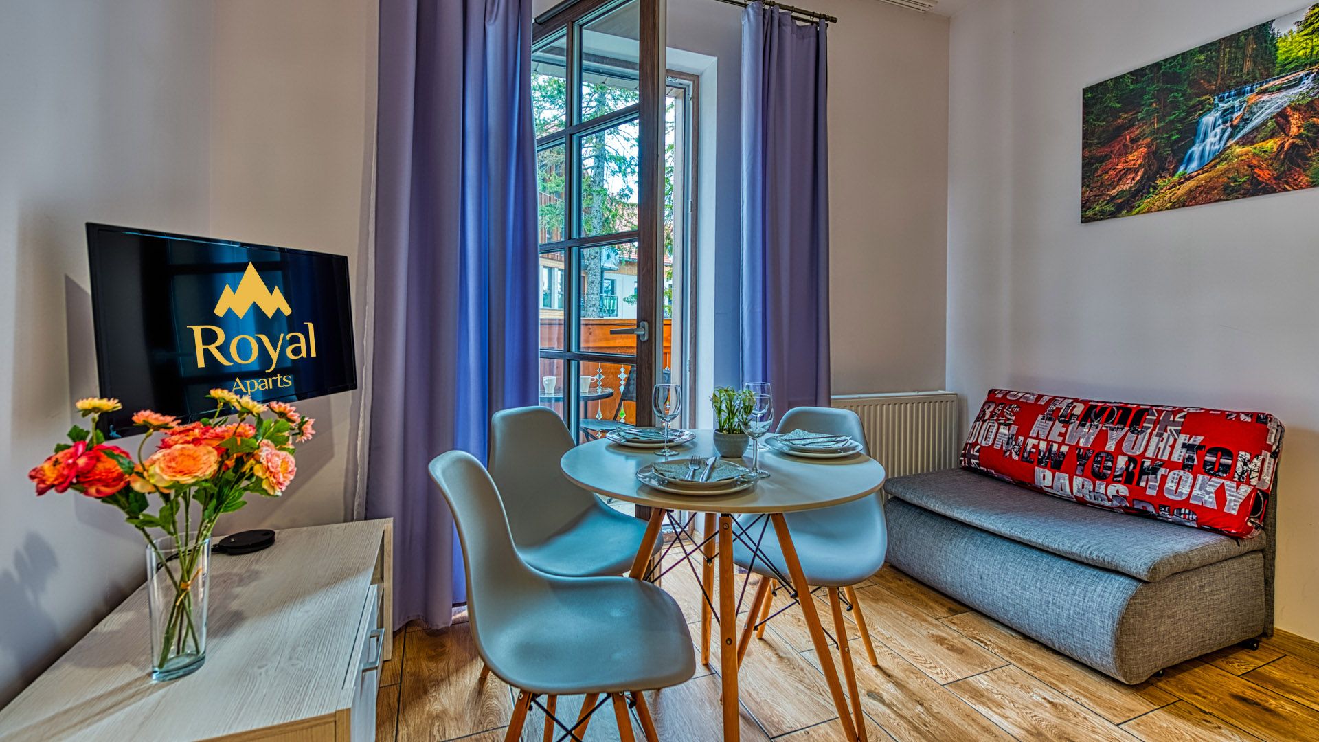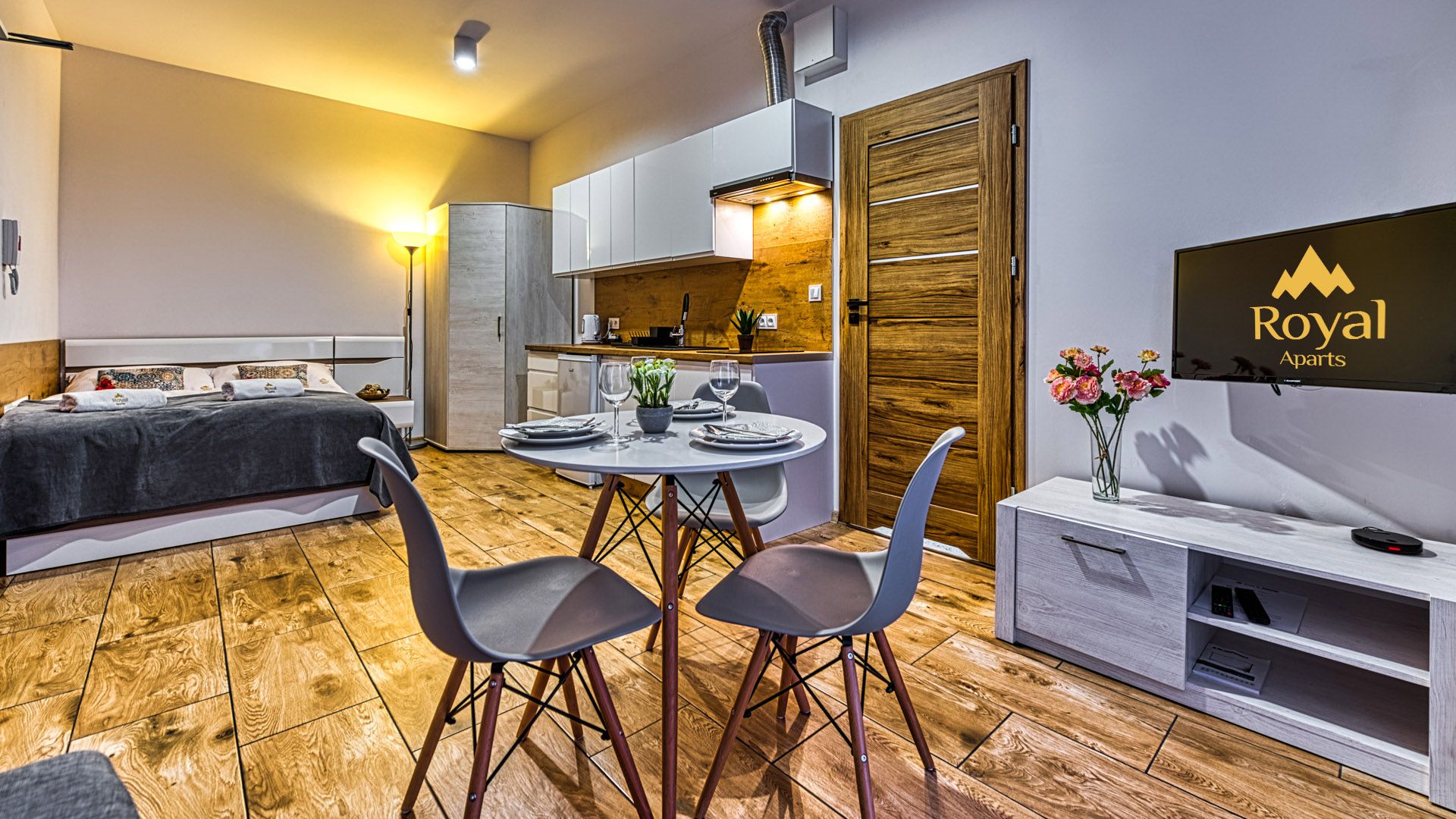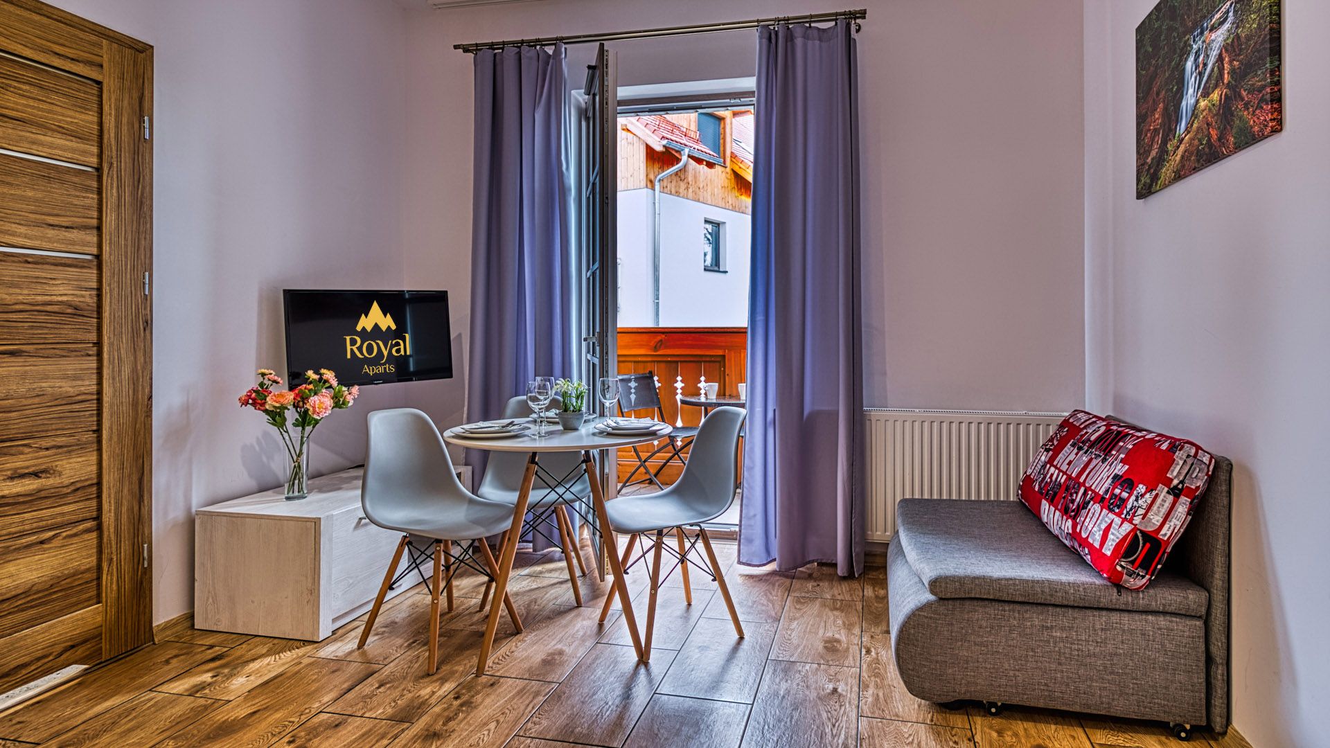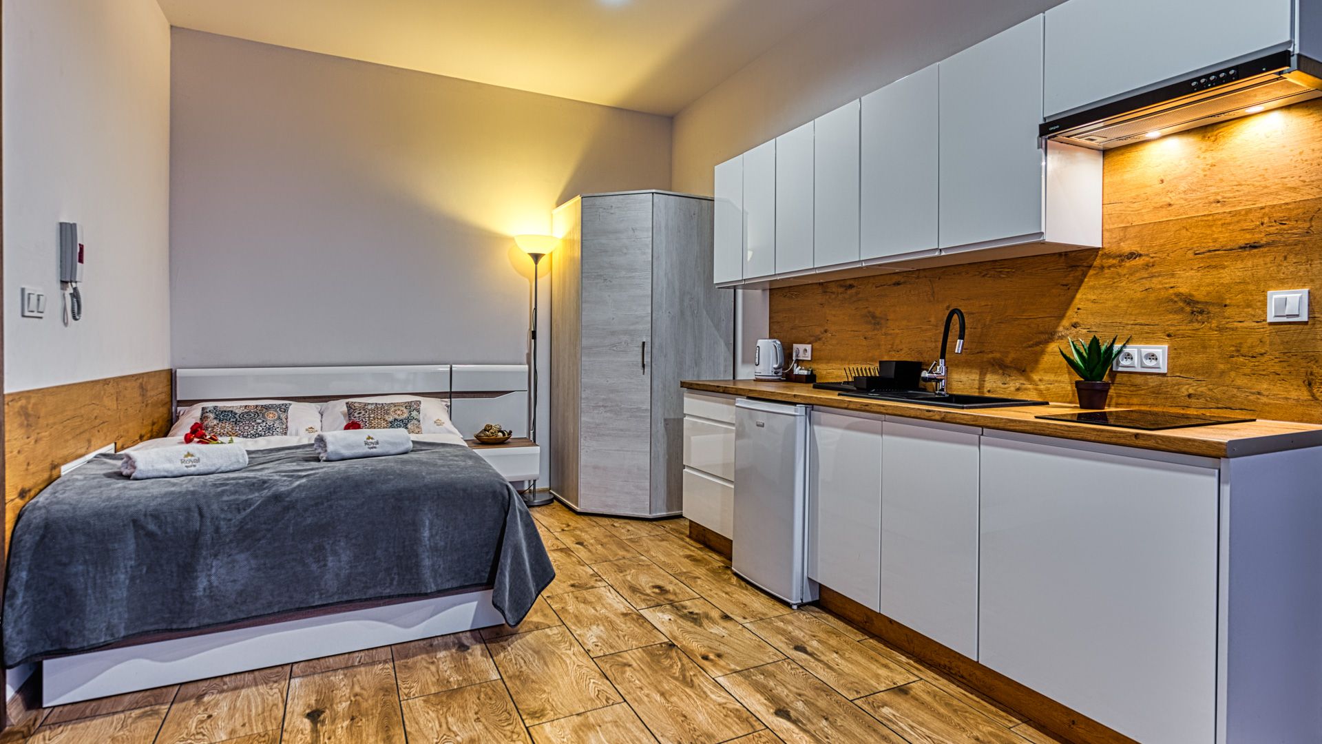 Po wejściu do apartamentu zostaniesz powitany przez przestronny salon połączony z aneksem kuchennym i miejscami sypialnymi w postaci podwójnego łóżka i rozkładanego fotelu zachęcających do odpoczynku po długim dniu zwiedzania.
