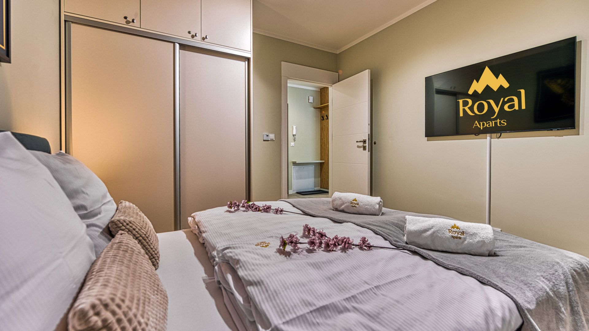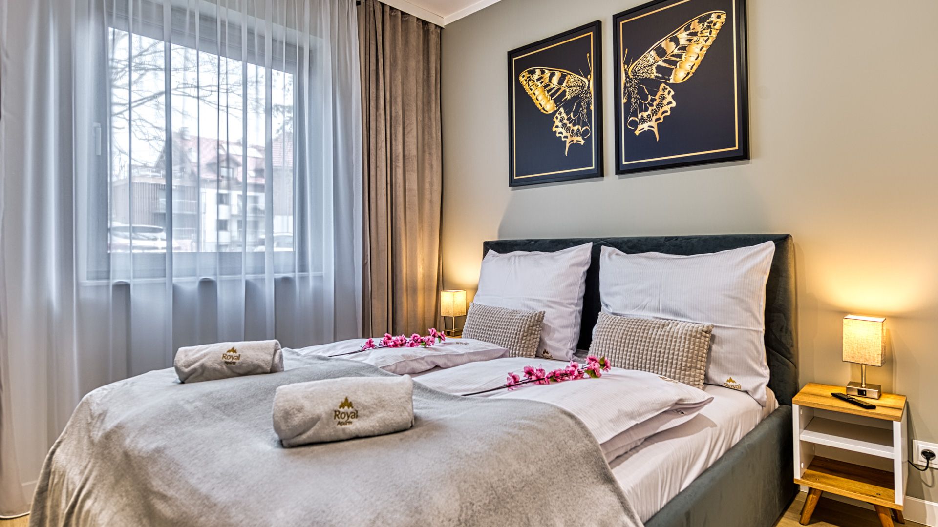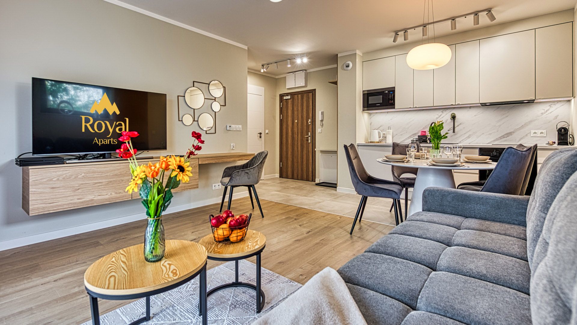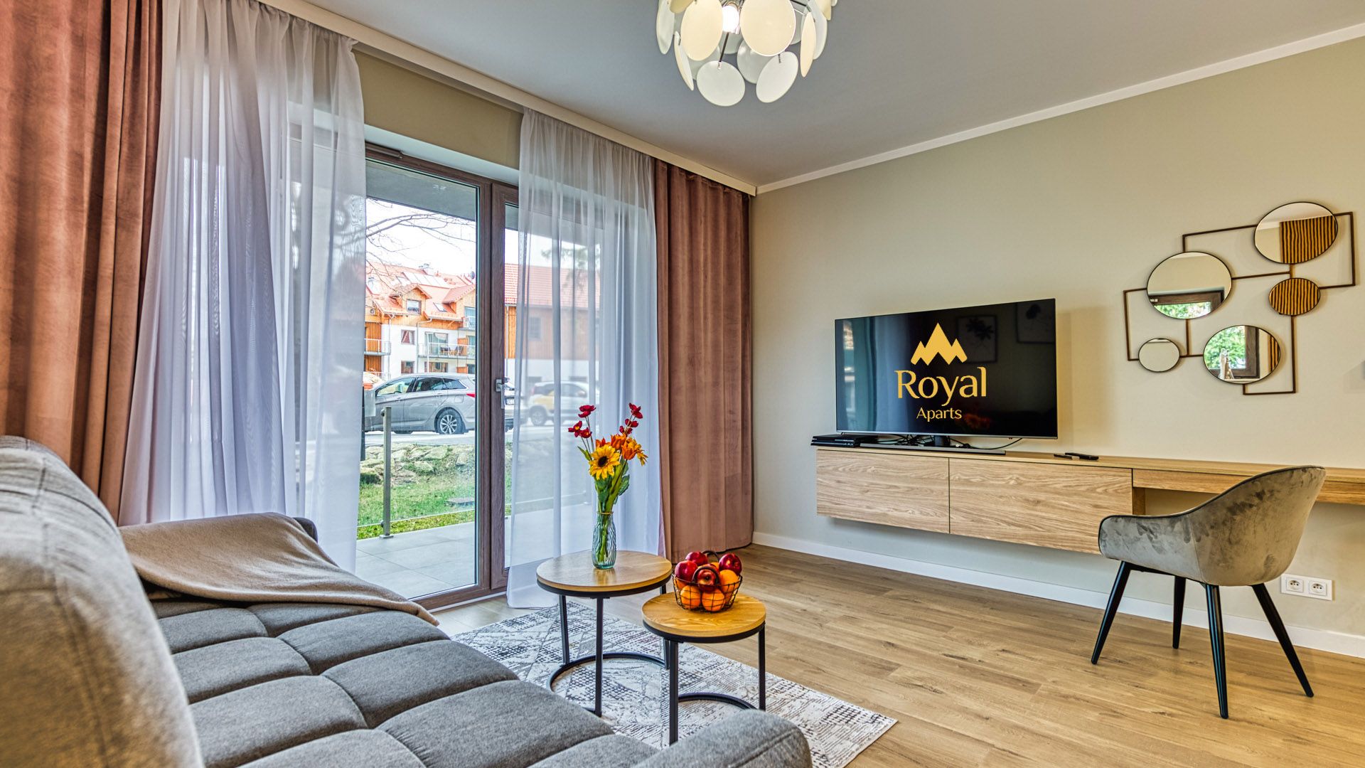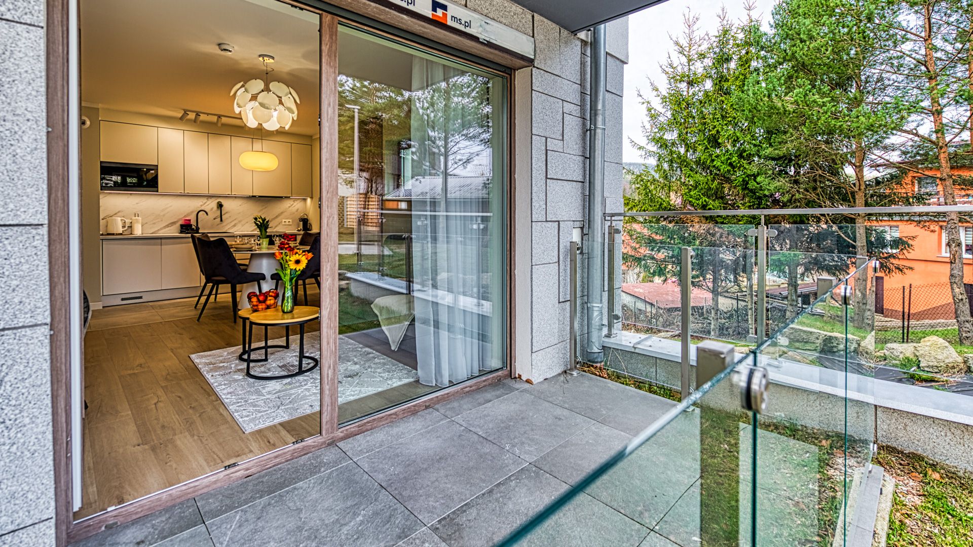 Prezentowany apartament jest częścią prestiżowego kompleksu Stone Hill w samym centrum Szklarskiej Poręby. To nowoczesny, czteroosobowy, w pełni wyposażony lokal o powierzchni 42m^2. W sypialni znajduje się duże łóżko małżeńskie, obszerna szafa oraz telewizor. Część dzienna apartamentu składa się z, salonu połączonego z aneksem kuchennym i wyposażona jest w rozkładaną sofę, panoramiczny telewizor z konsolą PS4 i zestawem gier oraz stół kuchenny. Całość domyka wykończona w wysokim standardzie łazienka.