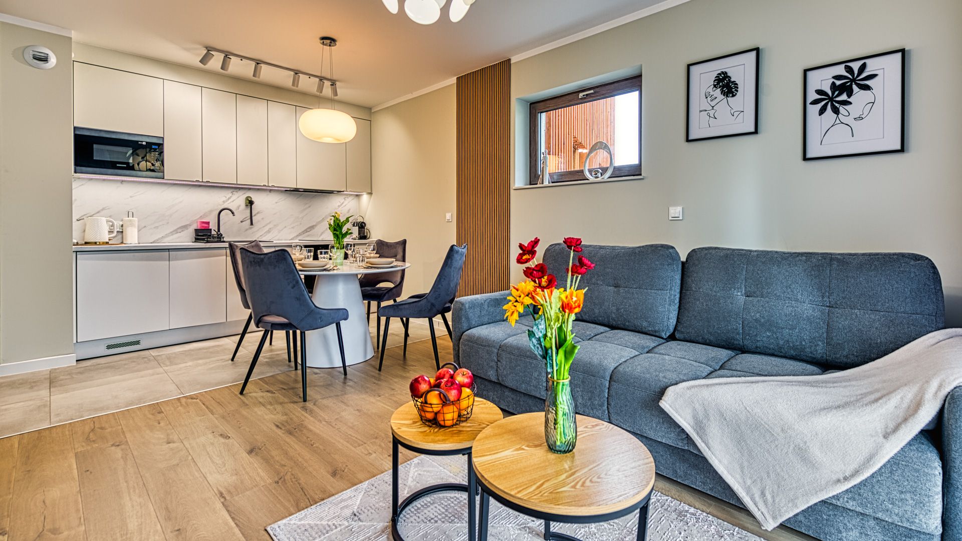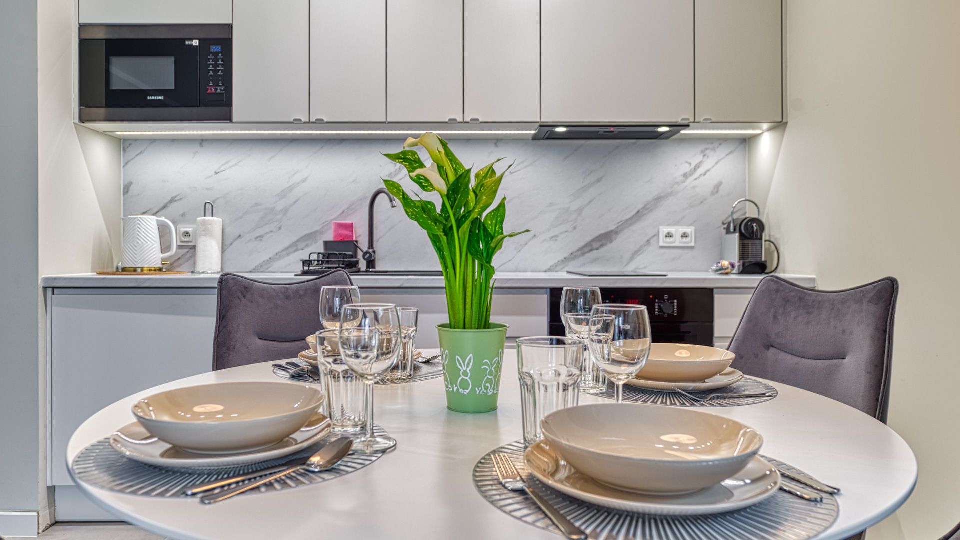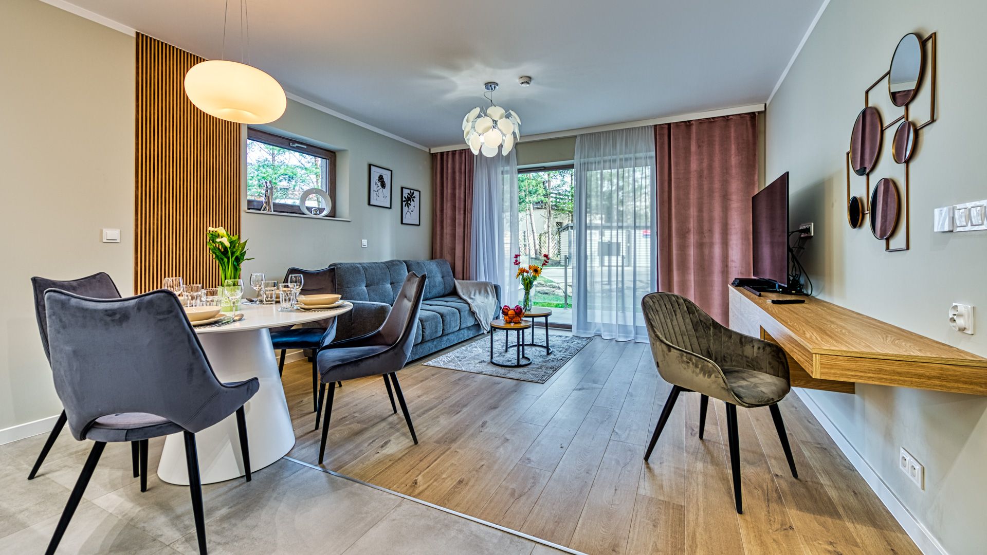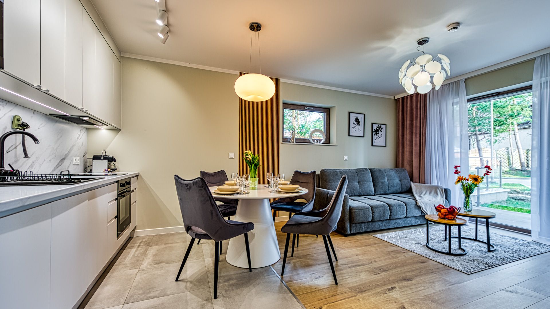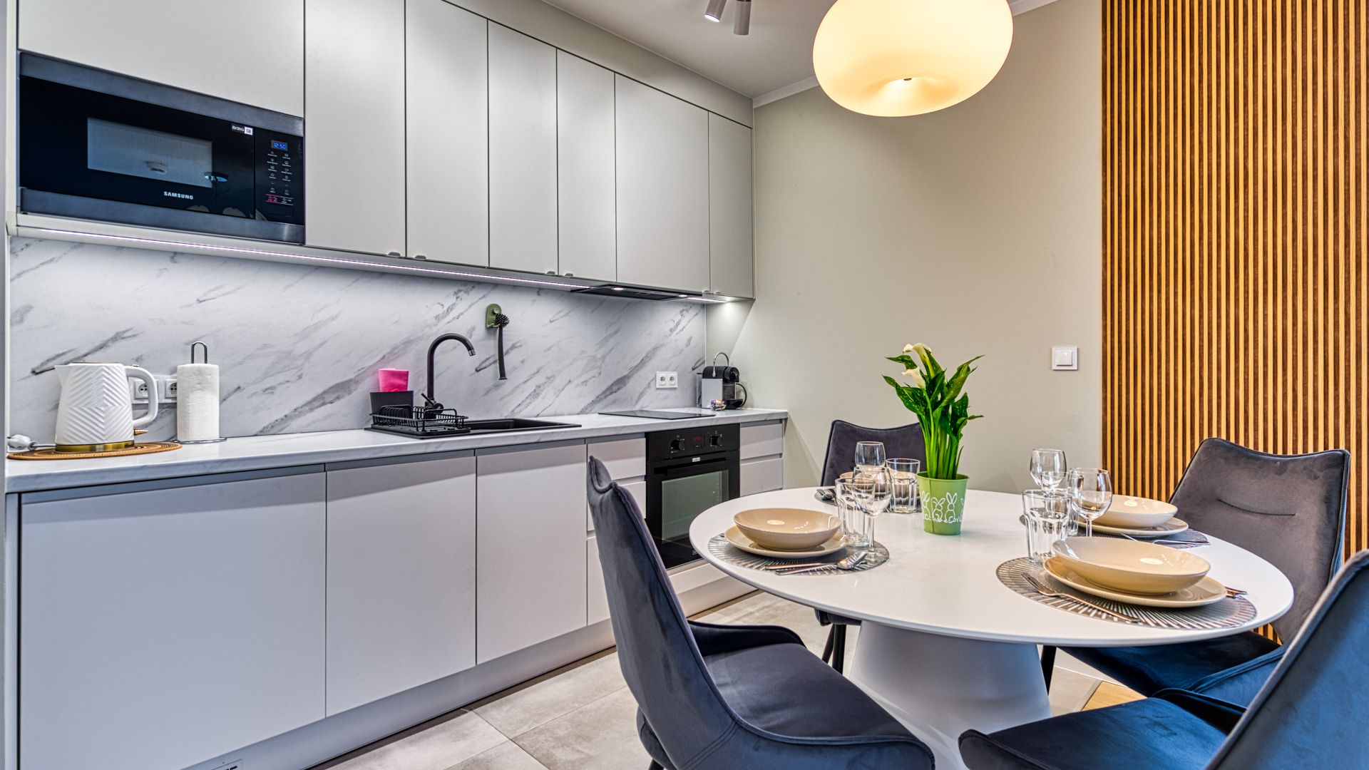 W pełni doposażony aneks kuchenny umożliwi przygotowanie nawet uroczystej kolacji. W skład wyposażenia wchodzą m.in.: talerze i sztućce, płyta kuchenna wraz z garnkami i patelnią, lodówka, zmywarka oraz ekspres do kawy. Przy jadalnym stole przewidziano miejsce dla 4-ech osób.