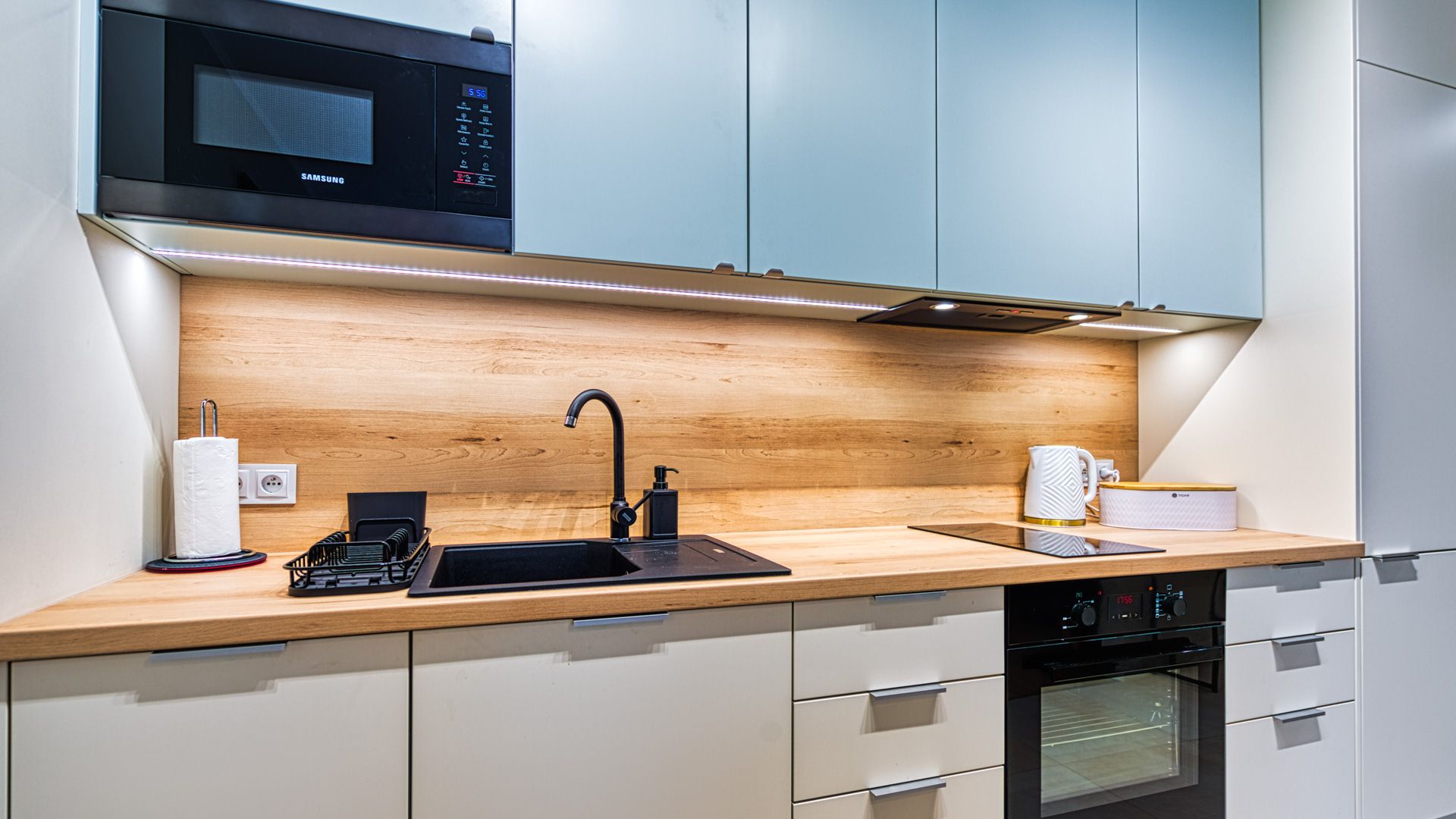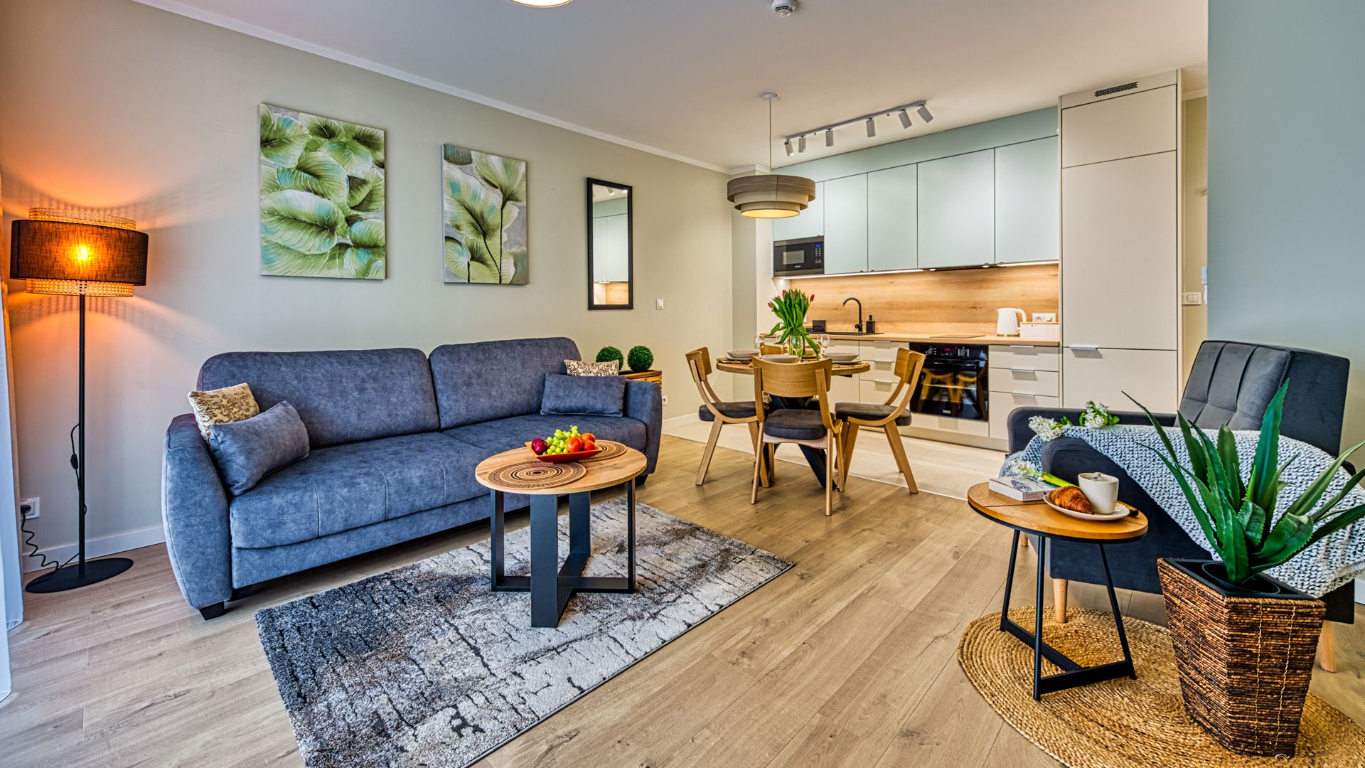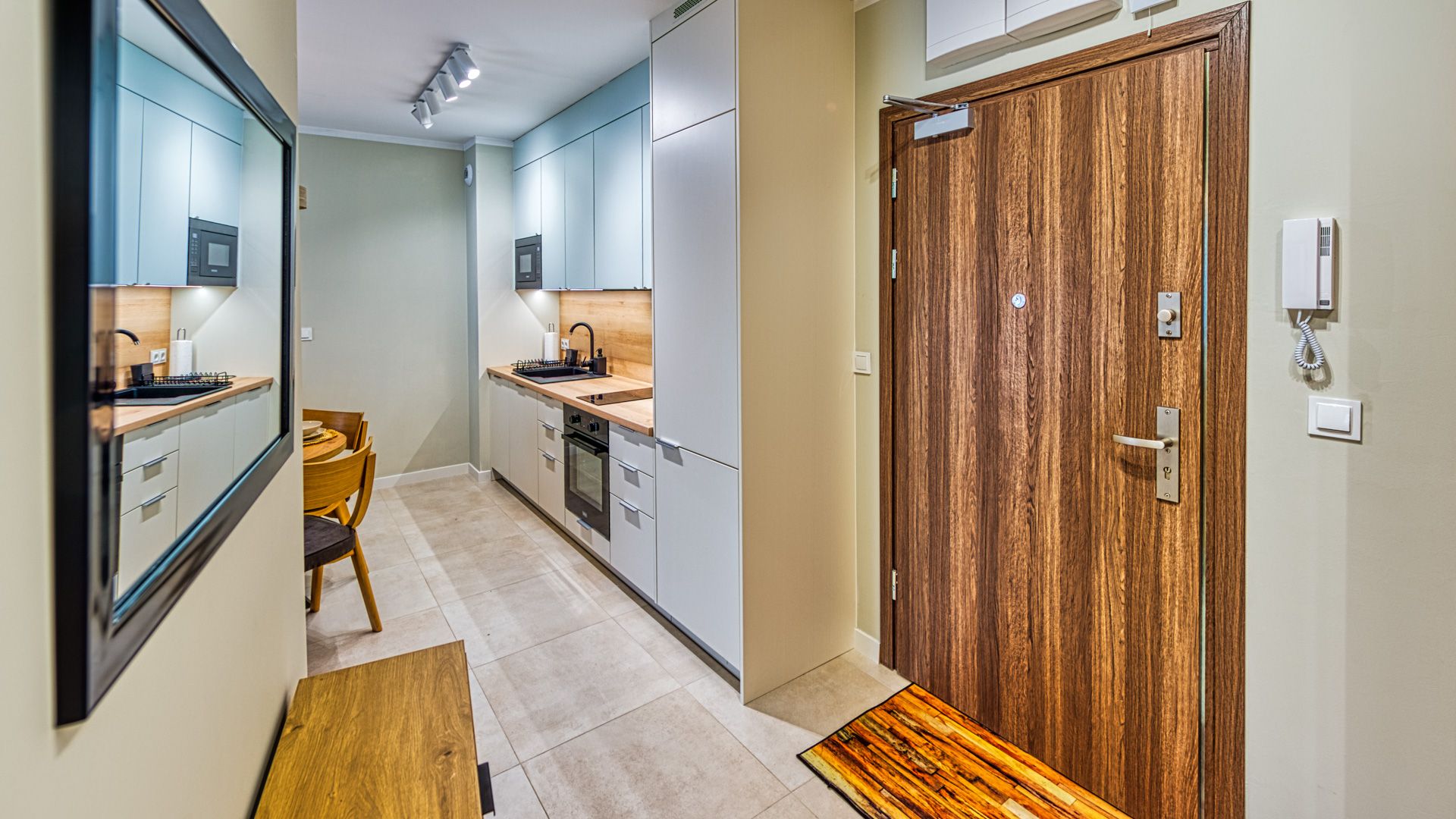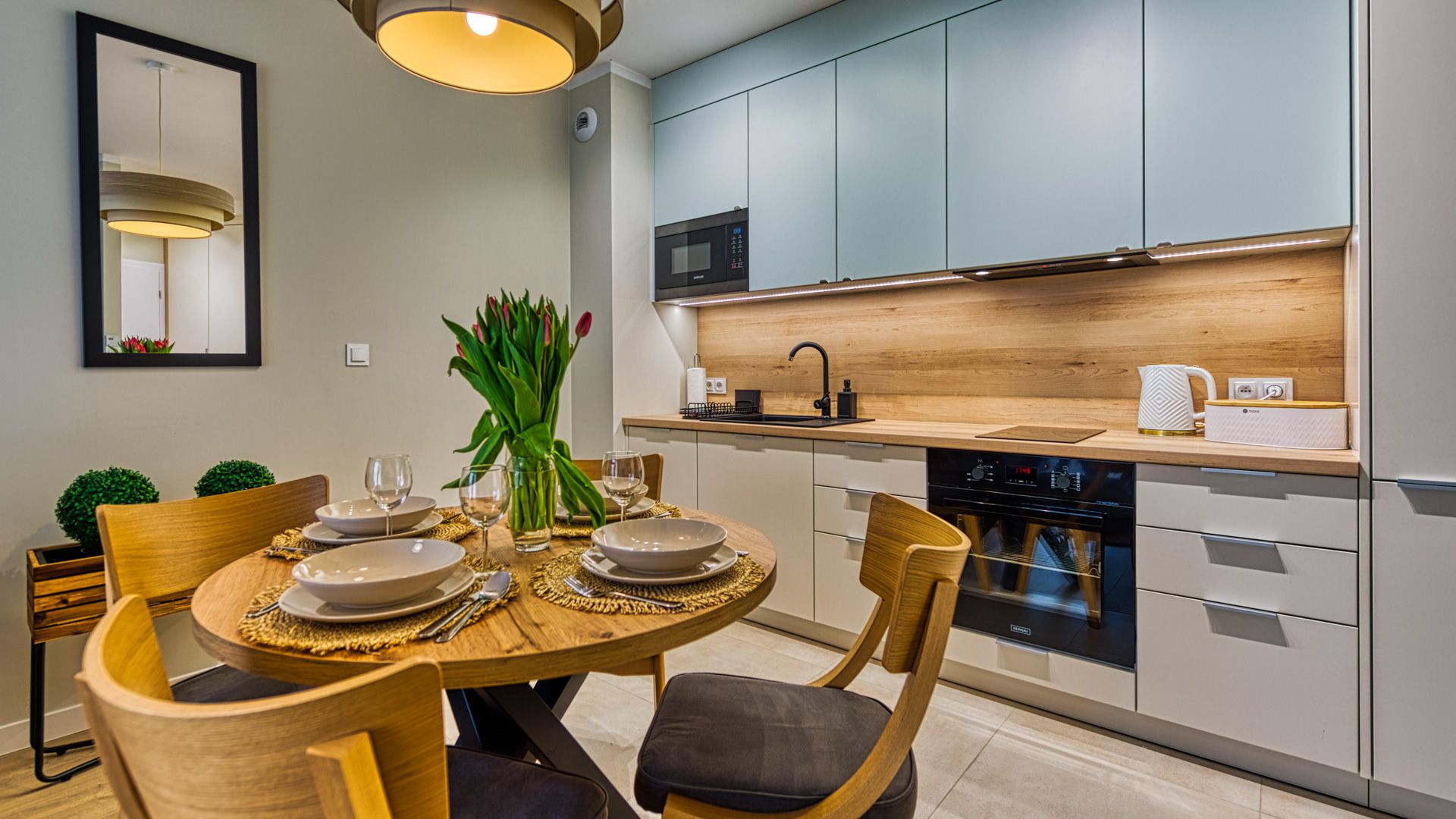 W pełni doposażony aneks kuchenny umożliwi przygotowanie nawet uroczystej kolacji. W skład wyposażenia wchodzą m.in.: talerze i sztućce, płyta kuchenna wraz z garnkami i patelnią, lodówka, zmywarka, mikrofalówka oraz ekspres do kawy. Przy jadalnym stole przewidziano miejsce dla 4-ech osób.