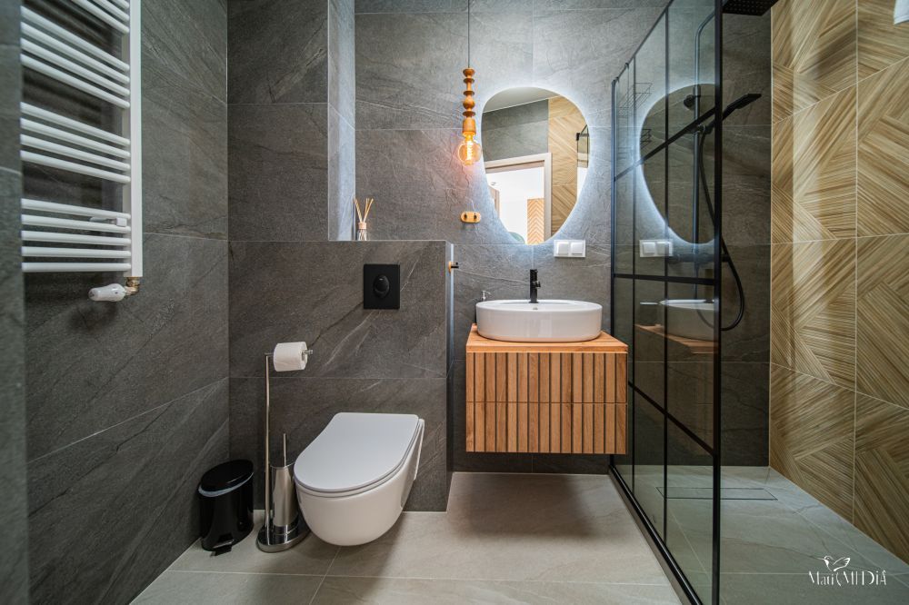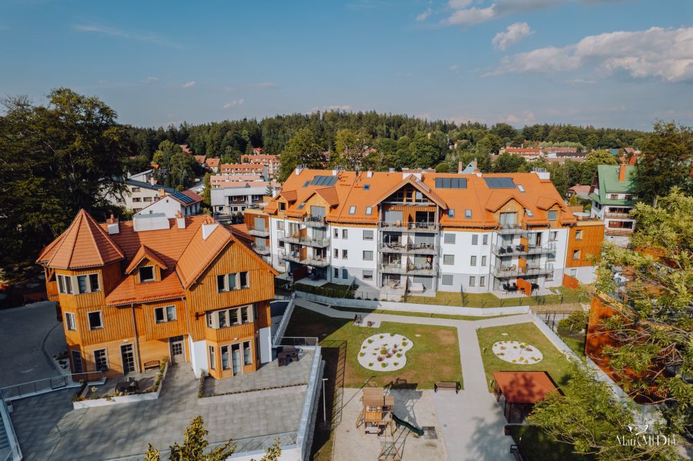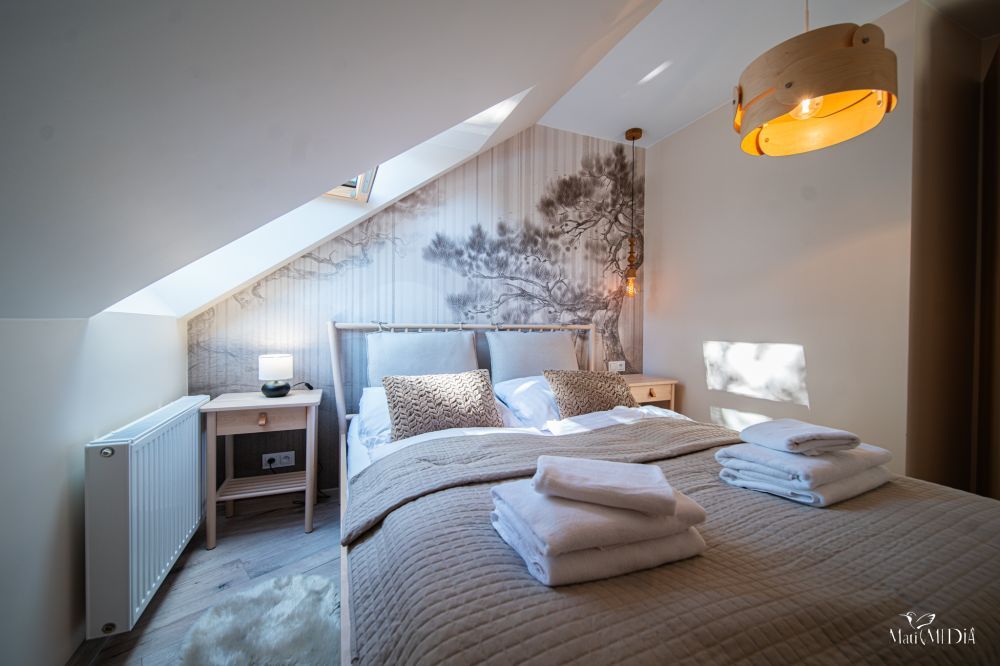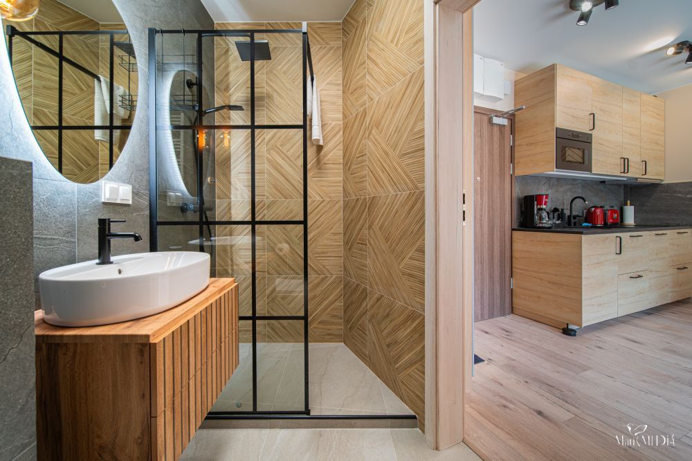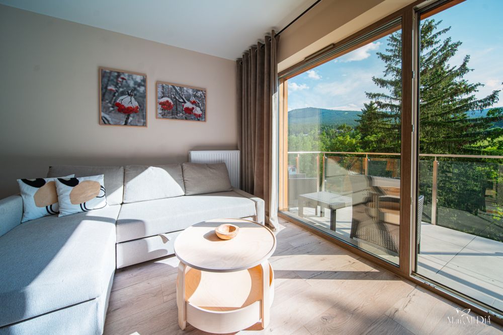 Prezentowany apartament jest częścią prestiżowego kompleksu Stone Hill w samym centrum Szklarskiej Poręby. To nowoczesny, czteroosobowy, w pełni wyposażony lokal o powierzchni 40m^2. W sypialni znajduje się duże łóżko małżeńskie oraz telewizor. Część dzienna apartamentu składa się z, salonu połączonego z aneksem kuchennym i wyposażona jest w rozkładaną sofę, panoramiczny telewizor i stół kuchenny. Całość domyka wykończona w wysokim standardzie łazienka.