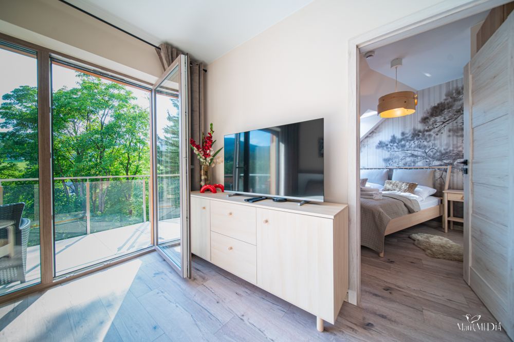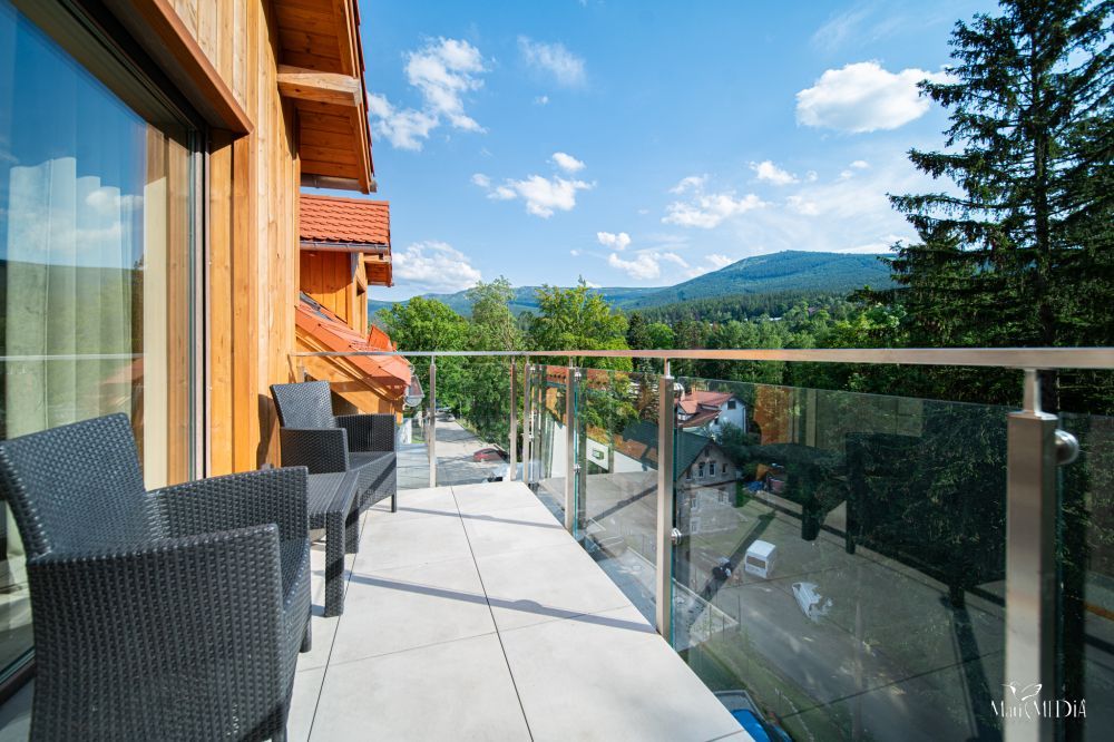 Obszerny balkon będzie ulubionym miejscem Gości na poranną kawę w otoczeniu gór.