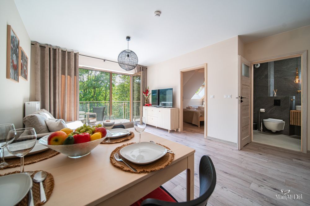 W pełni doposażony aneks kuchenny umożliwi przygotowanie nawet uroczystej kolacji. W skład wyposażenia wchodzą m.in.: talerze i sztućce, płyta kuchenna wraz z garnkami i patelnią, opiekacz/toster, lodówka, zmywarka, mikrofalówka oraz ekspres do kawy. Przy jadalnym stole przewidziano miejsce dla 4-ech osób.