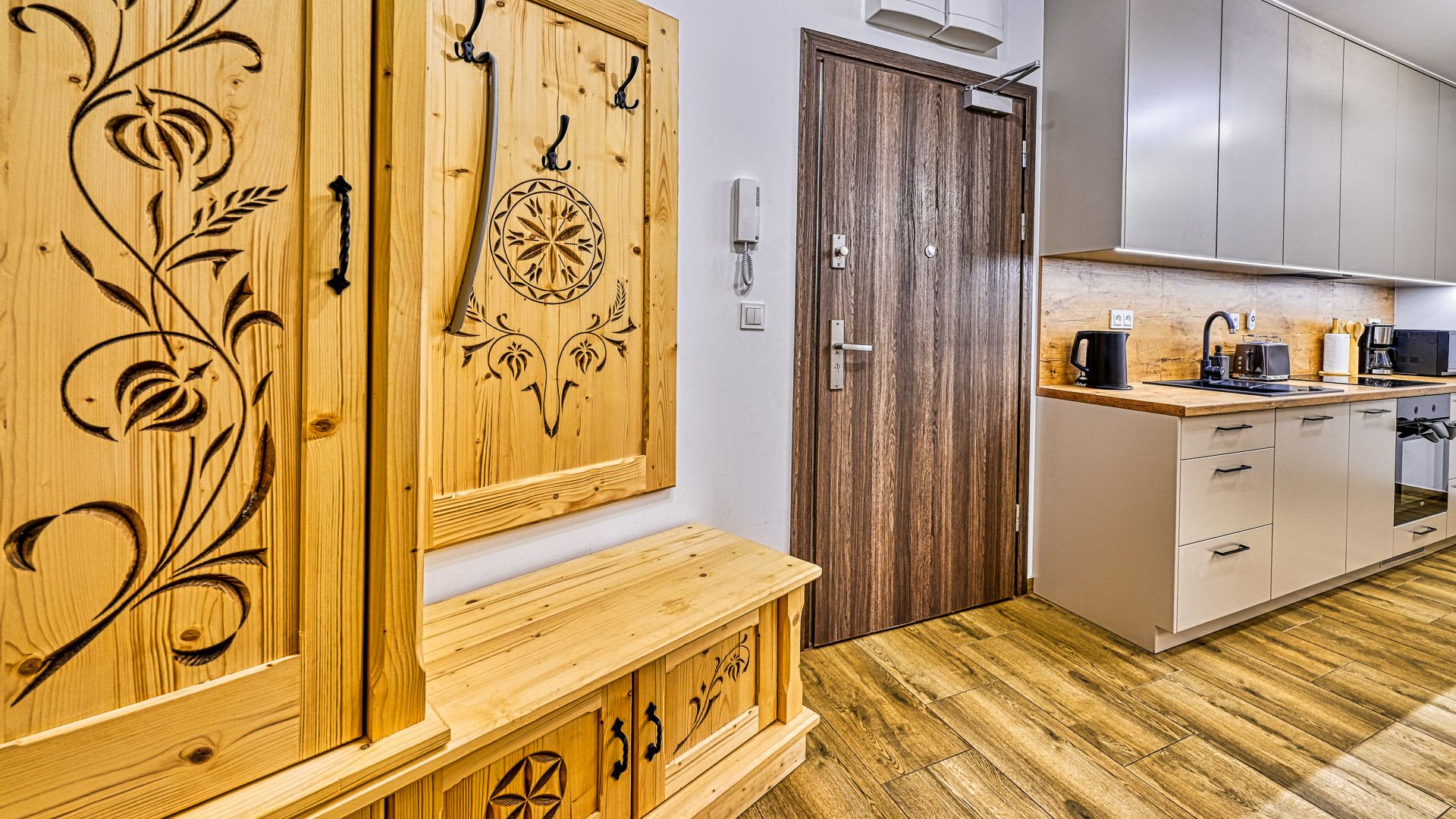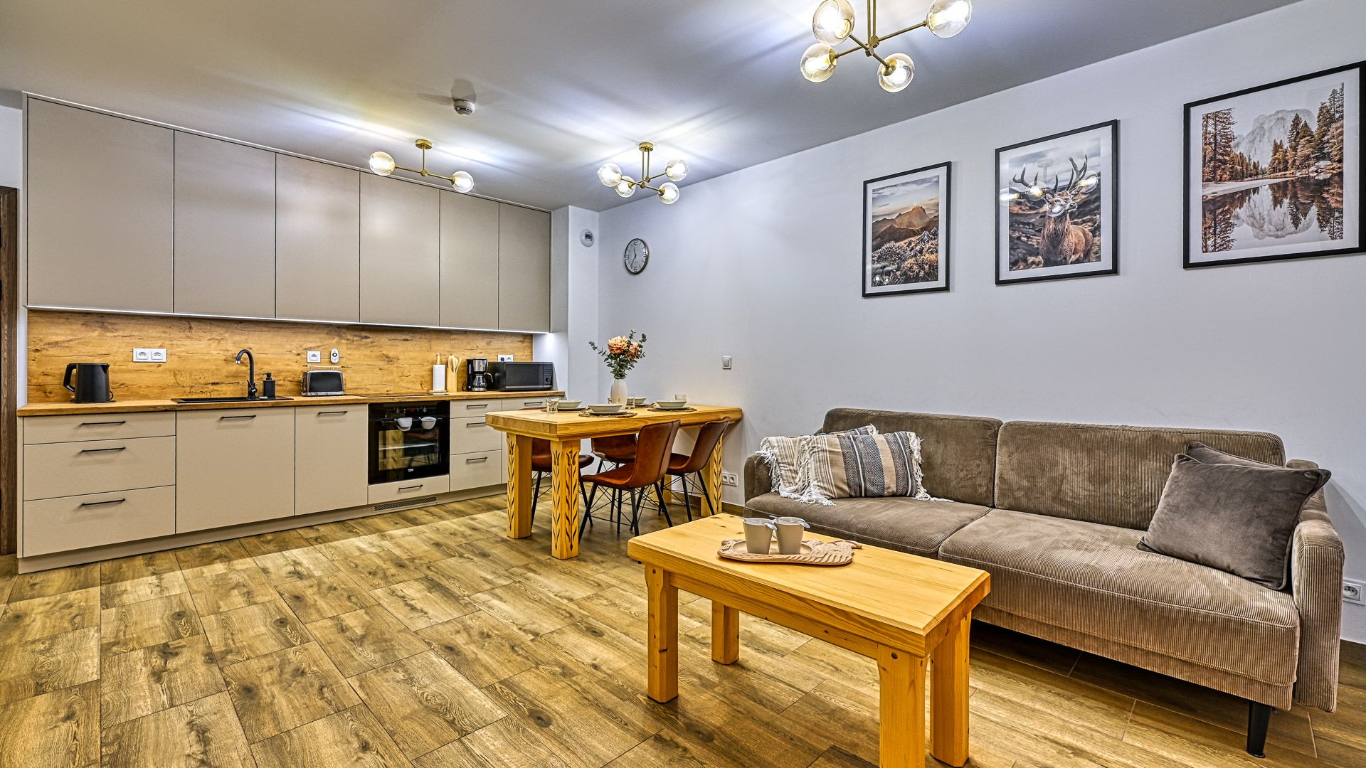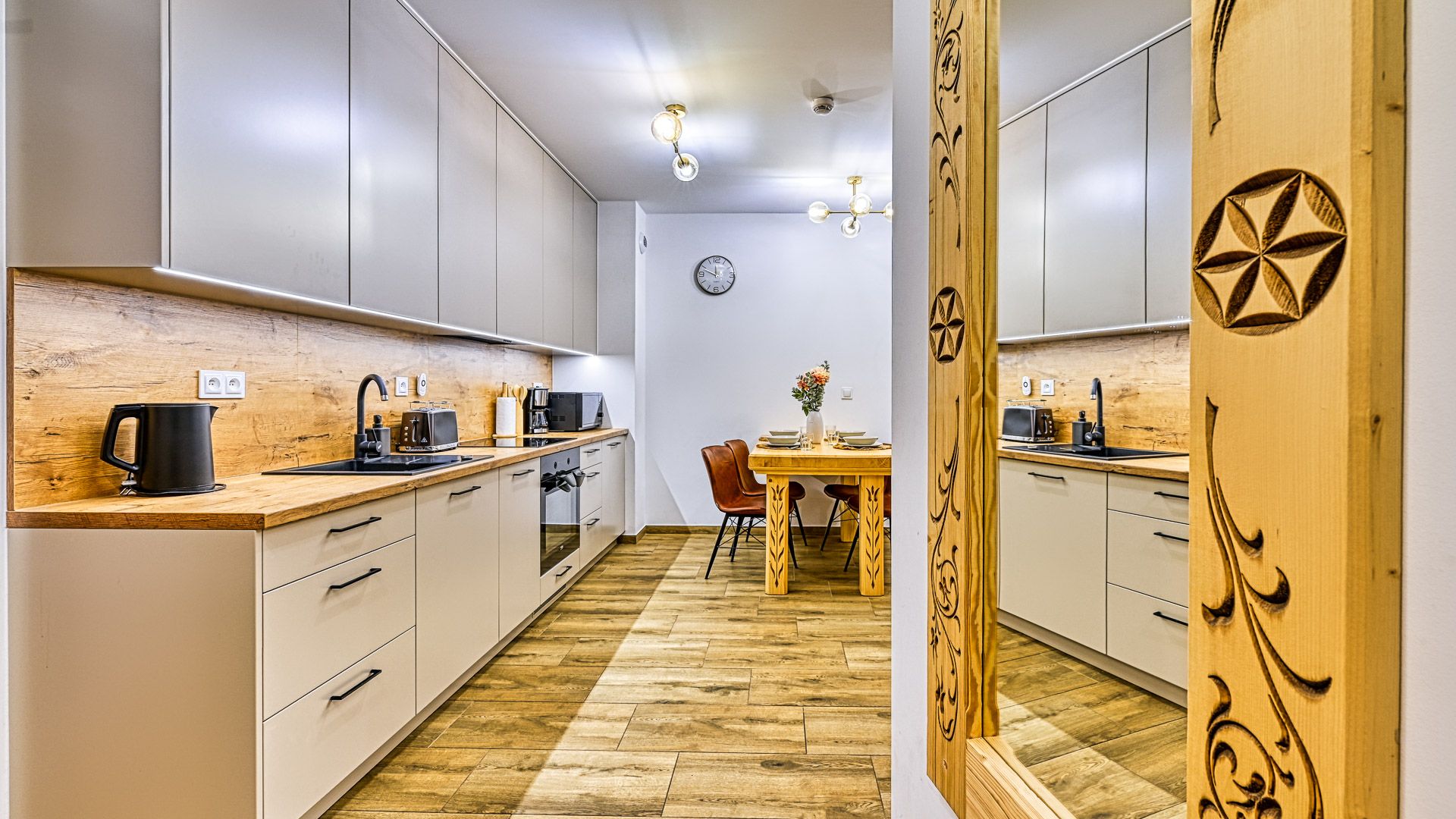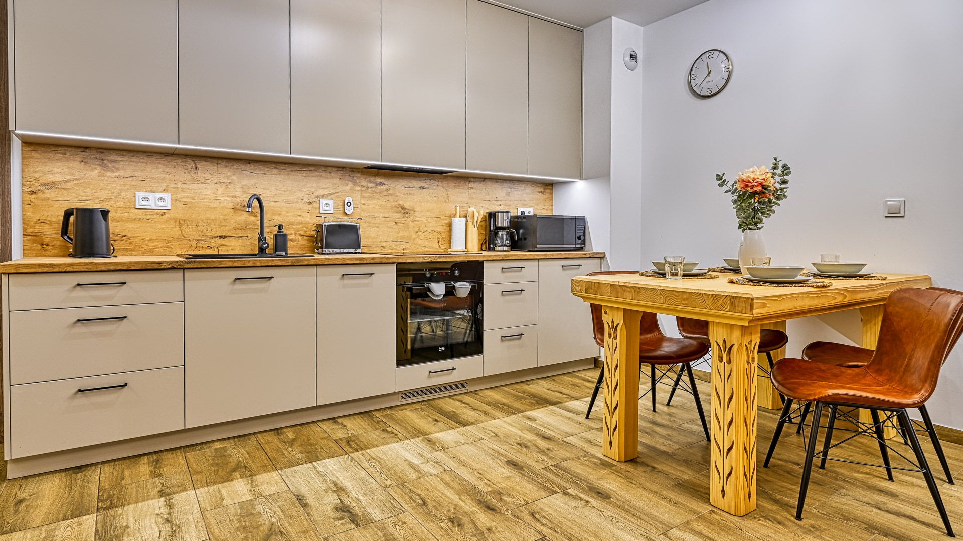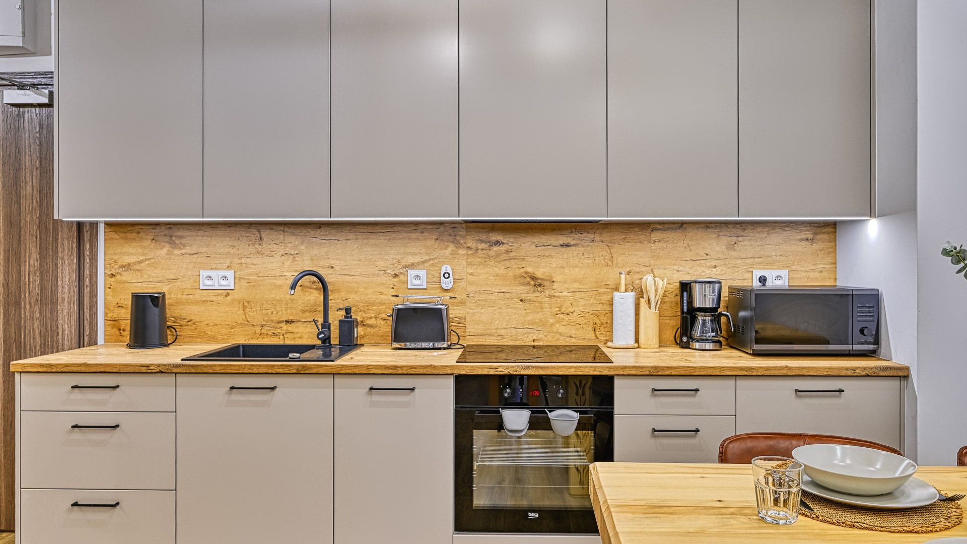 W pełni doposażony aneks kuchenny umożliwi przygotowanie nawet uroczystej kolacji. W skład wyposażenia wchodzą m.in.: talerze i sztućce, płyta kuchenna wraz z garnkami i patelnią, opiekacz/toster, lodówka, zmywarka oraz ekspres do kawy. Przy jadalnym stole przewidziano miejsce dla 4-ech osób.