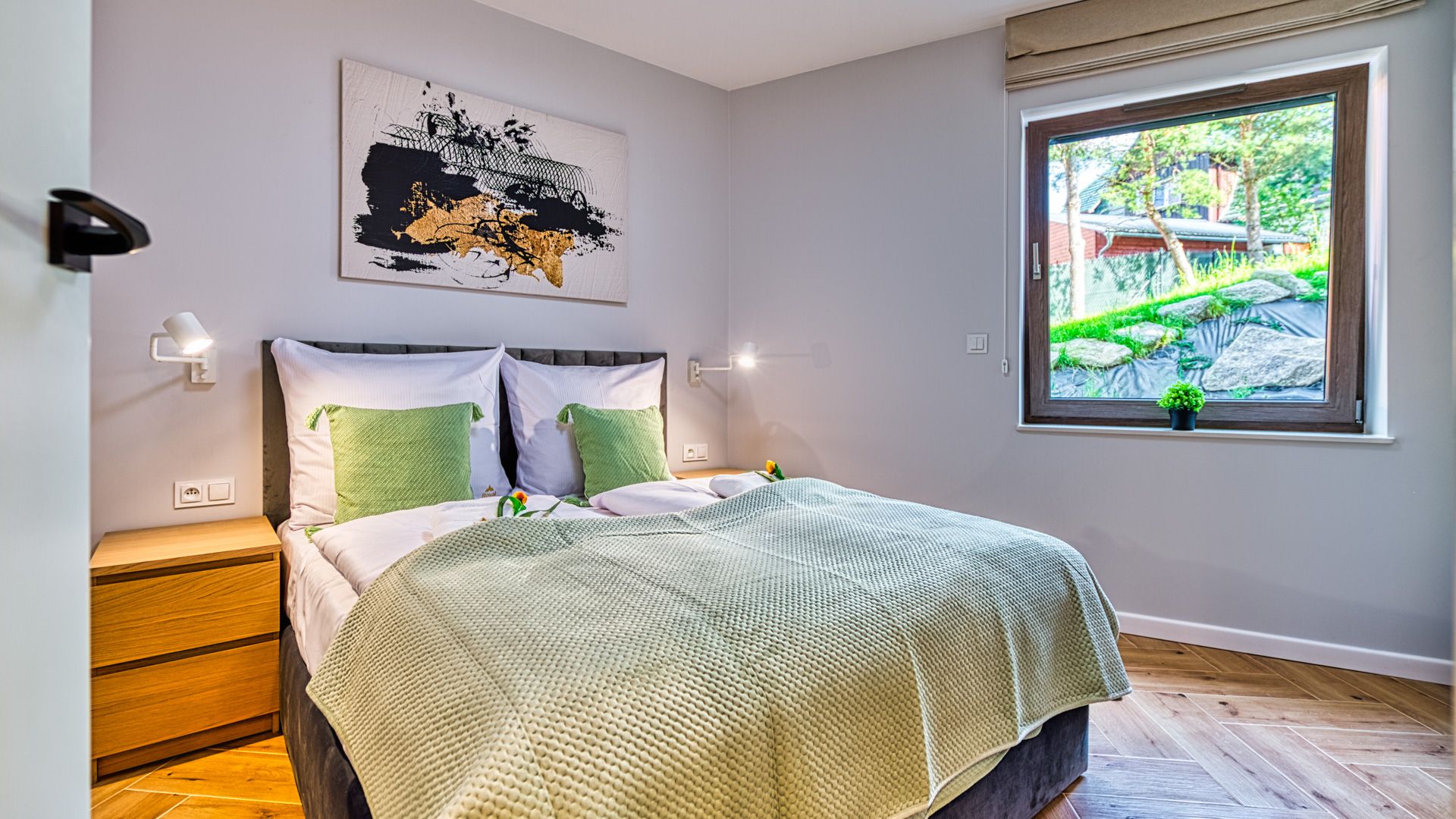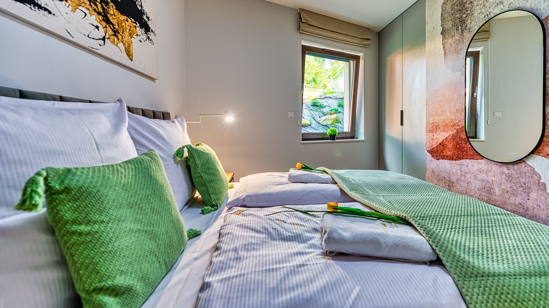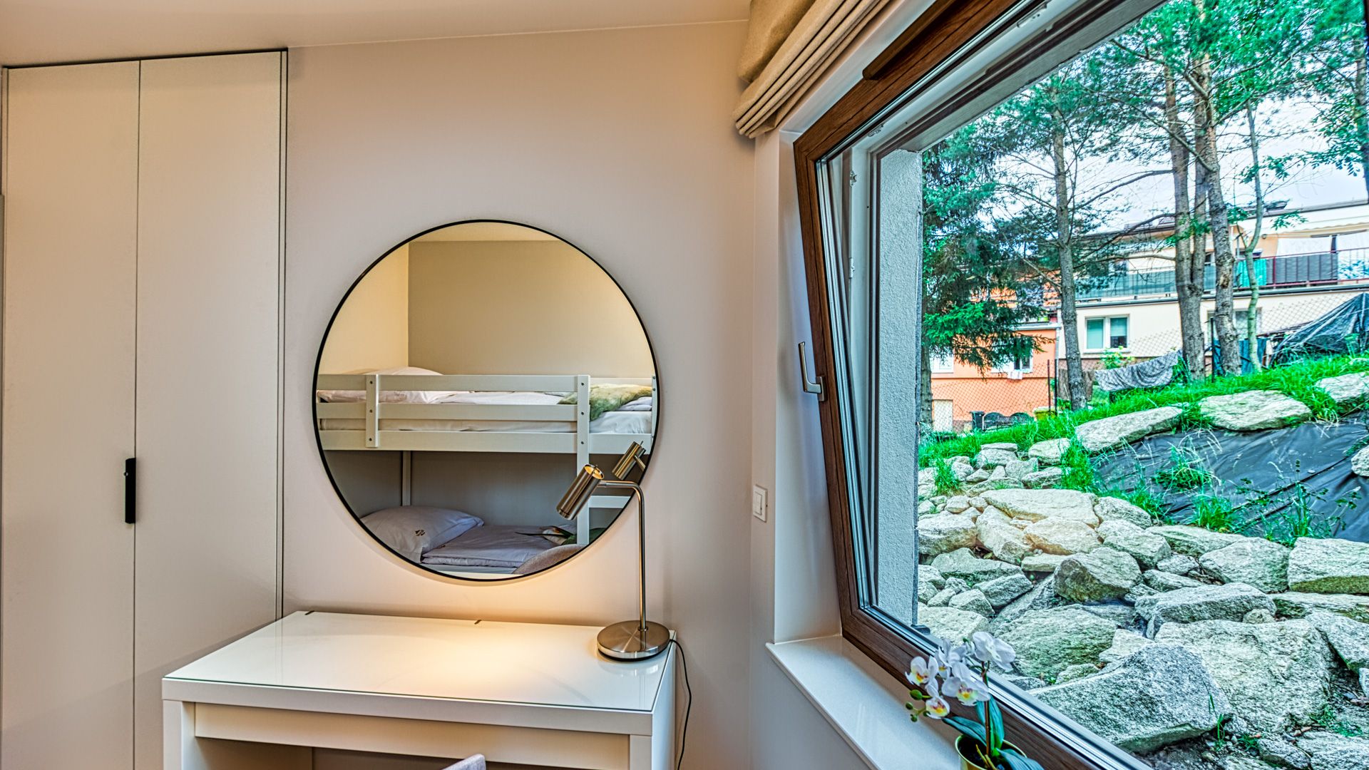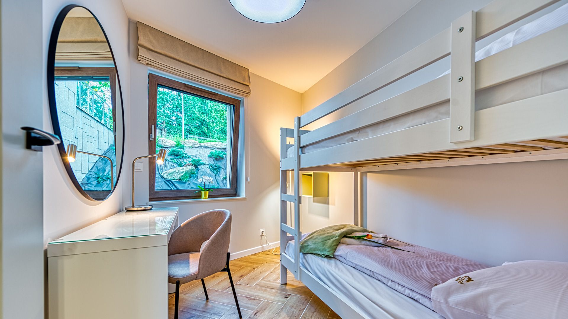 Prezentowany apartament jest częścią prestiżowego kompleksu Stone Hill w samym centrum Szklarskiej Poręby. To nowoczesny, w pełni wyposażony lokal o powierzchni 52m^2, w którym możliwy jest pobyt nawet 6-ciu osób. W pierwszej sypialni zainstalowano duże, dwuosobowe łóżko, lustro oraz obszerną szafę. W drugiej znajdziemy łóżko piętrowe i lustro. Część dzienna apartamentu składa się z, salonu połączonego z aneksem kuchennym i wyposażona jest w rozkładaną sofę oraz stół kuchenny. Całość domyka ładnie wykończona łazienka z prysznicem.