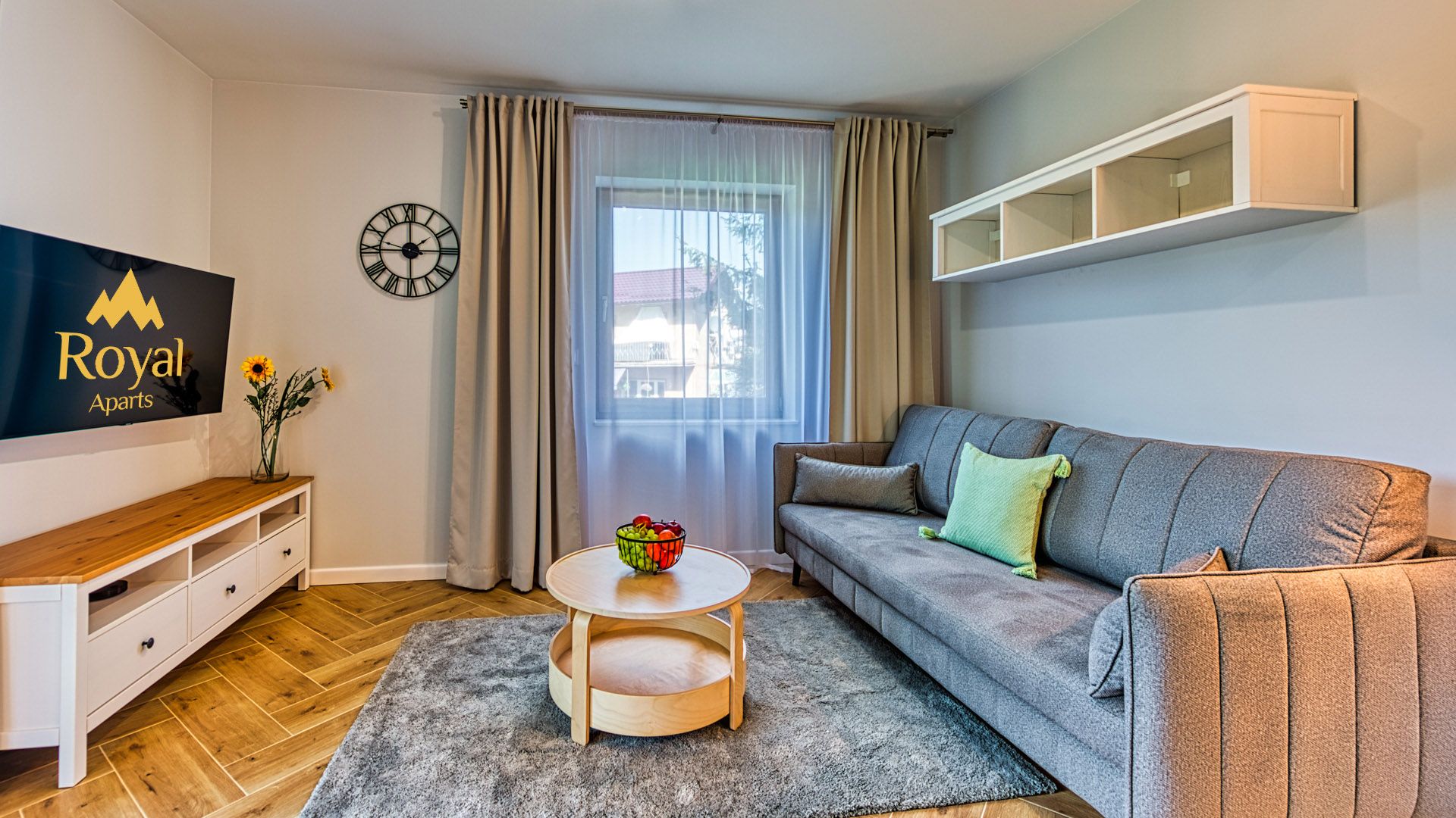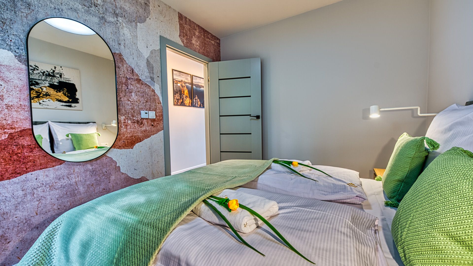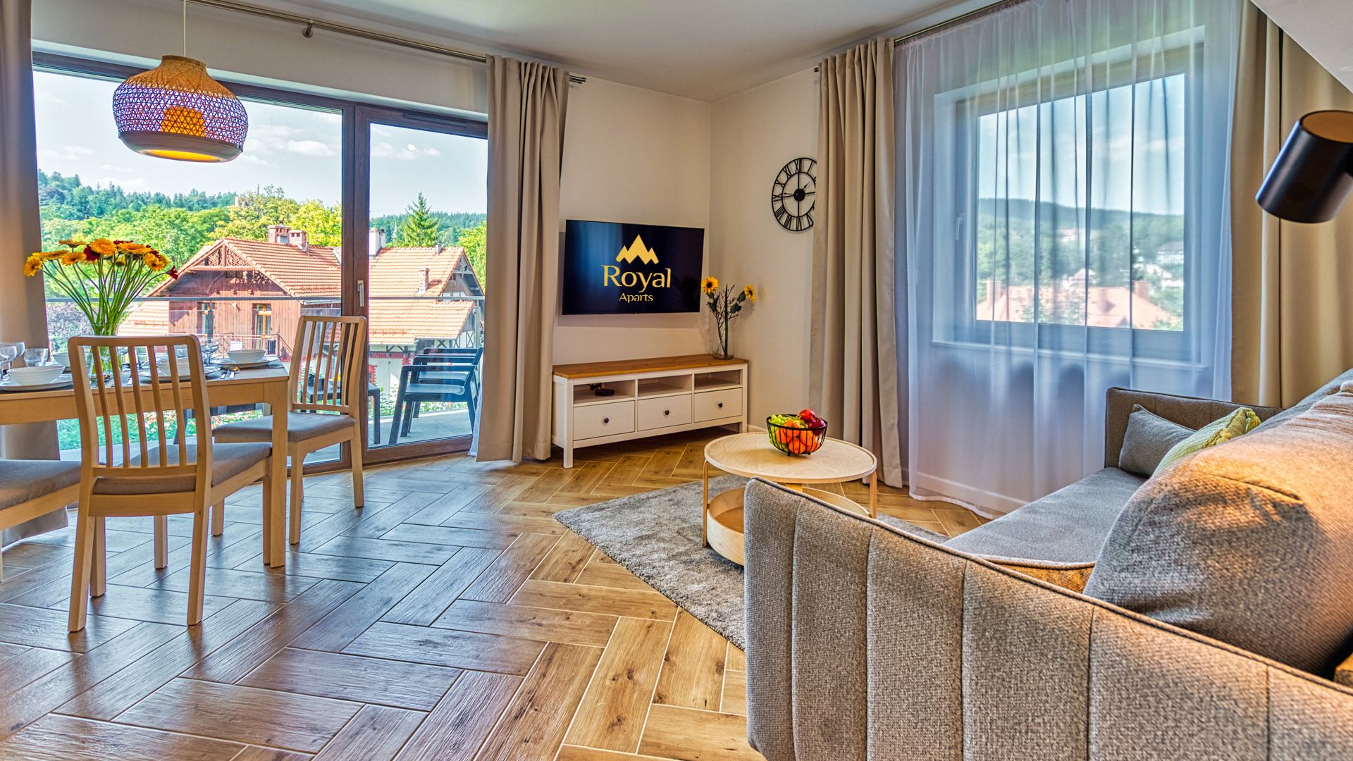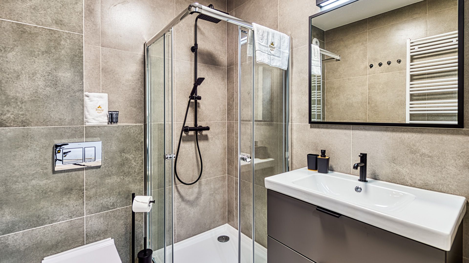 Prezentowany apartament jest częścią prestiżowego kompleksu Stone Hill w samym centrum Szklarskiej Poręby. To nowoczesny, w pełni wyposażony lokal o powierzchni 52m^2, w którym możliwy jest pobyt nawet 6-ciu osób. W pierwszej sypialni zainstalowano duże, dwuosobowe łóżko, lustro oraz obszerną szafę. W drugiej znajdziemy łóżko piętrowe i lustro. Część dzienna apartamentu składa się z, salonu połączonego z aneksem kuchennym i wyposażona jest w rozkładaną sofę oraz stół kuchenny. Całość domyka ładnie wykończona łazienka z prysznicem.