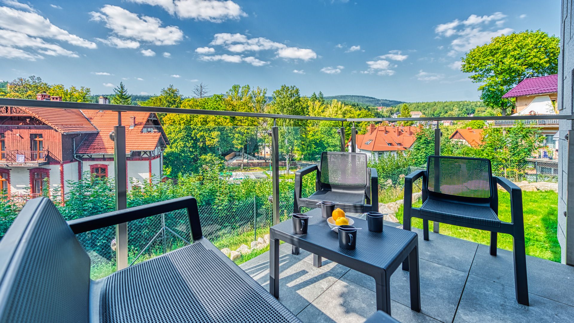 Obszerny balkon będzie ulubionym miejscem Gości na poranną kawę w otoczeniu gór.