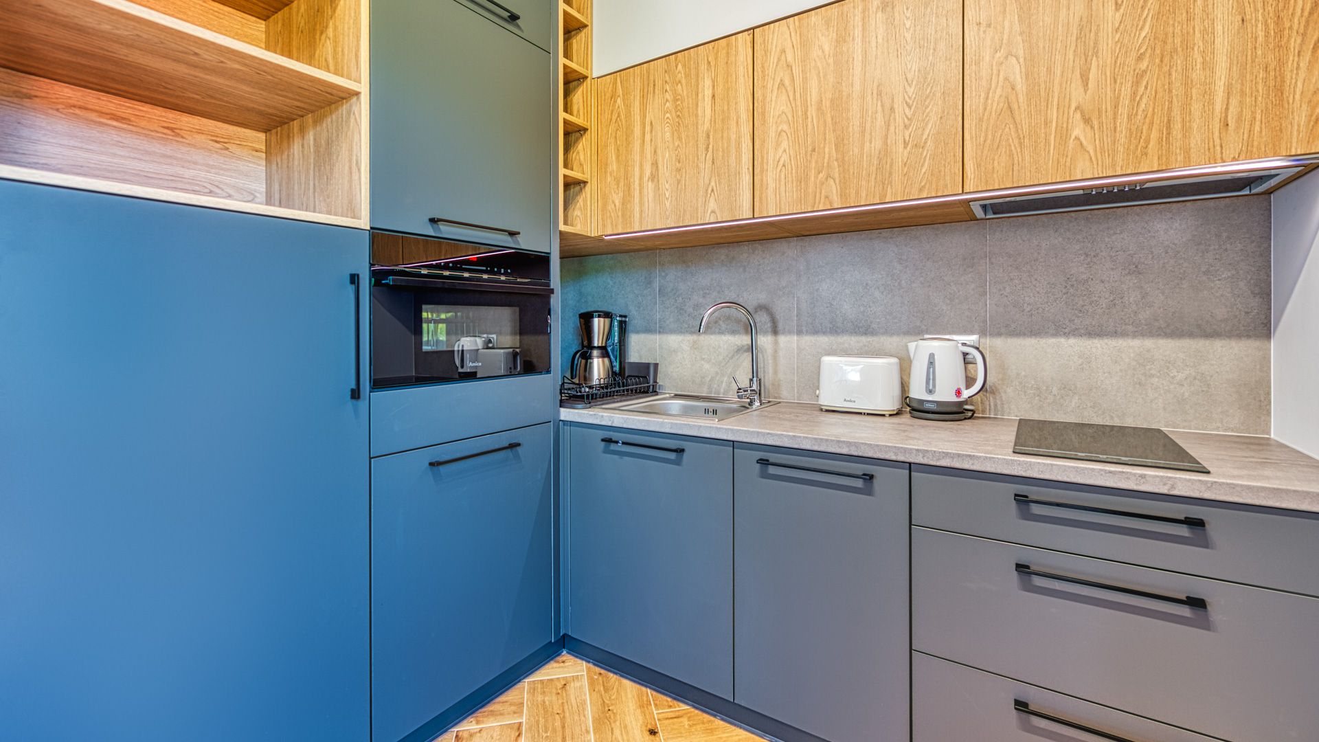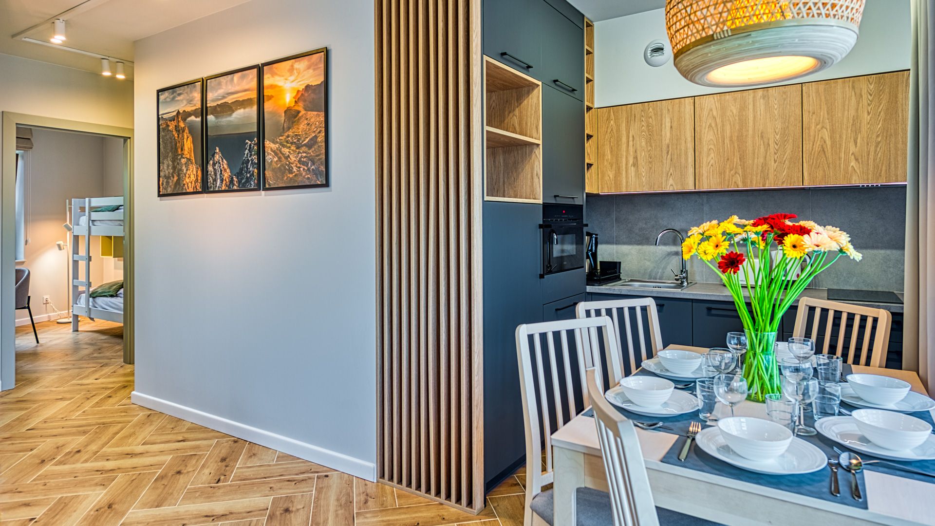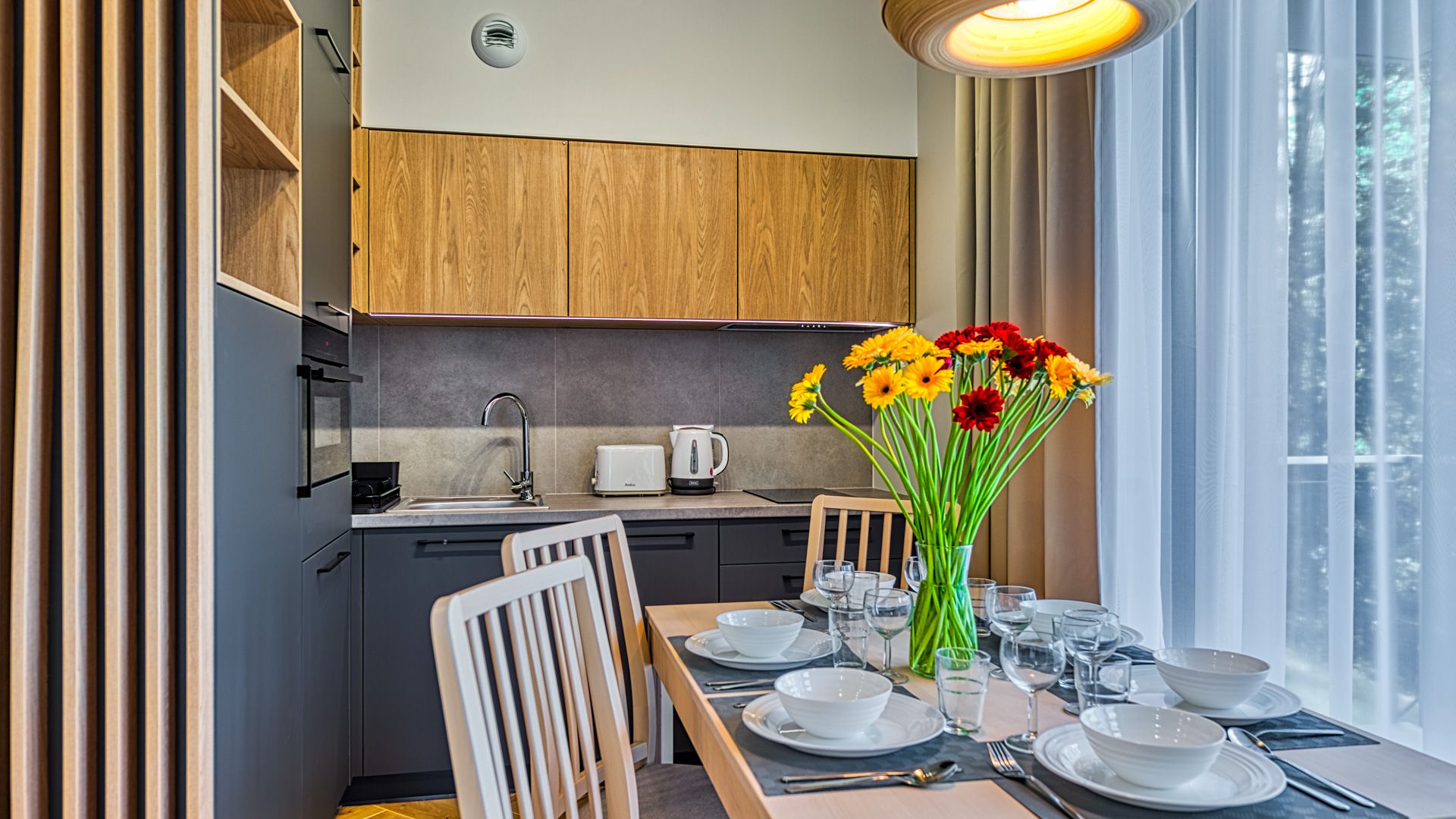 W pełni doposażony aneks kuchenny umożliwi przygotowanie nawet uroczystej kolacji. W skład wyposażenia wchodzą m.in.: talerze i sztućce, płyta kuchenna wraz z garnkami i patelnią, piekarnik, zmywarka, lodówka, czajnik elektryczny, mikrofalówka, opiekacz/toster oraz ekspres do kawy. Przy jadalnym stole przewidziano miejsce dla 6-ciu osób.