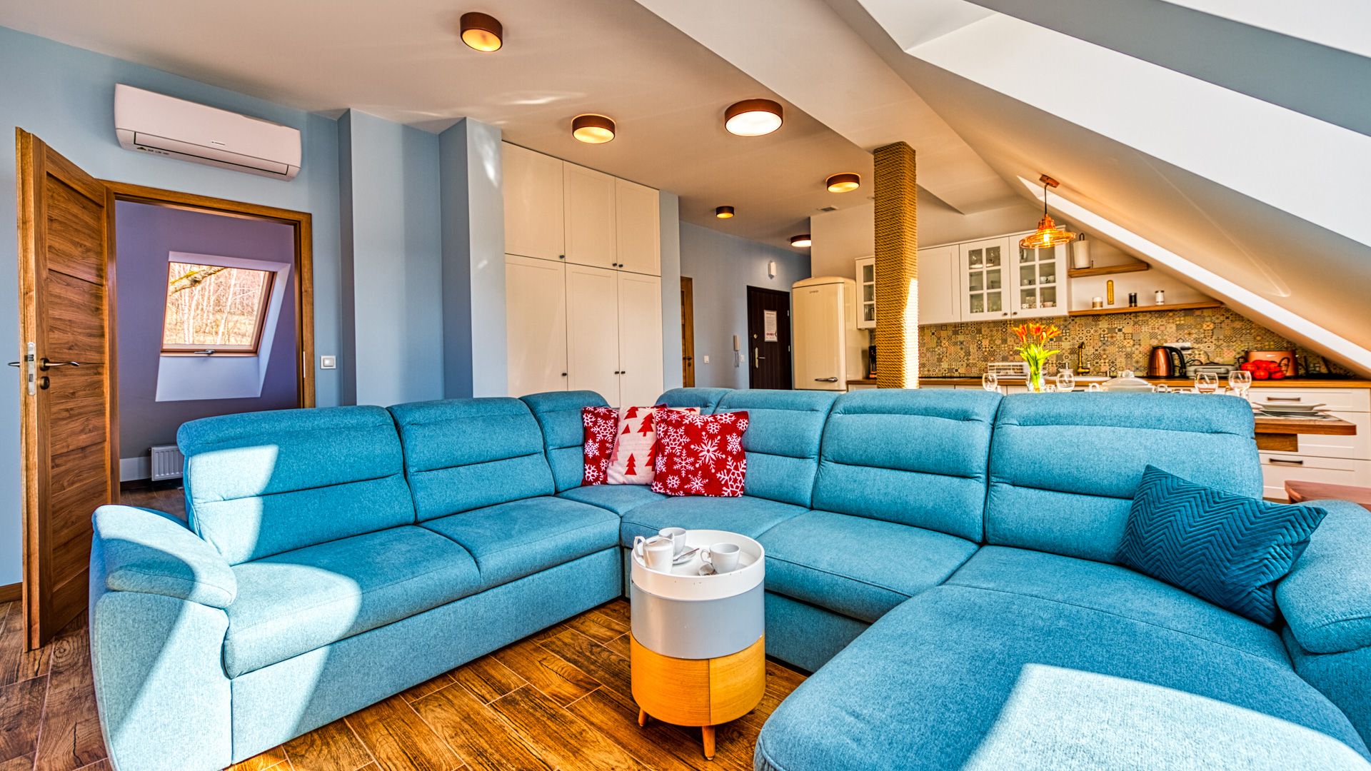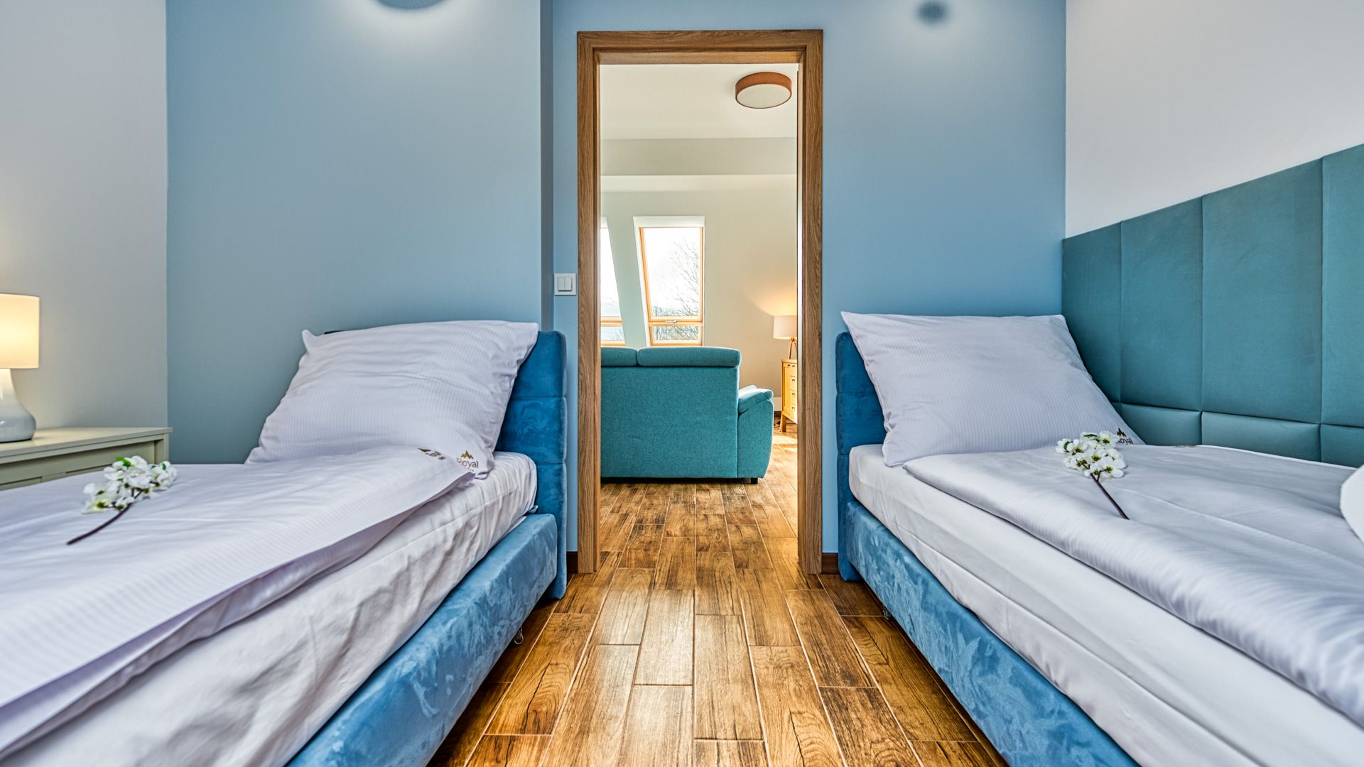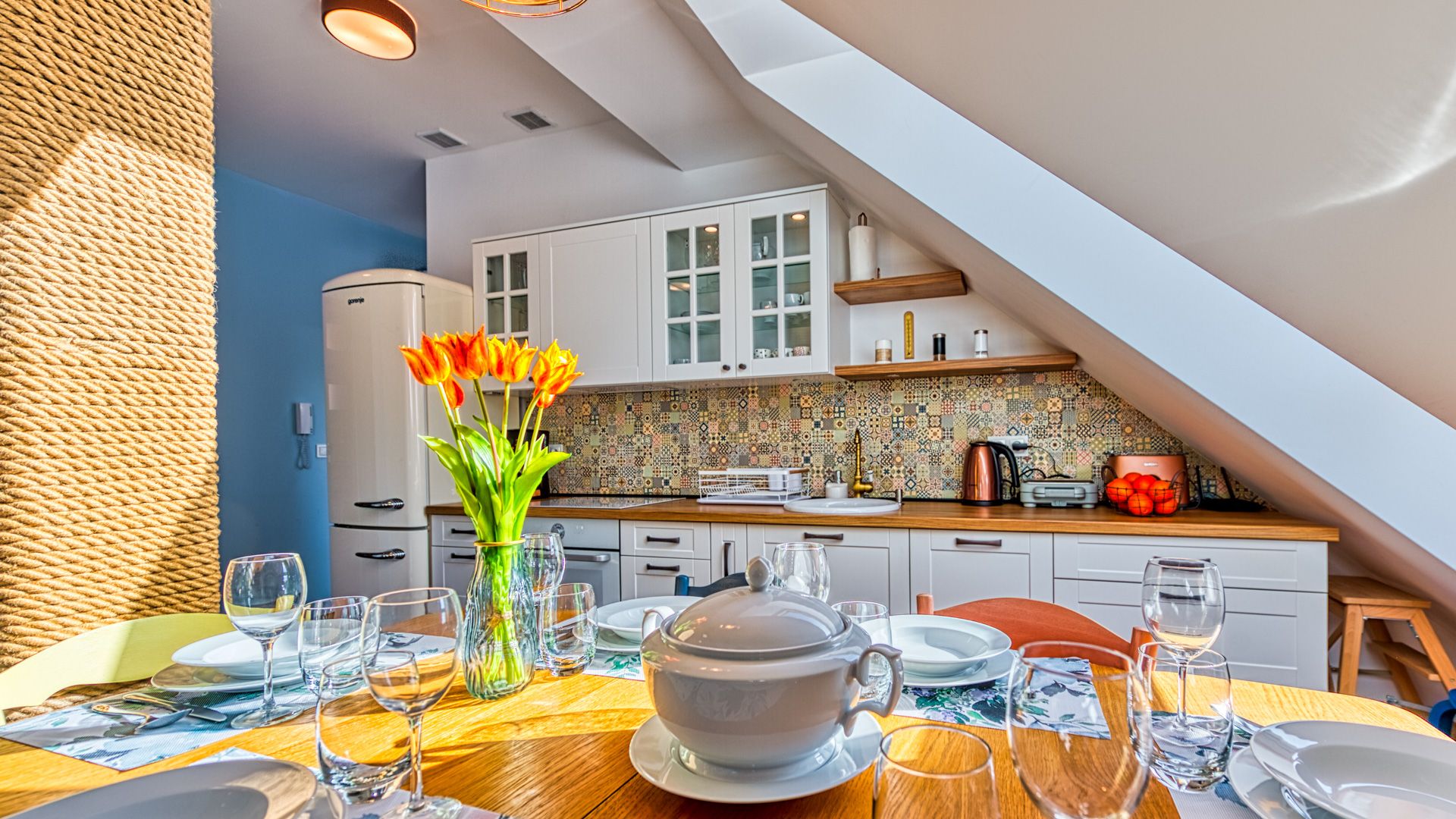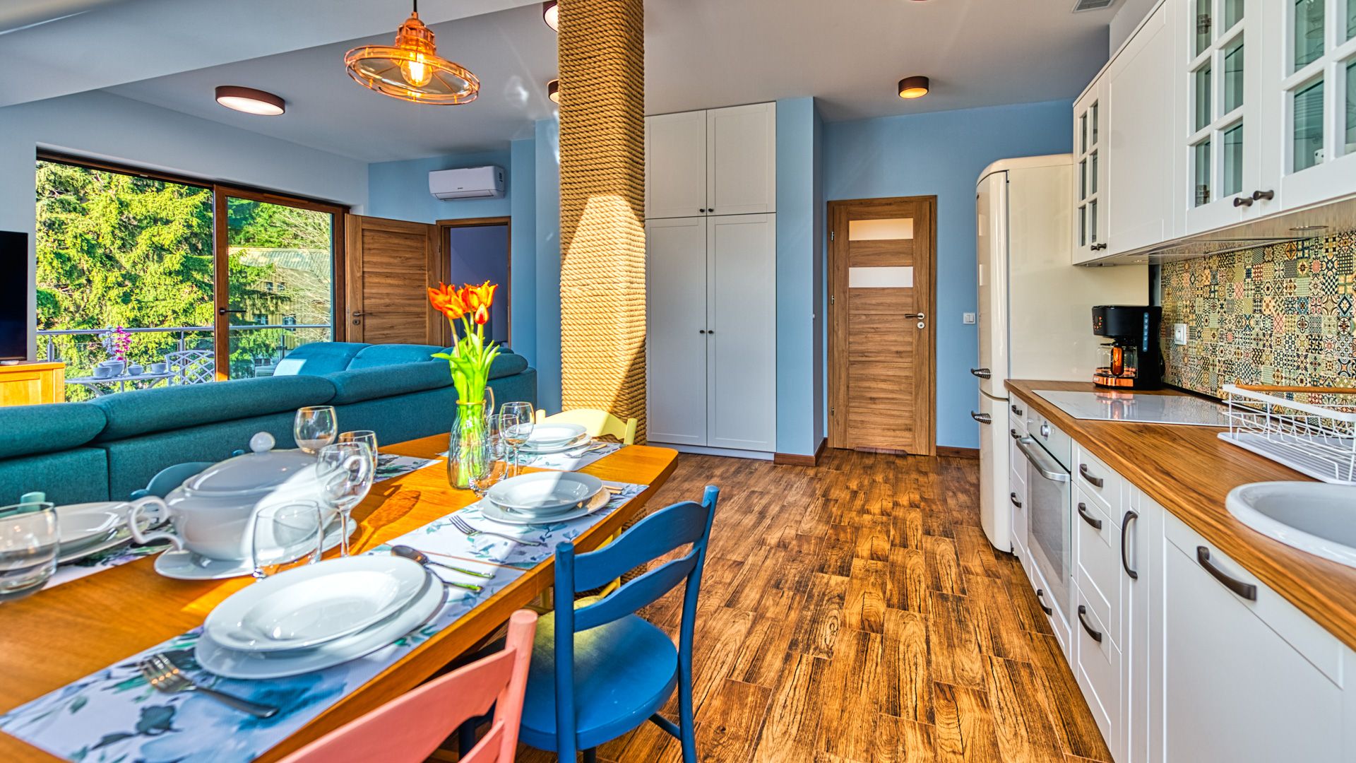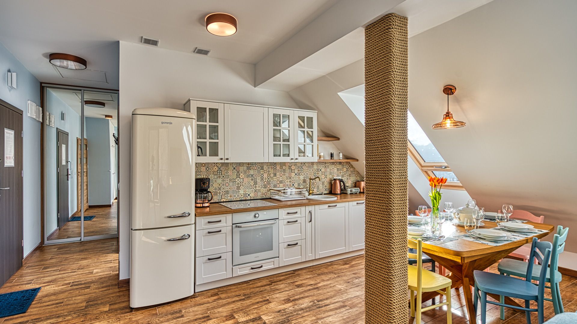 Prezentowany lokal ma powierzchnię 50m^2 i zapewni komfortowy wypoczynek siedmiu osobom. Składa się z dwóch sypialni zawierających łącznie pięć pojedynczych łóżek, części dziennej, połączonej z aneksem kuchennym oraz łazienki z prysznicem i pralką. Sam aneks kuchenny zawiera w sobie niezbędne do przygotowania smacznego posiłku sprzęty. Znajdziemy w nim m.in. płytę grzewczą, czajnik, talerze i sztućce, lodówkę, ekspres do kawy, opiekacz/toster i zmywarkę.