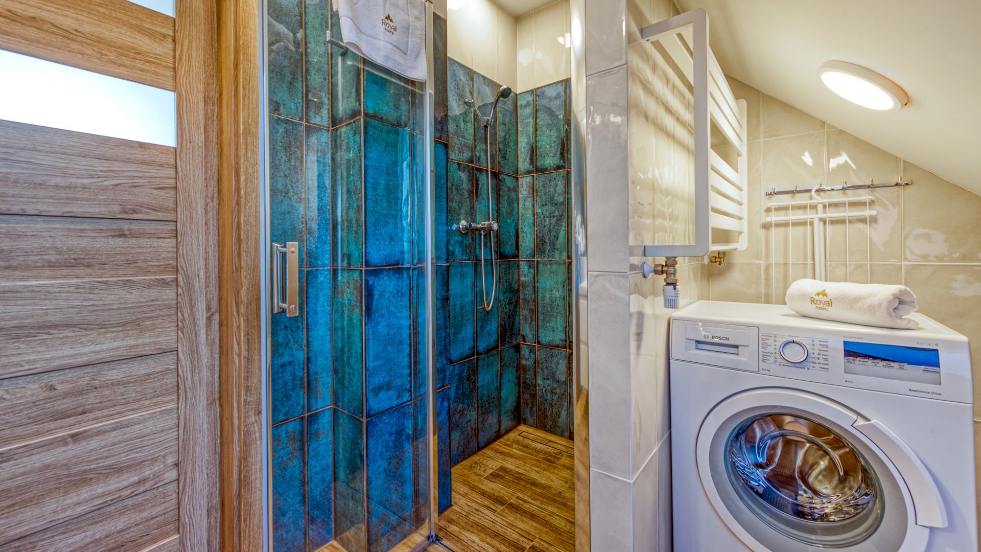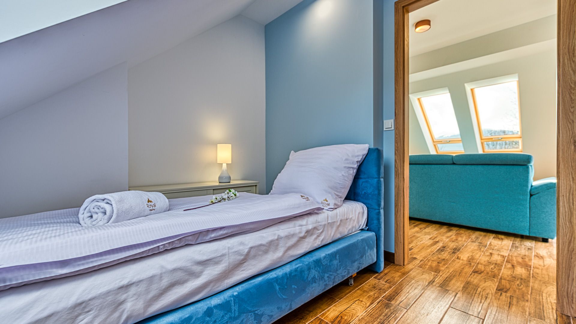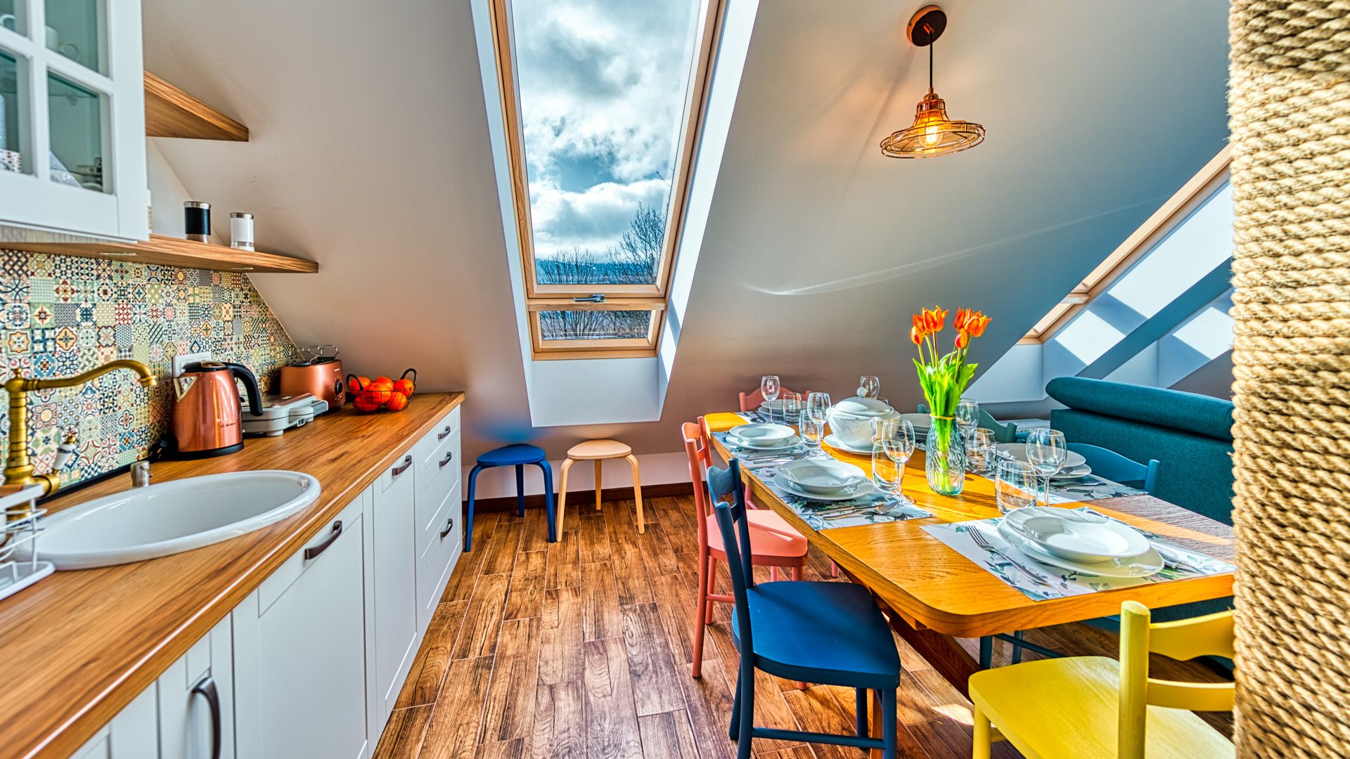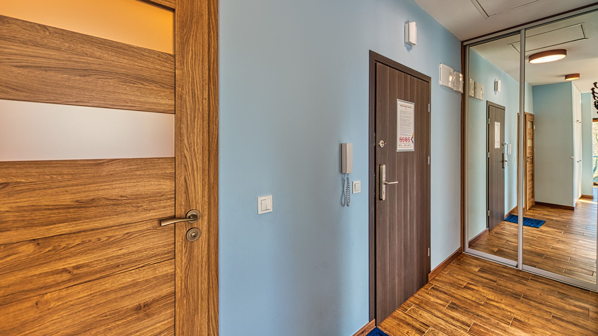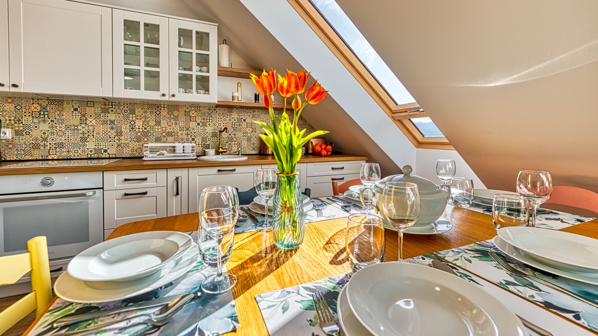 Prezentowany lokal ma powierzchnię 50m^2 i zapewni komfortowy wypoczynek siedmiu osobom. Składa się z dwóch sypialni zawierających łącznie pięć pojedynczych łóżek, części dziennej, połączonej z aneksem kuchennym oraz łazienki z prysznicem i pralką. Sam aneks kuchenny zawiera w sobie niezbędne do przygotowania smacznego posiłku sprzęty. Znajdziemy w nim m.in. płytę grzewczą, czajnik, talerze i sztućce, lodówkę, ekspres do kawy, opiekacz/toster i zmywarkę.