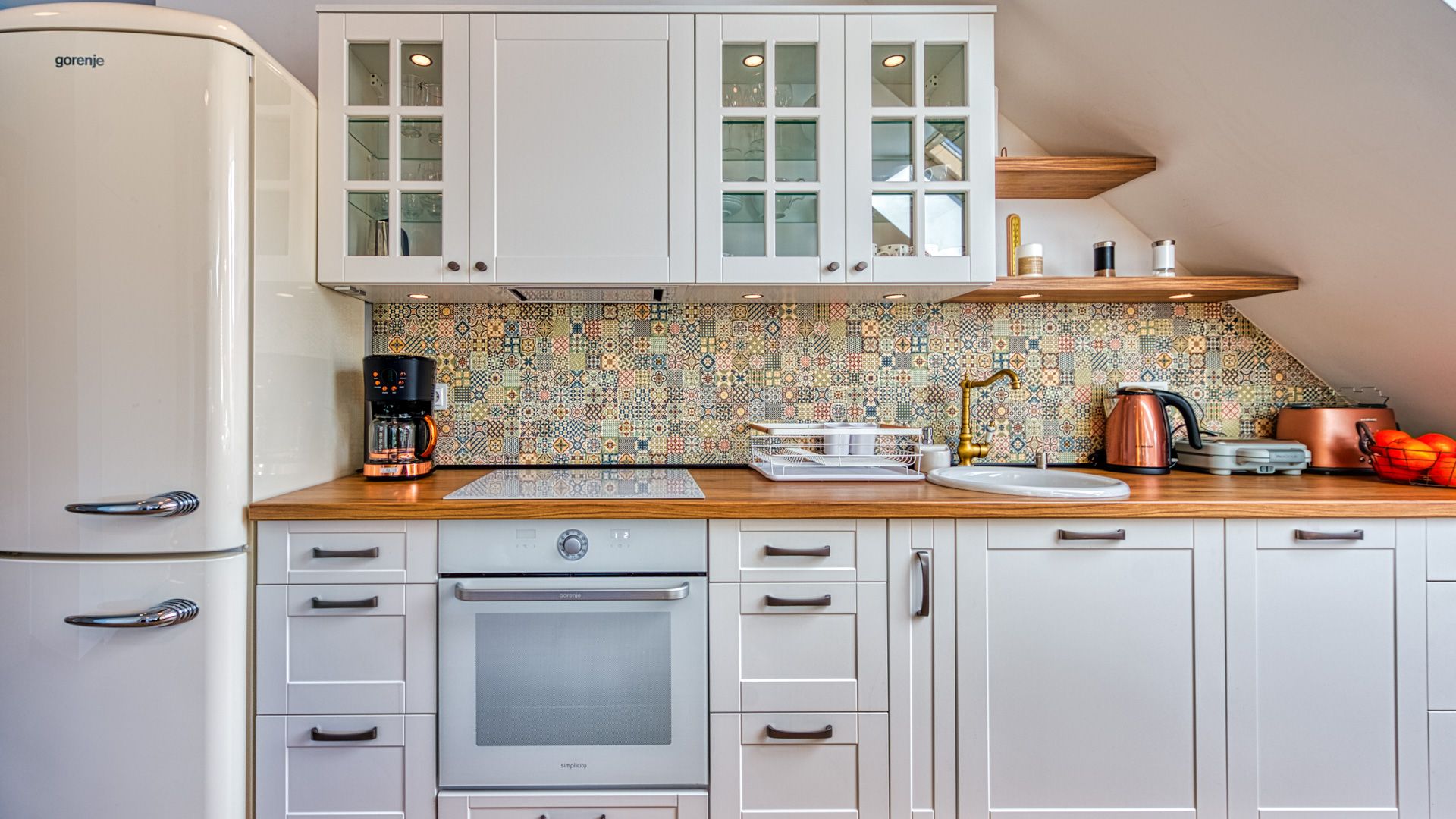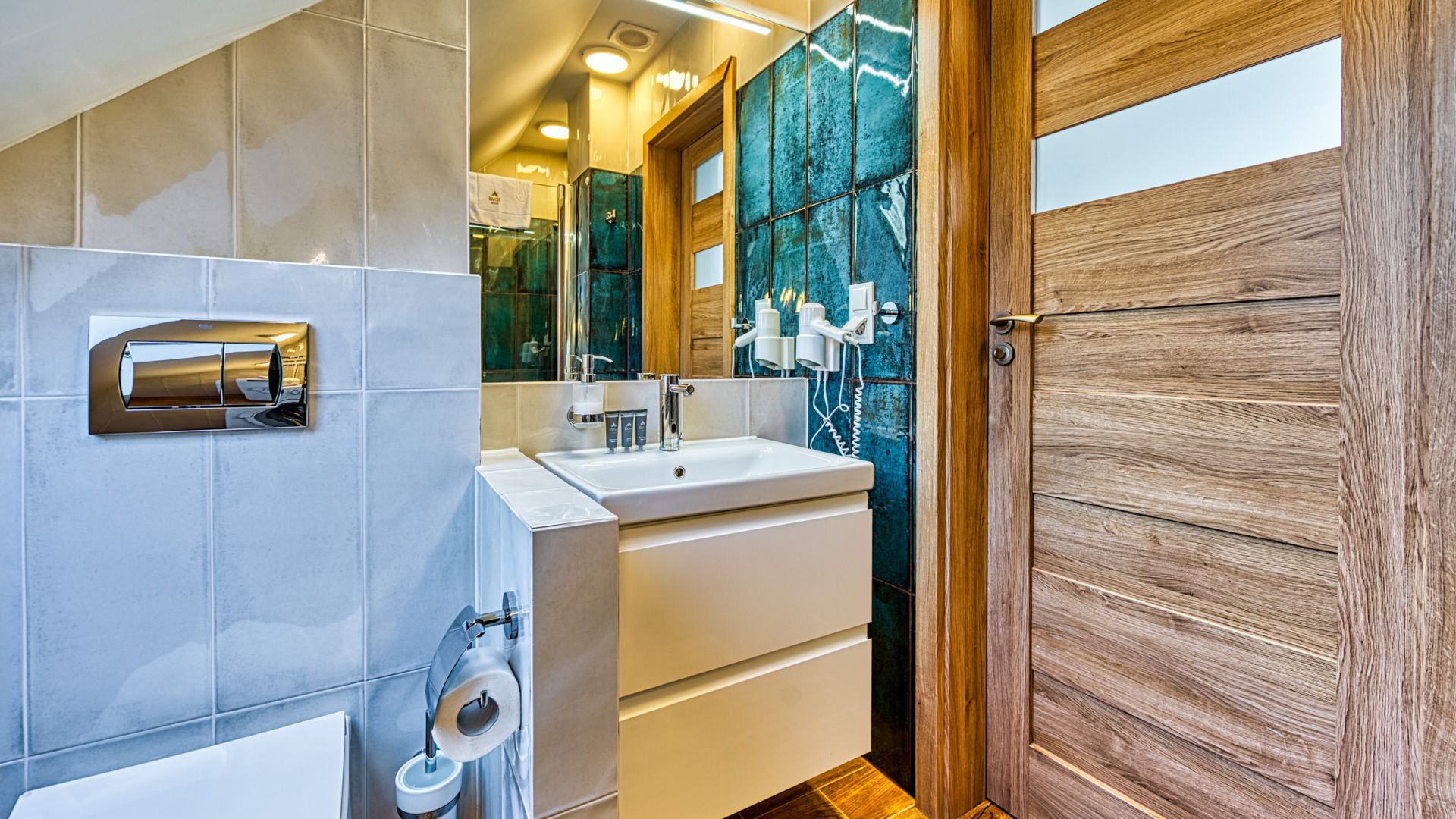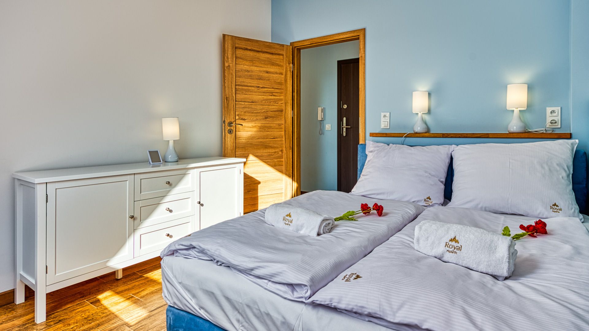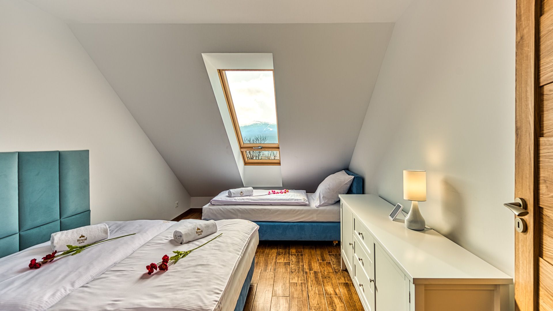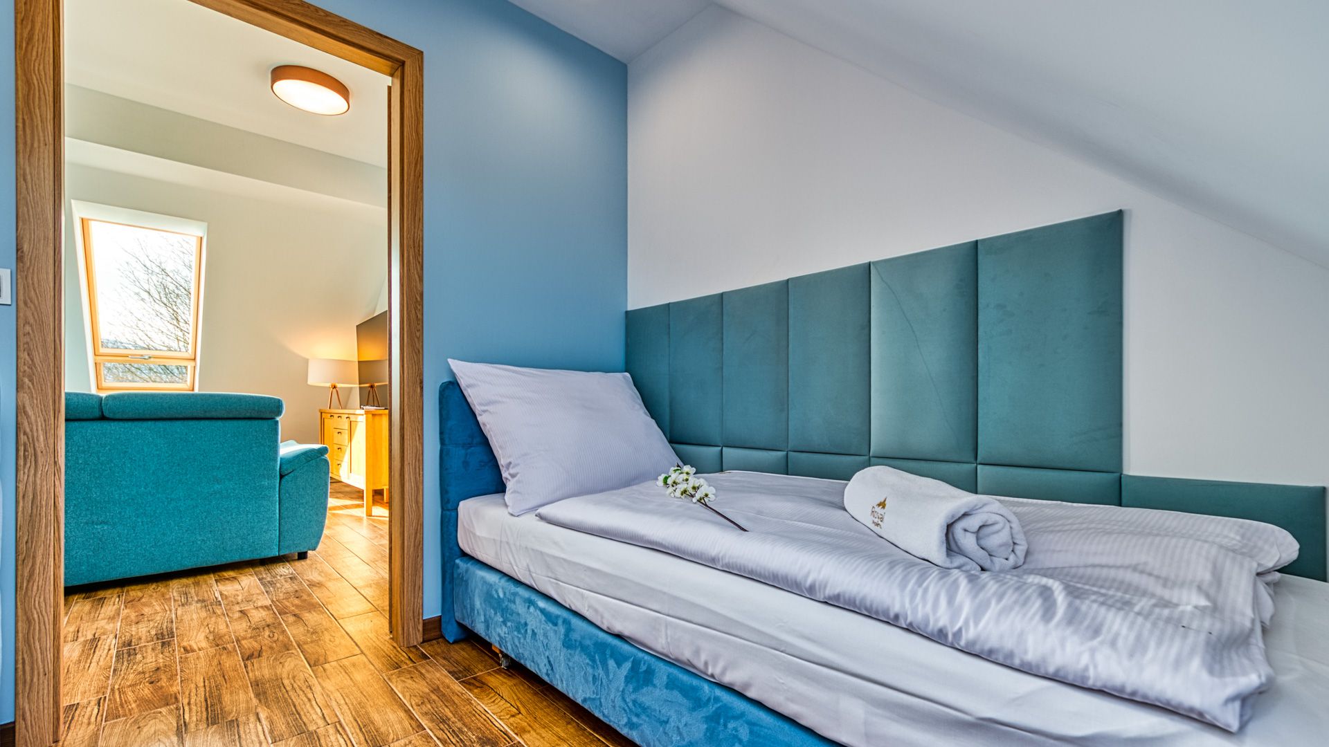 Prezentowany lokal ma powierzchnię 50m^2 i zapewni komfortowy wypoczynek siedmiu osobom. Składa się z dwóch sypialni zawierających łącznie pięć pojedynczych łóżek, części dziennej, połączonej z aneksem kuchennym oraz łazienki z prysznicem i pralką. Sam aneks kuchenny zawiera w sobie niezbędne do przygotowania smacznego posiłku sprzęty. Znajdziemy w nim m.in. płytę grzewczą, czajnik, talerze i sztućce, lodówkę, ekspres do kawy, opiekacz/toster i zmywarkę.