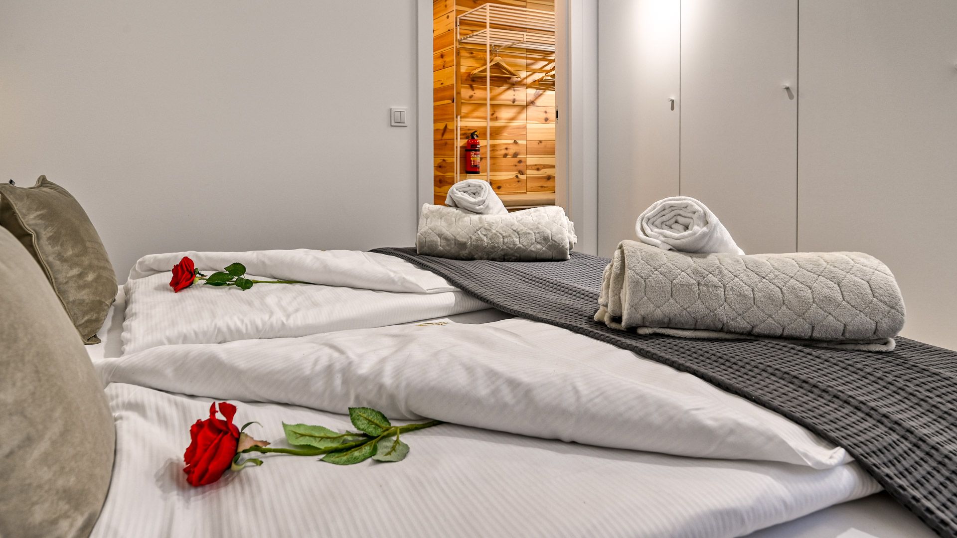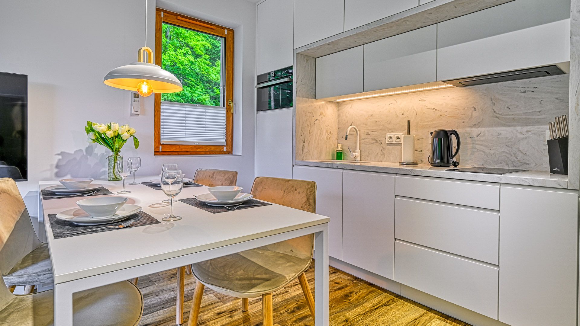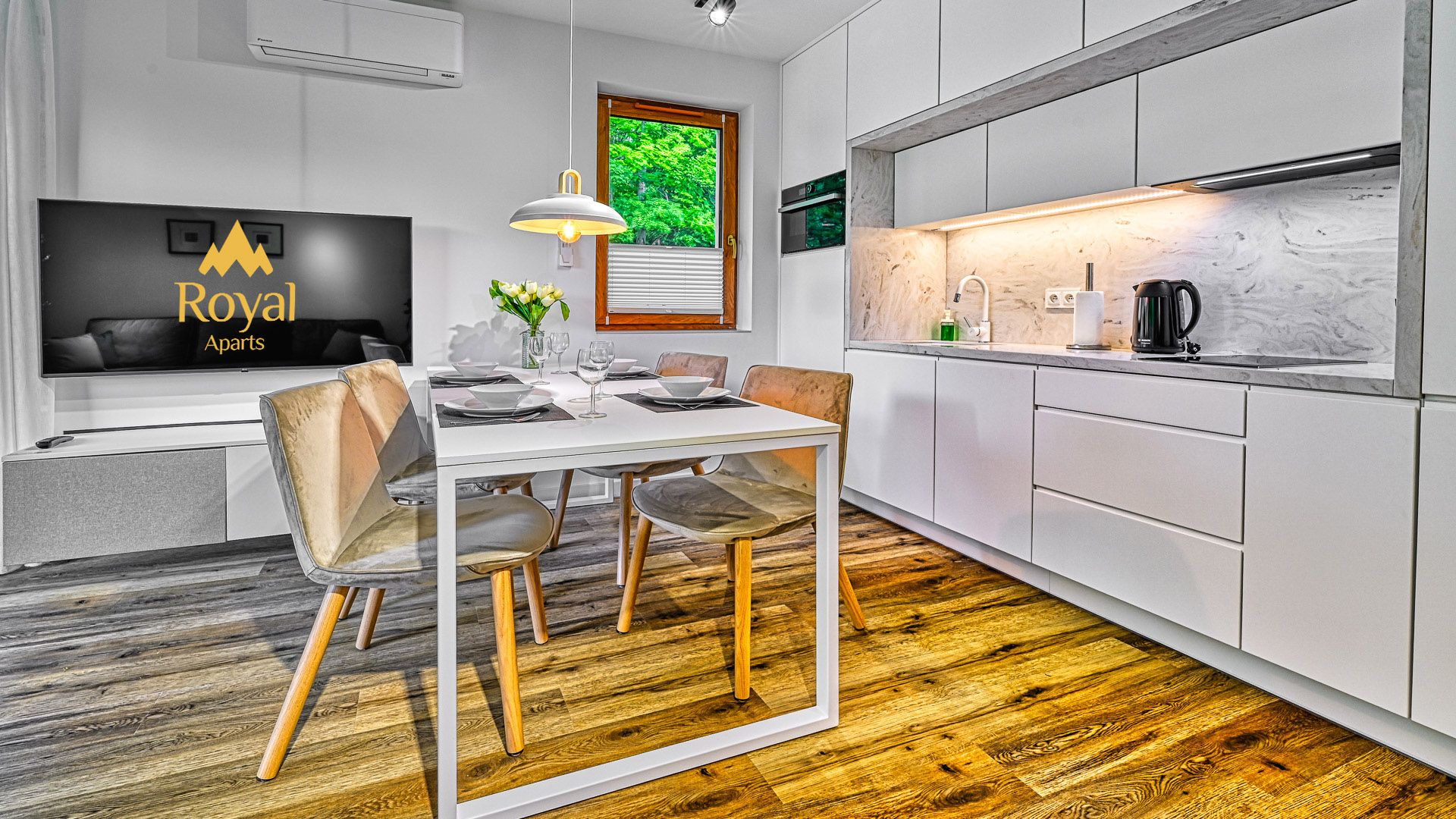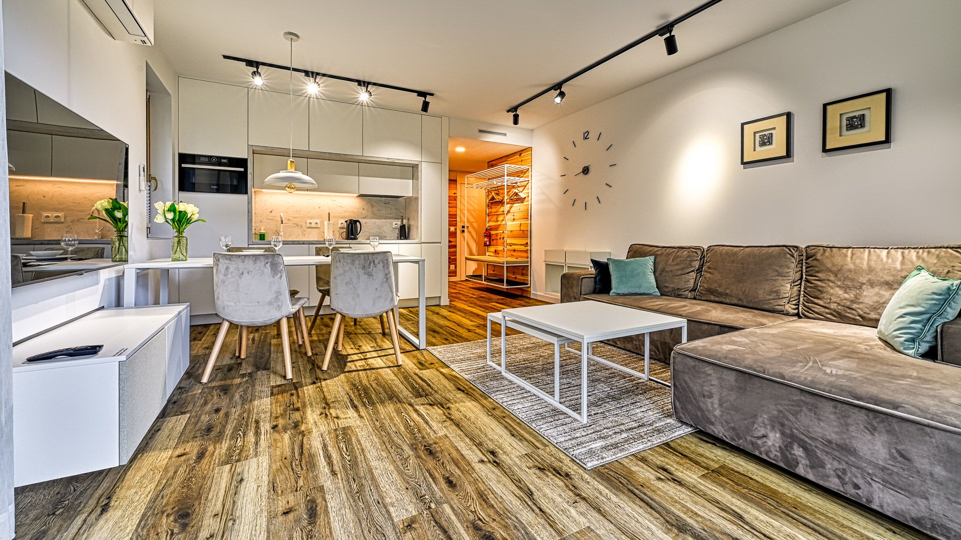 Prezentowany lokal ma powierzchnię 45m^2 i zapewni komfortowy wypoczynek nawet czterem osobom. Składa się z sypialni z dużym, dwuosobowym łóżkiem, części dziennej, połączonej z aneksem kuchennym oraz łazienki z prysznicem. Sam aneks kuchenny zawiera w sobie niezbędne do przygotowania smacznego posiłku sprzęty. Znajdziemy w nim m.in. płytę grzewczą, czajnik, talerze i sztućce, lodówkę, opiekacz/toster, zmywarkę i mikrofalówkę.