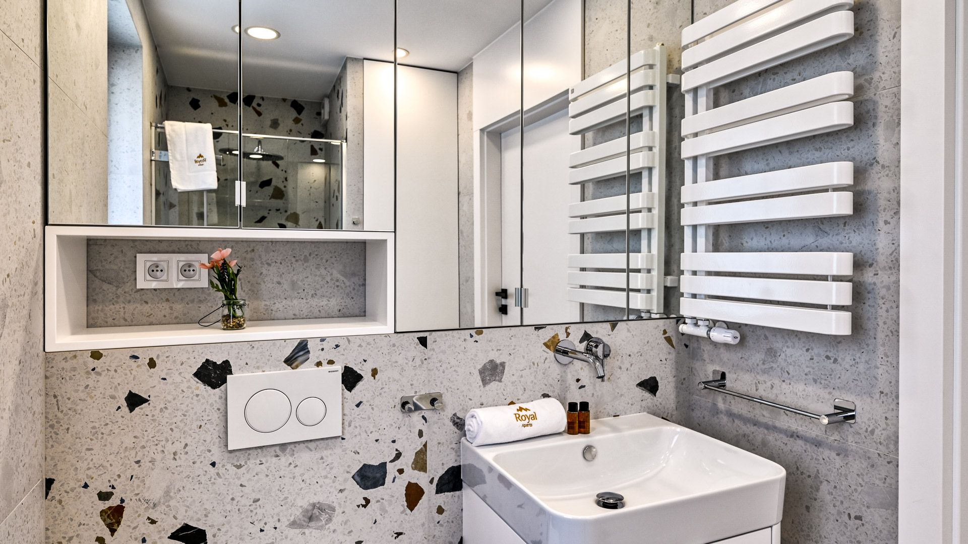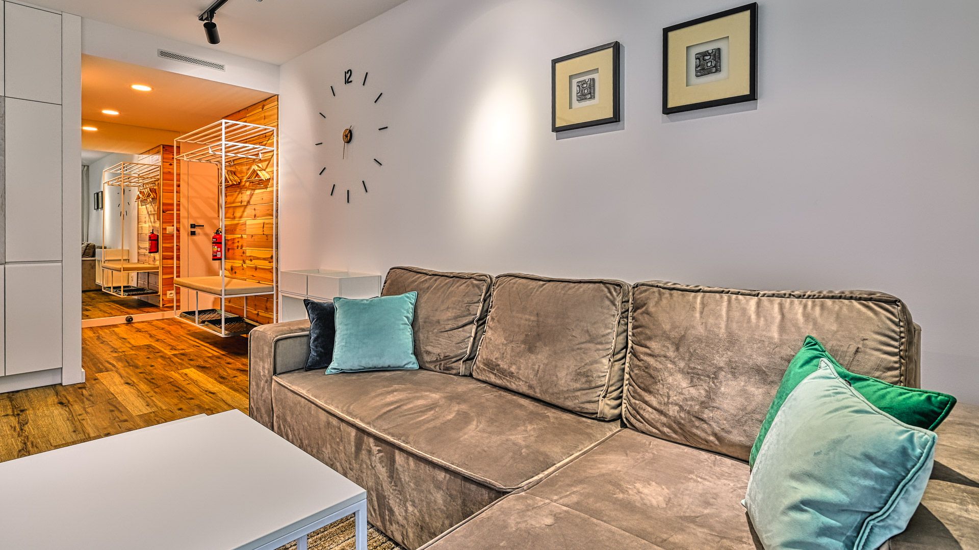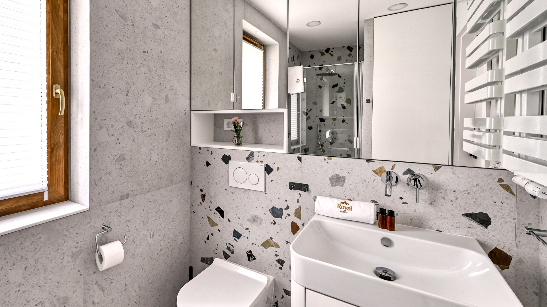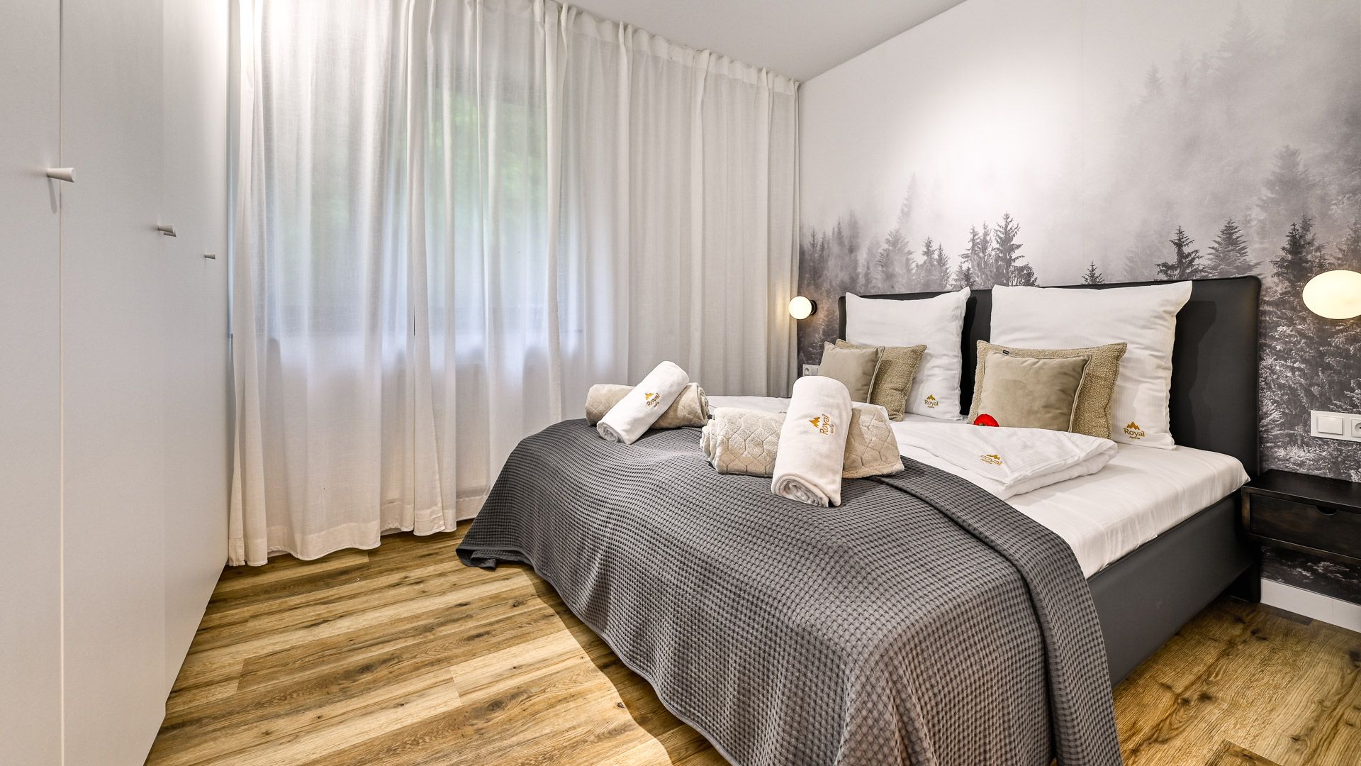Prezentowany lokal ma powierzchnię 45m^2 i zapewni komfortowy wypoczynek nawet czterem osobom. Składa się z sypialni z dużym, dwuosobowym łóżkiem, części dziennej, połączonej z aneksem kuchennym oraz łazienki z prysznicem. Sam aneks kuchenny zawiera w sobie niezbędne do przygotowania smacznego posiłku sprzęty. Znajdziemy w nim m.in. płytę grzewczą, czajnik, talerze i sztućce, lodówkę, opiekacz/toster, zmywarkę i mikrofalówkę.