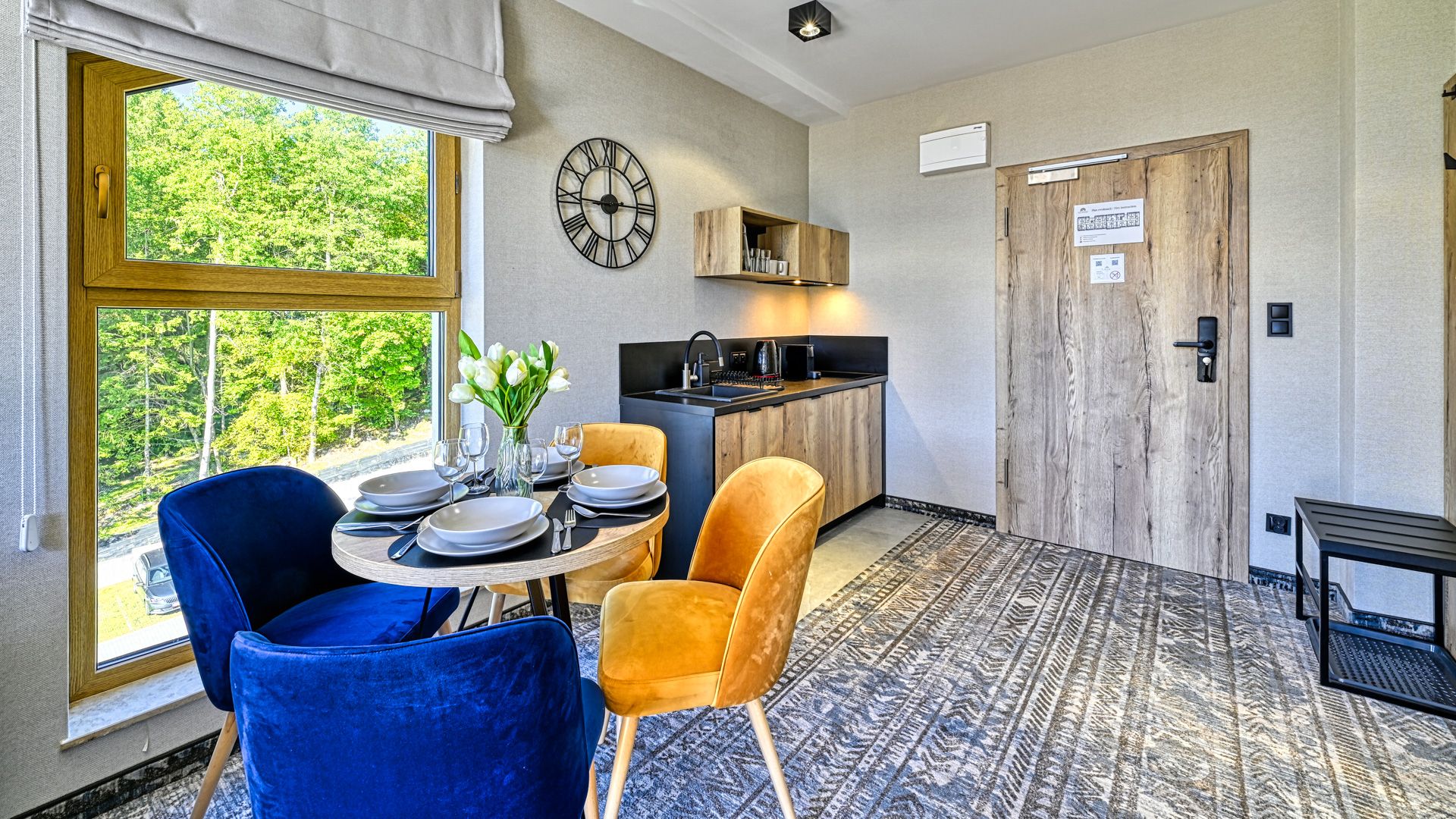 Wnętrze apartamentu zostało zaprojektowane z myślą o wygodzie i funkcjonalności, a jednocześnie zachwyca stylem i dbałością o detale. Przestronny salon z aneksem kuchennym tworzy przytulną strefę dzienną, w której można odpocząć po dniu pełnym wrażeń. Aneks kuchenny jest w pełni wyposażony – znajdziecie tu nowoczesną lodówkę, płytę grzewczą, czajnik elektryczny oraz kompletny zestaw naczyń, co pozwoli na swobodne przygotowanie ulubionych posiłków.