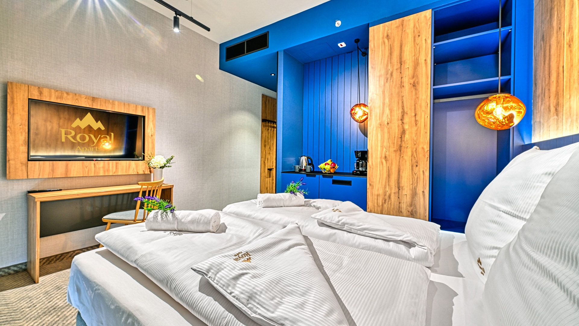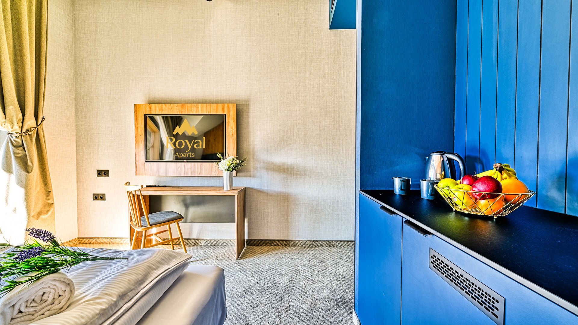 Apartament oferuje wygodne łóżko podwójne, a także dostęp do bezpłatnego Wi-Fi, klimatyzacji i ogrzewania, co zapewnia komfort przez cały rok. Z prywatnego balkonu można cieszyć się górskim pejzażem i świeżym powietrzem. W apartamencie znajdziesz lodówkę i telewizor, a łazienka została wyposażona w prysznic, szampon i mydło oraz miękkie ręczniki.
